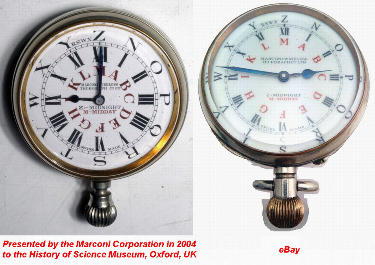Here’s an image which shows the two (I think original) Marconi Morse watches I know of so far, one in the Museum of Science (as shown above) next to the Bonhams watch: