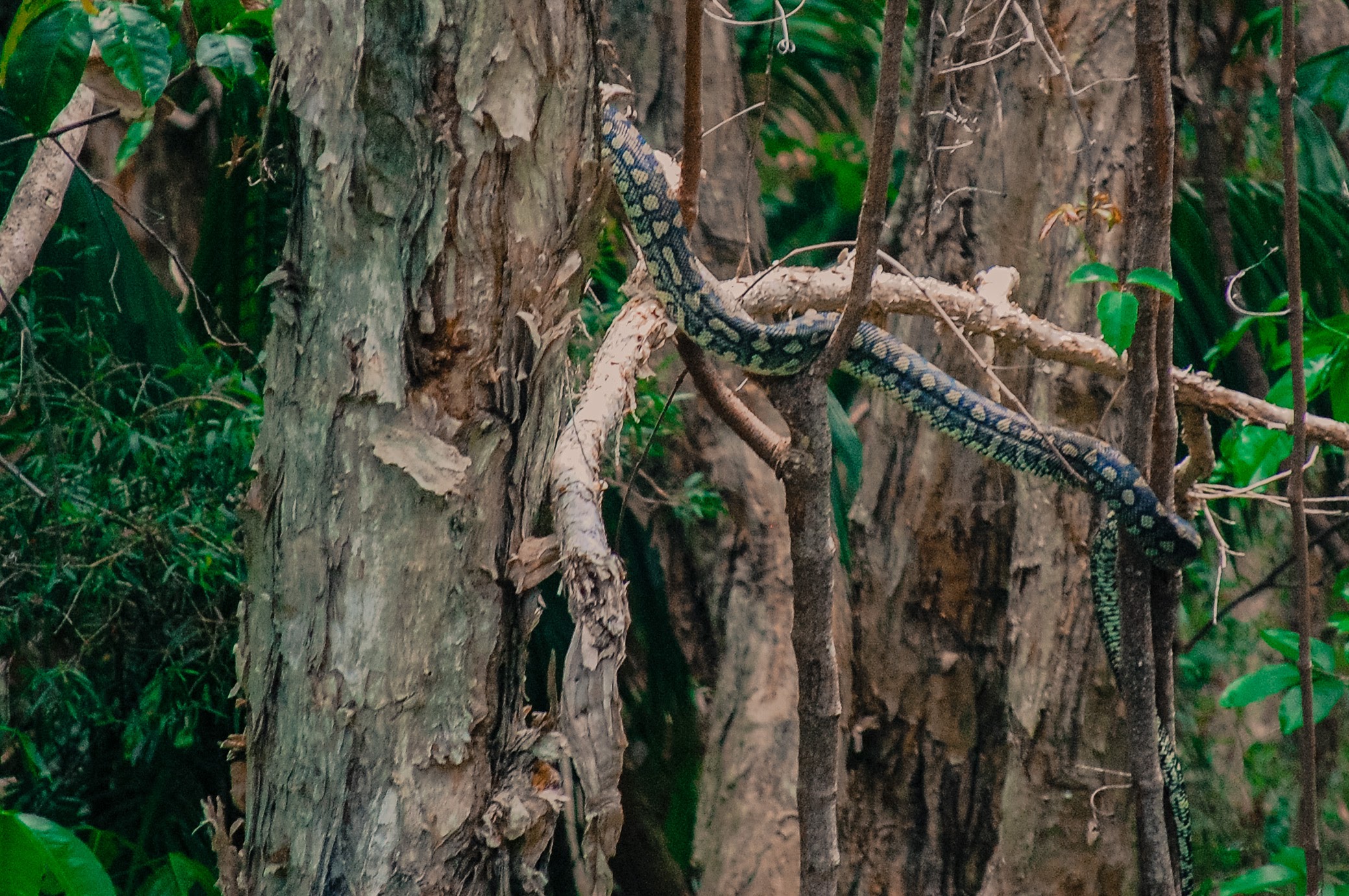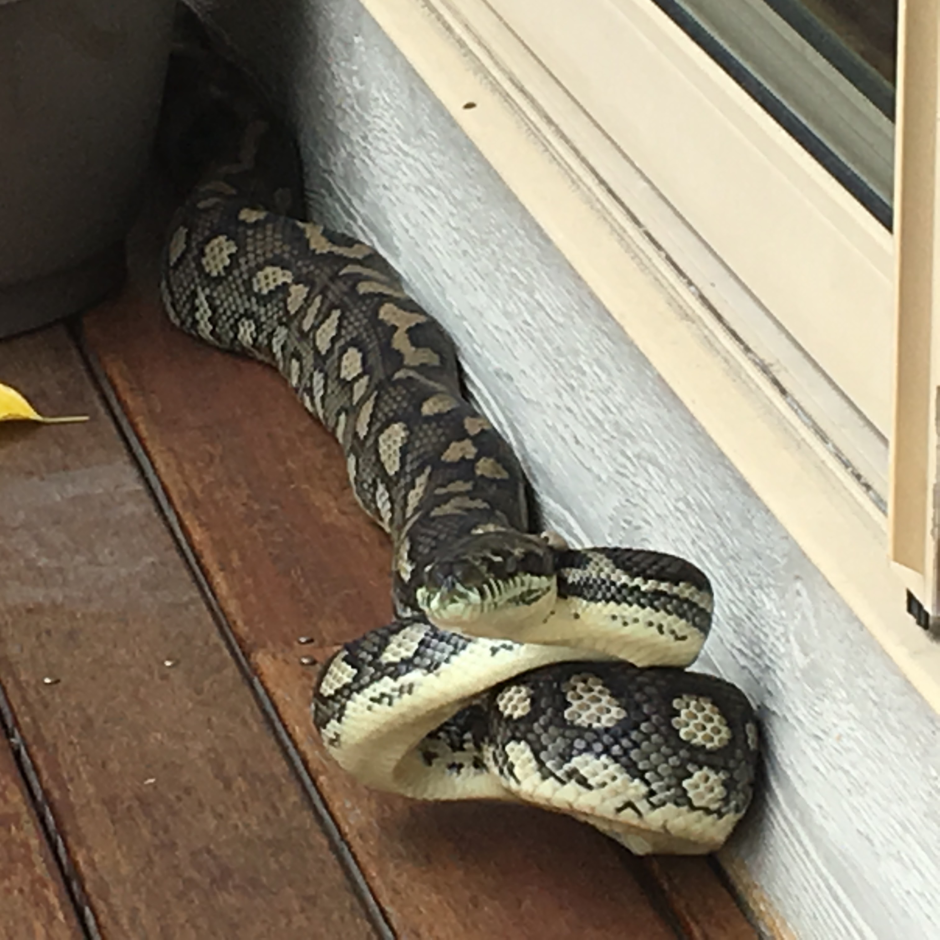 We had a carpet python climb onto our balcony & try to eat our Maltese terrier cross. Our other dog headed it off while I did my best impression of someone who knew what they were doing, and used a broom to push it back off the balcony & into the rainforest down the back. It was at least 2 1/2 meters long. Here are a few shots: