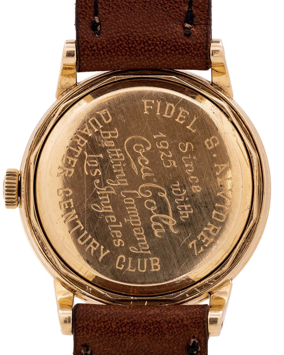 The caseback engraving is noteworthy in its detail and fine execution. It reads in block print wrapping around the upper perimeter the recipient’s name “Fidel S Alivdrez”, and around the bottom “Quarter Century Club” and in beautiful hand engraved script “Since 1925 with Coca Cola Bottling Company Los Angeles.” The engraving is sharp and distinct confirming that this watch received limited wear and was treated with great care. This lovely time piece reflects an era when workers served a company for for a lifetime, and the gold watch was a prized recognition of those years of service. The quality of the watch and the detail and workmanship of the engraving convey the significance associated with such longevity of service in this era of our history.