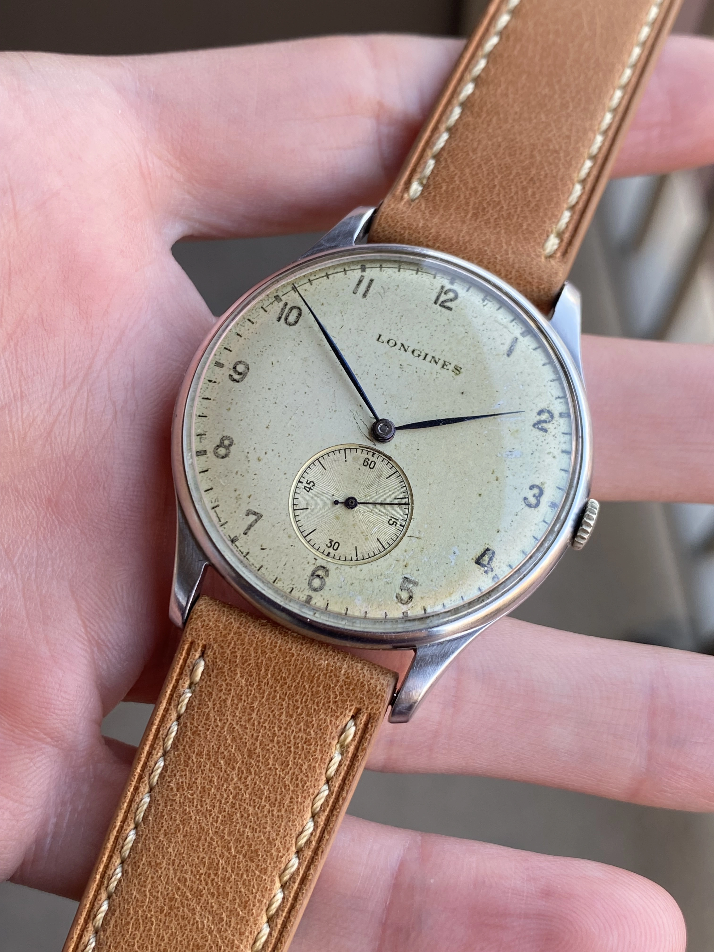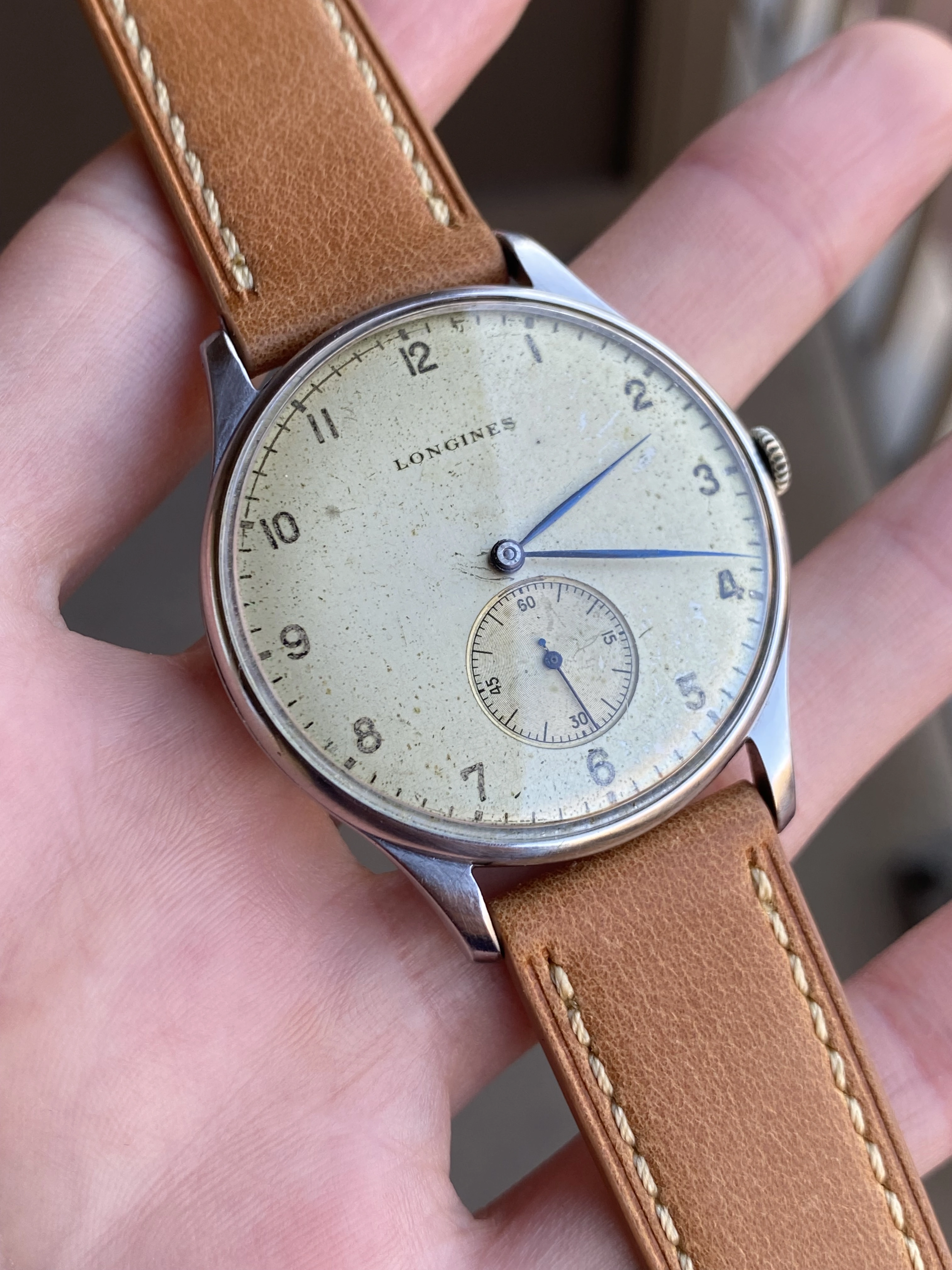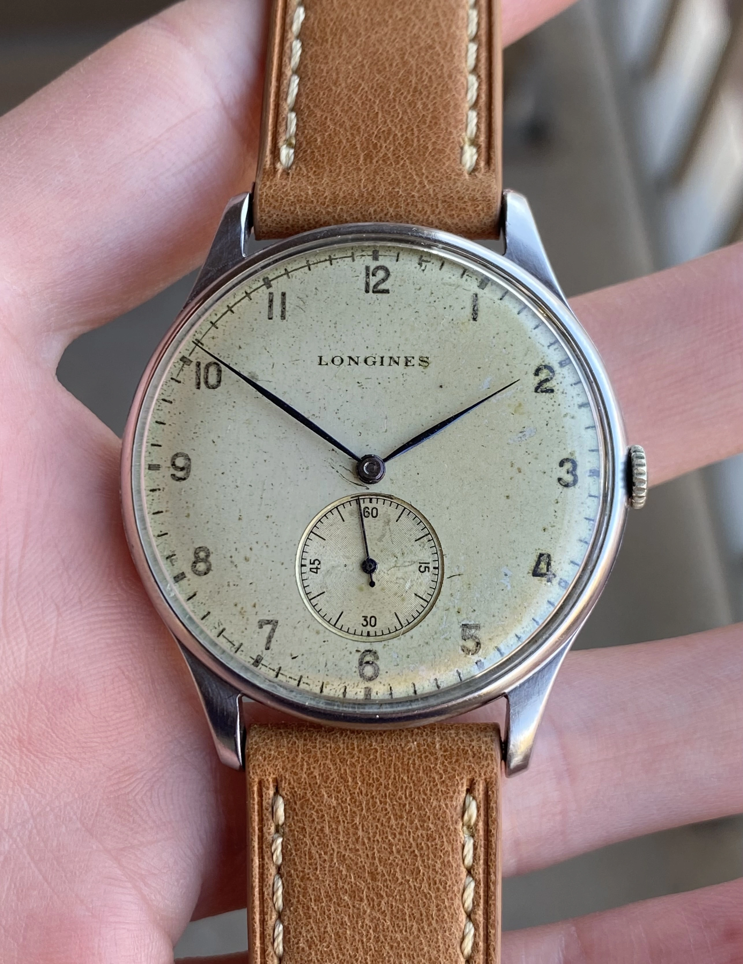 Case: Original 38mm stainless steel case is in nice, seemingly unpolished condition. I believe it is a 5581 reference though I can’t confirm since the ‘40s cases were unmarked and I don’t have the Longines archive. There’s some small damage on the outside of the top-left lug.