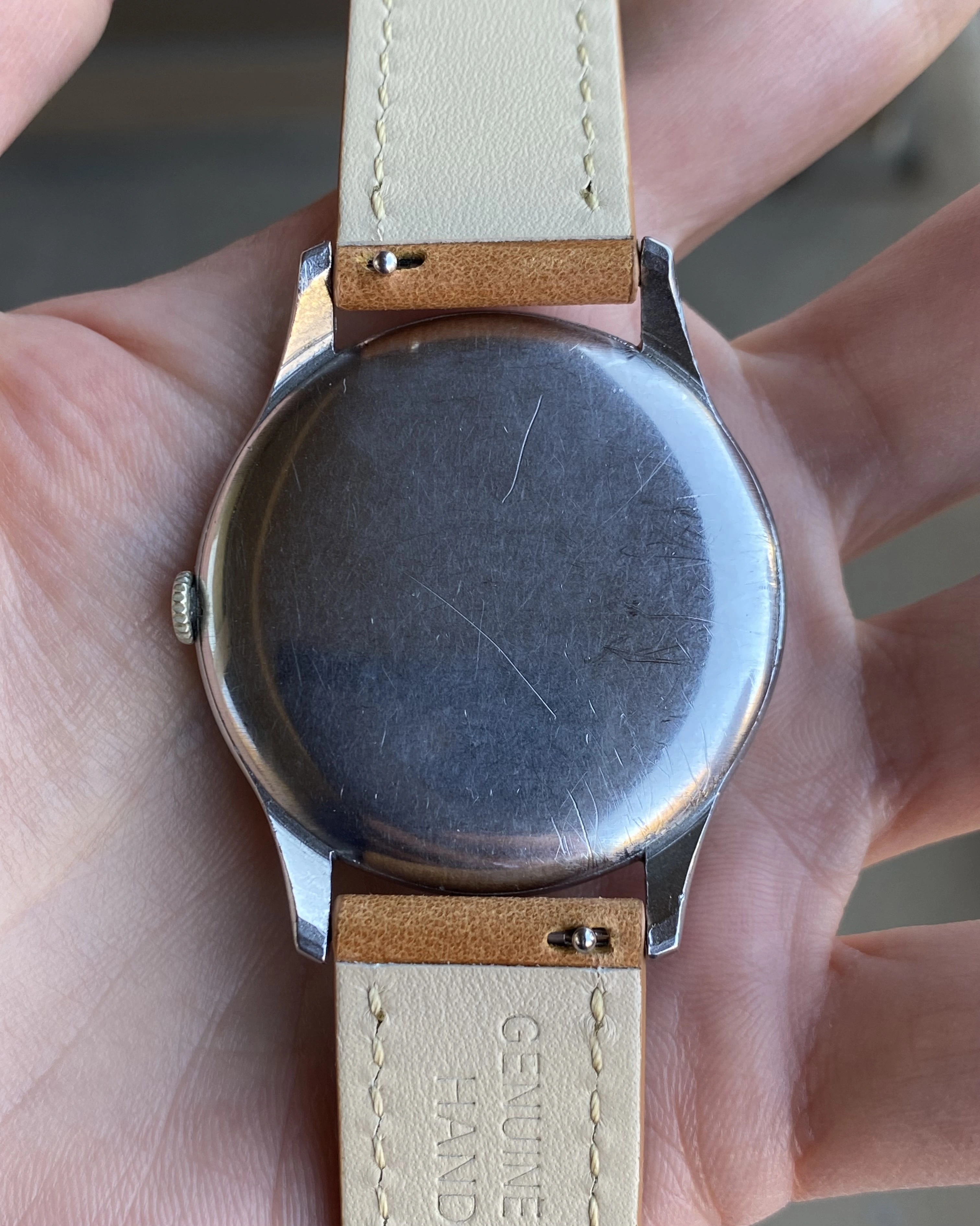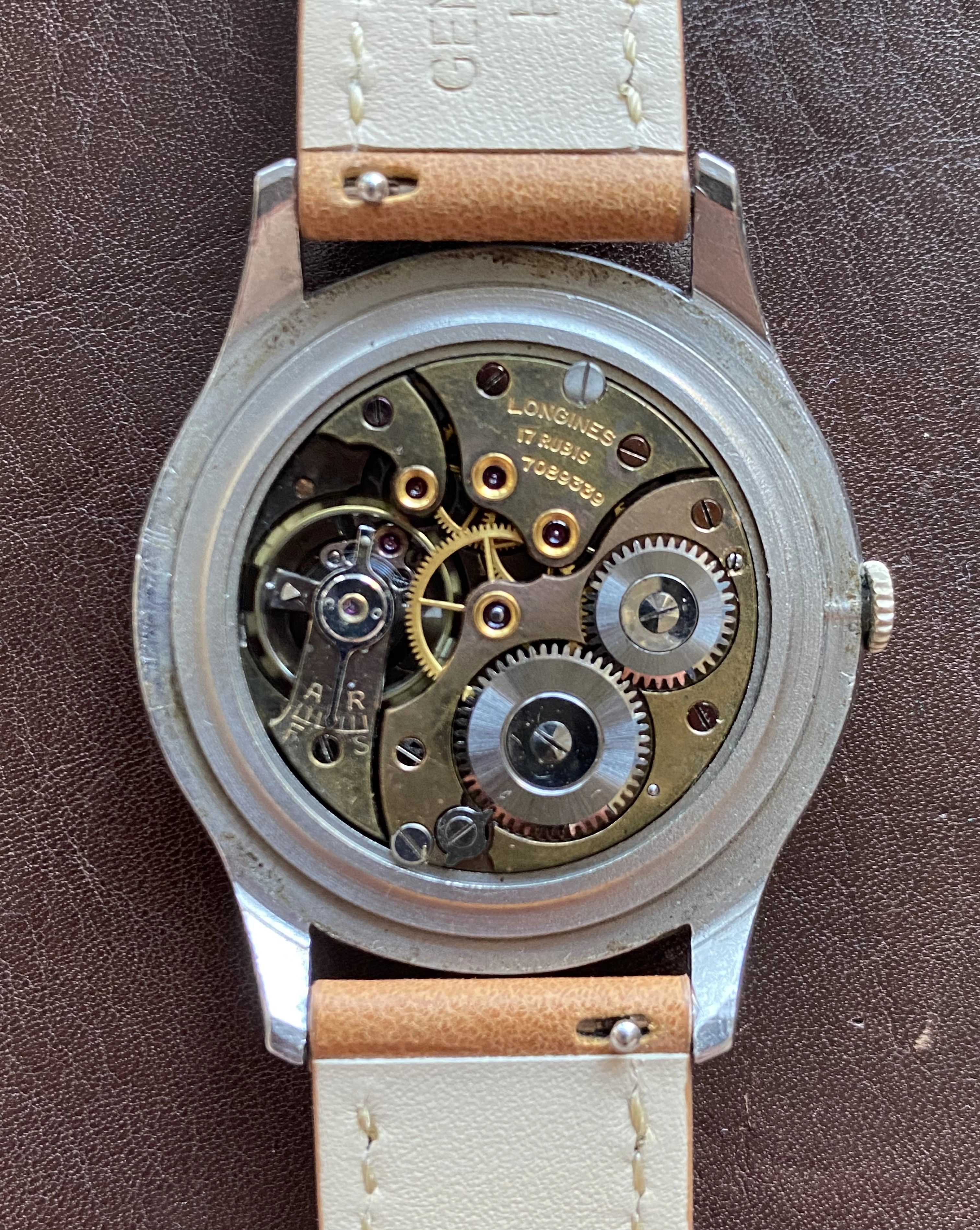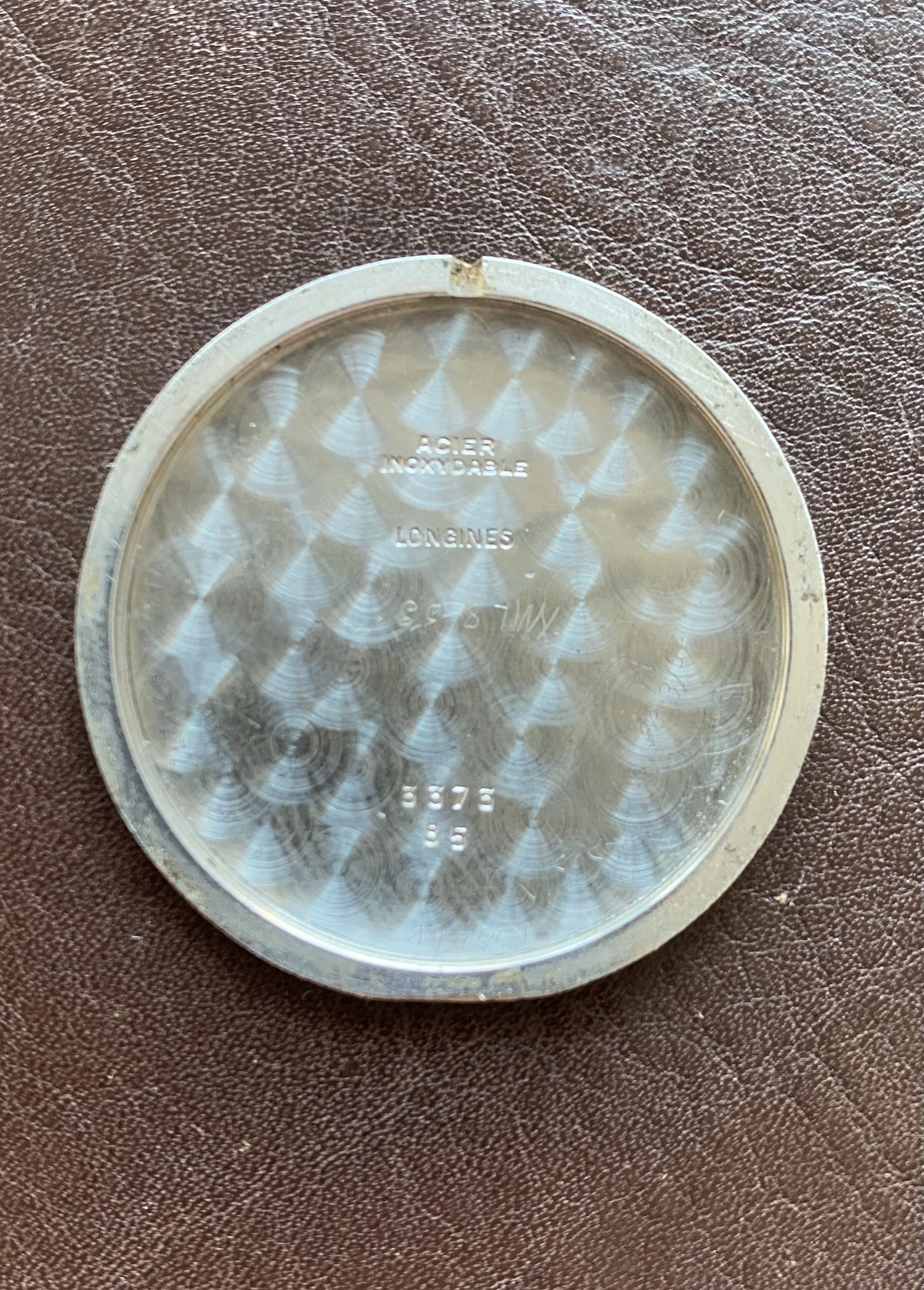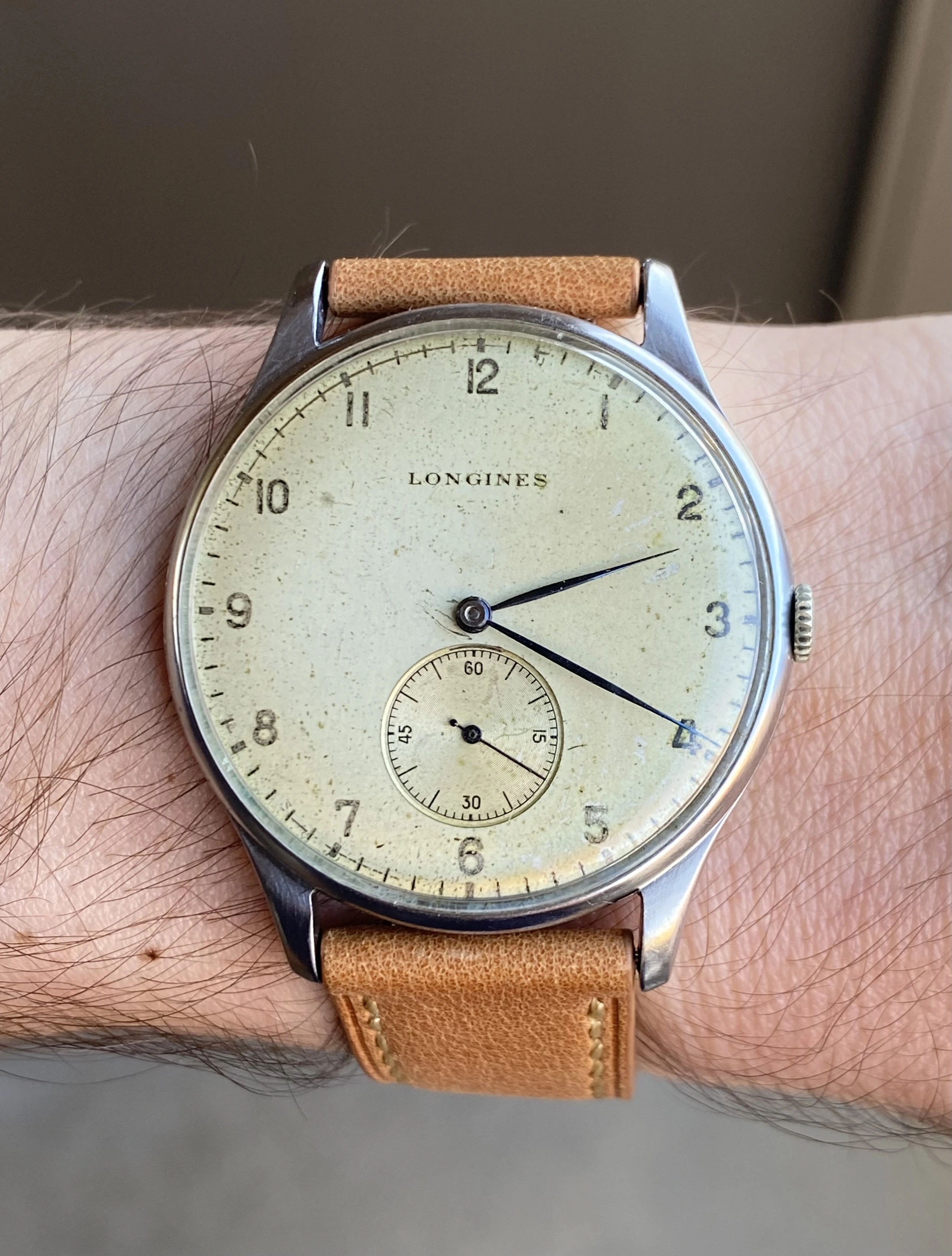 Case: Original 38mm stainless steel case is in nice, seemingly unpolished condition. I believe it is a 5581 reference though I can’t confirm since the ‘40s cases were unmarked and I don’t have the Longines archive. There’s some small damage on the outside of the top-left lug.