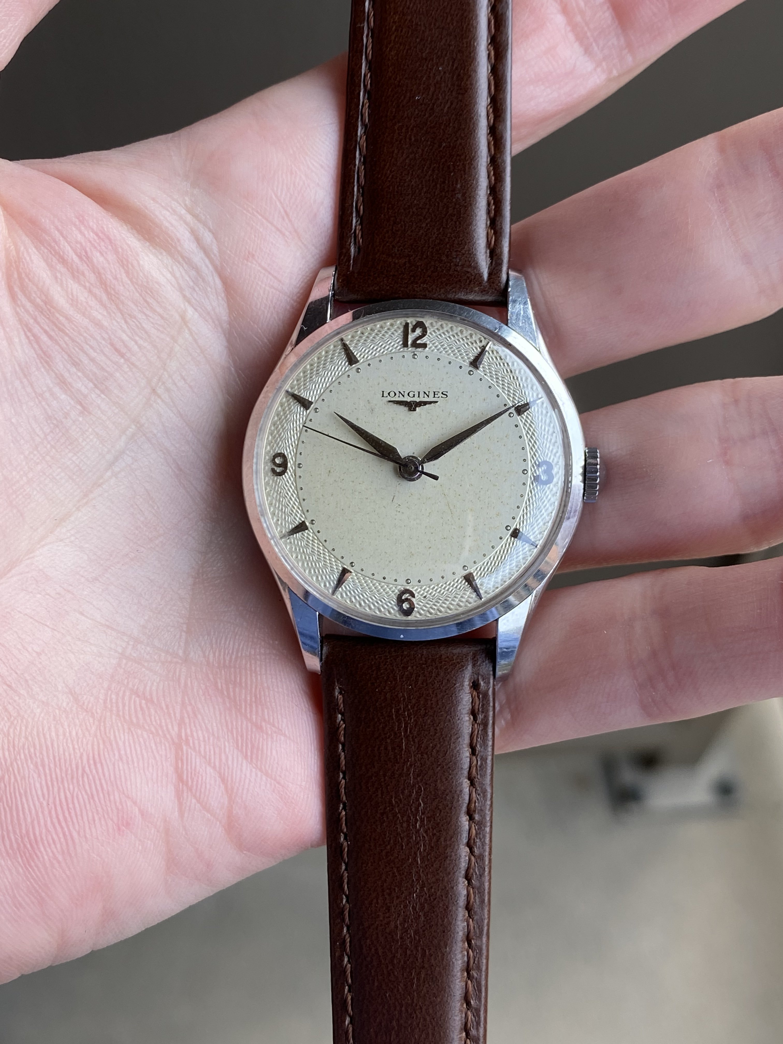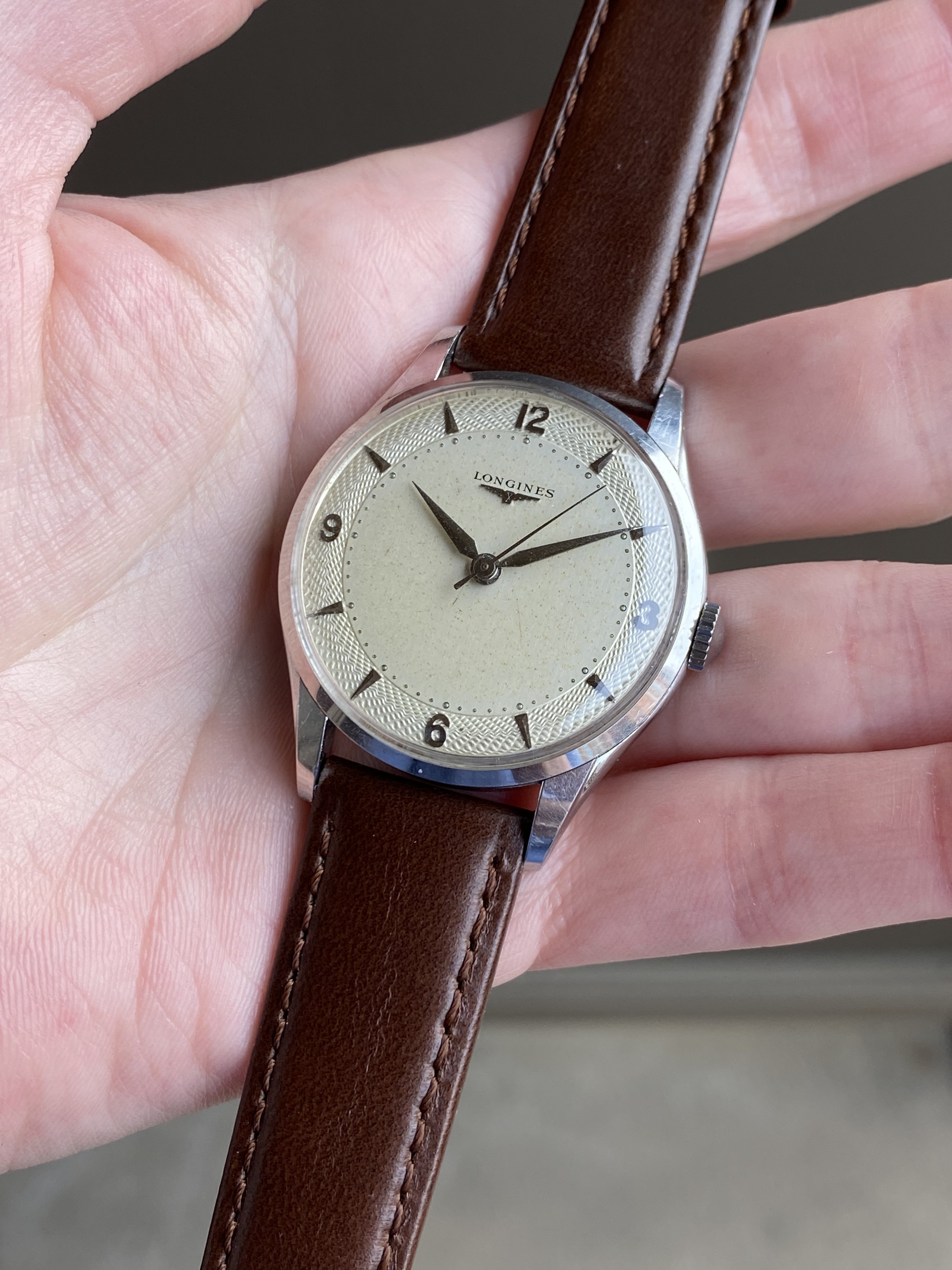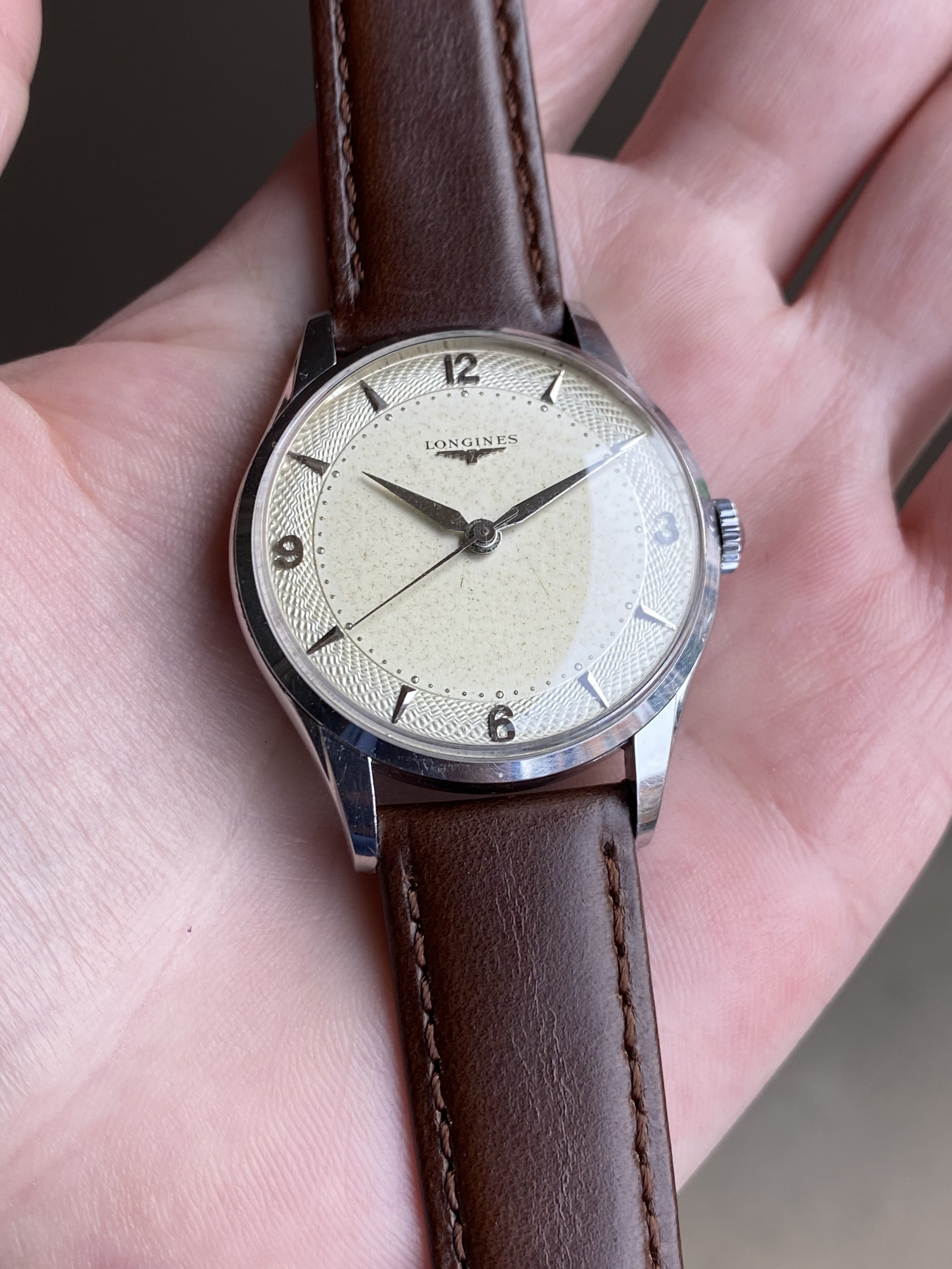 ·Up for sale is a very nice, original, and nicely sized Longines with an uncommon partial textured dial, powered by a 12.68zs movement. According to the Longines archives, the watch was delivered to China in October 1955 (see photo below).
