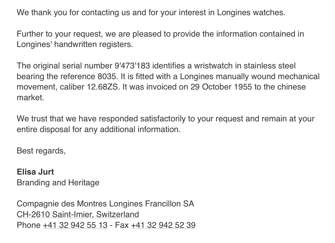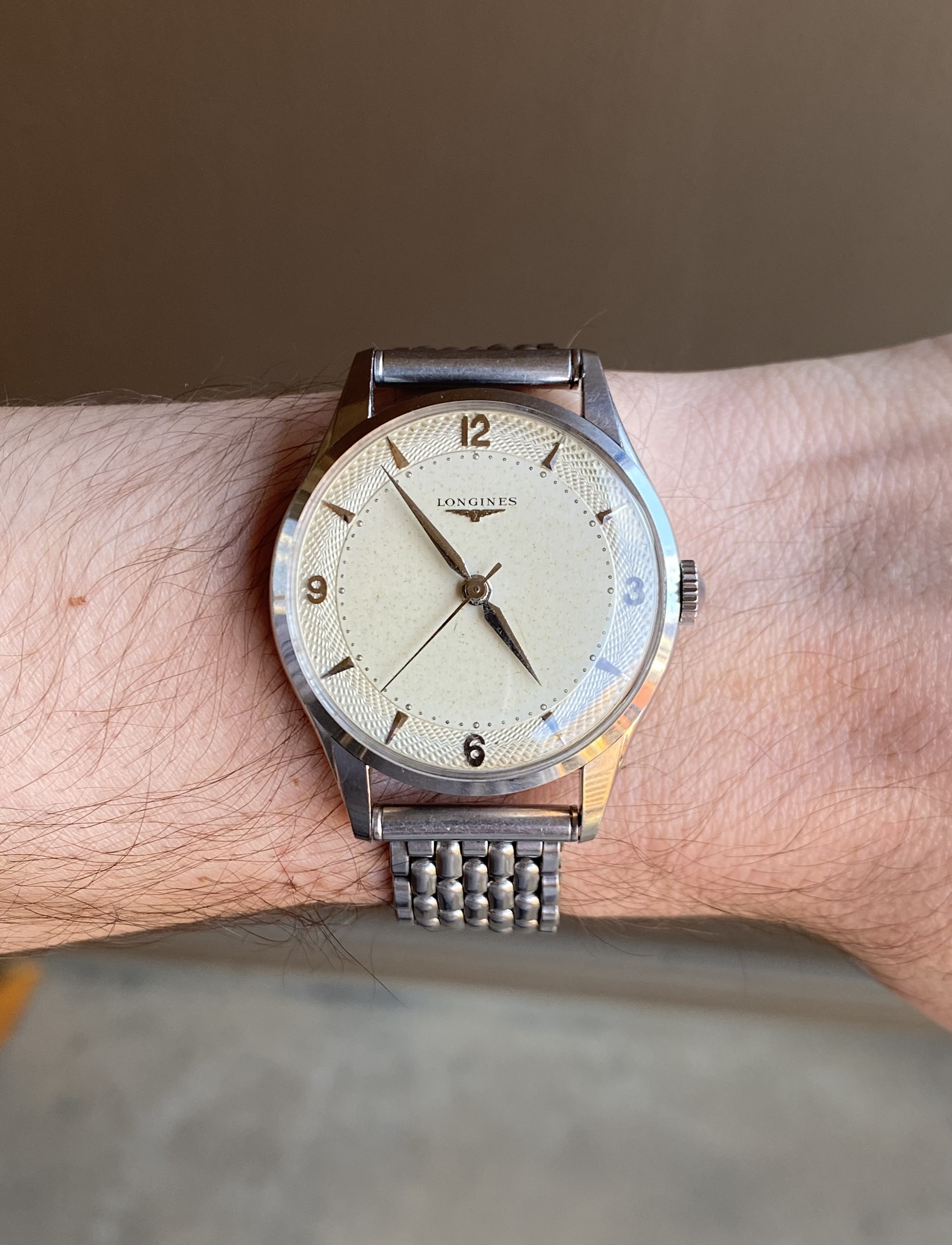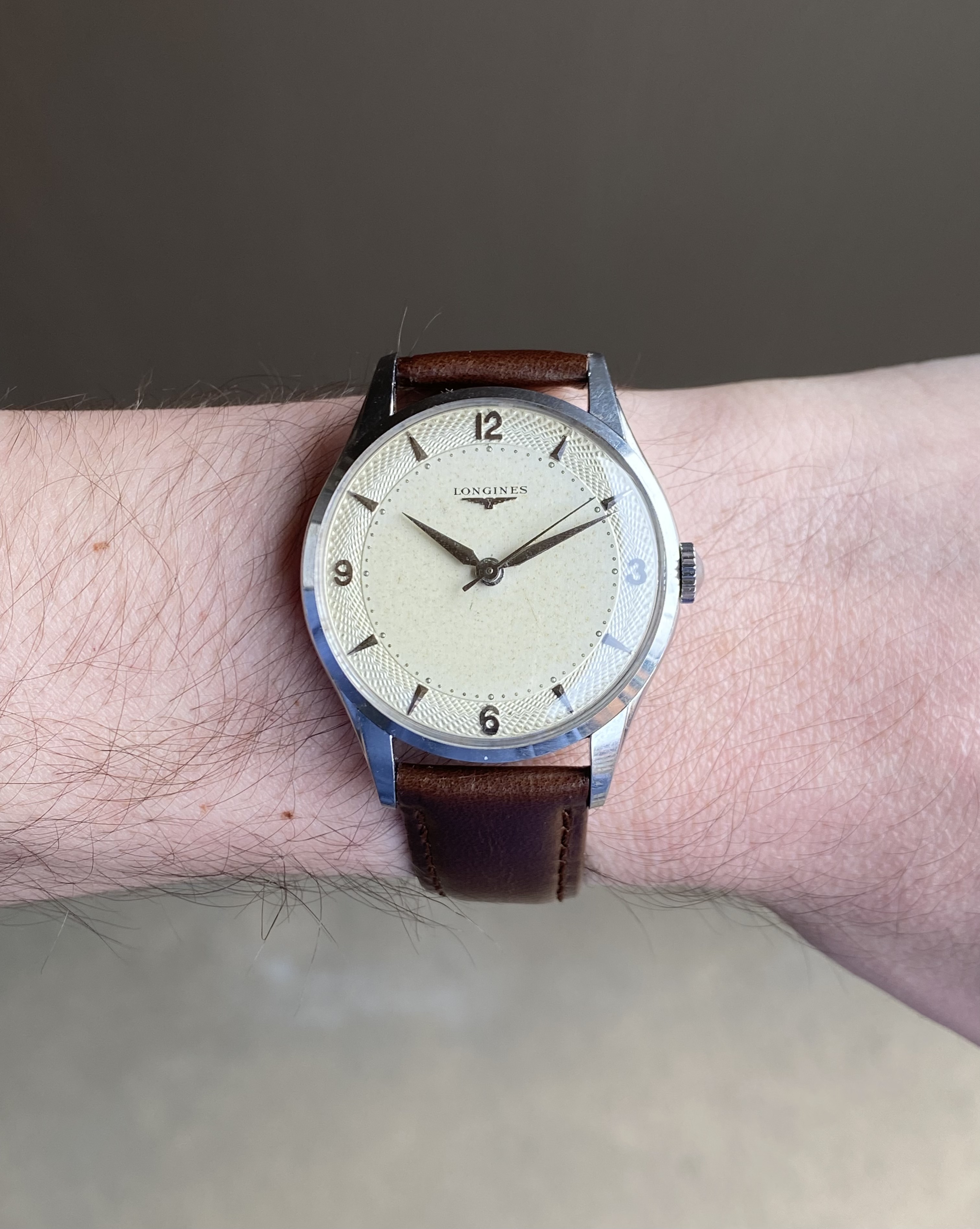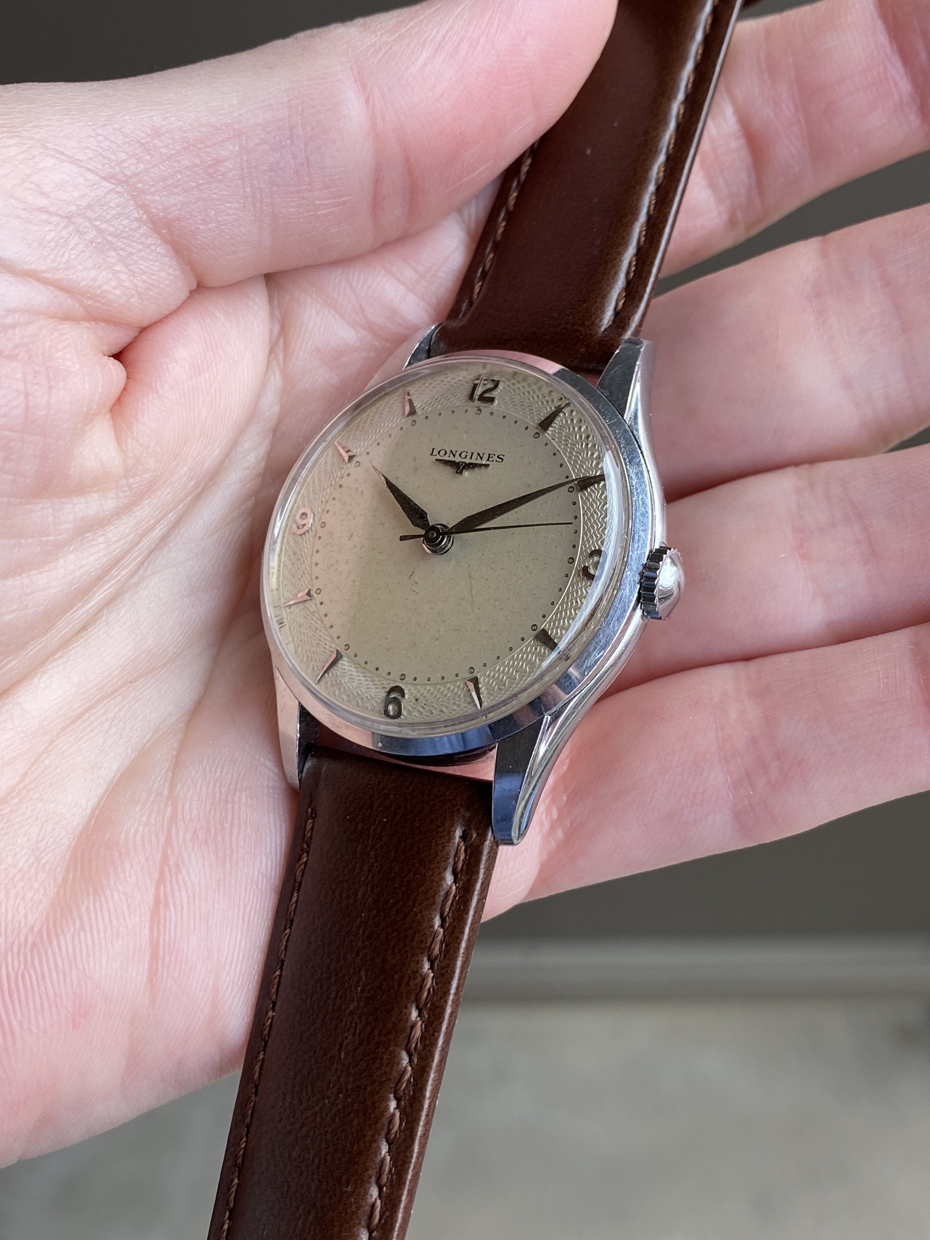 ·Up for sale is a very nice, original, and nicely sized Longines with an uncommon partial textured dial, powered by a 12.68zs movement. According to the Longines archives, the watch was delivered to China in October 1955 (see photo below).