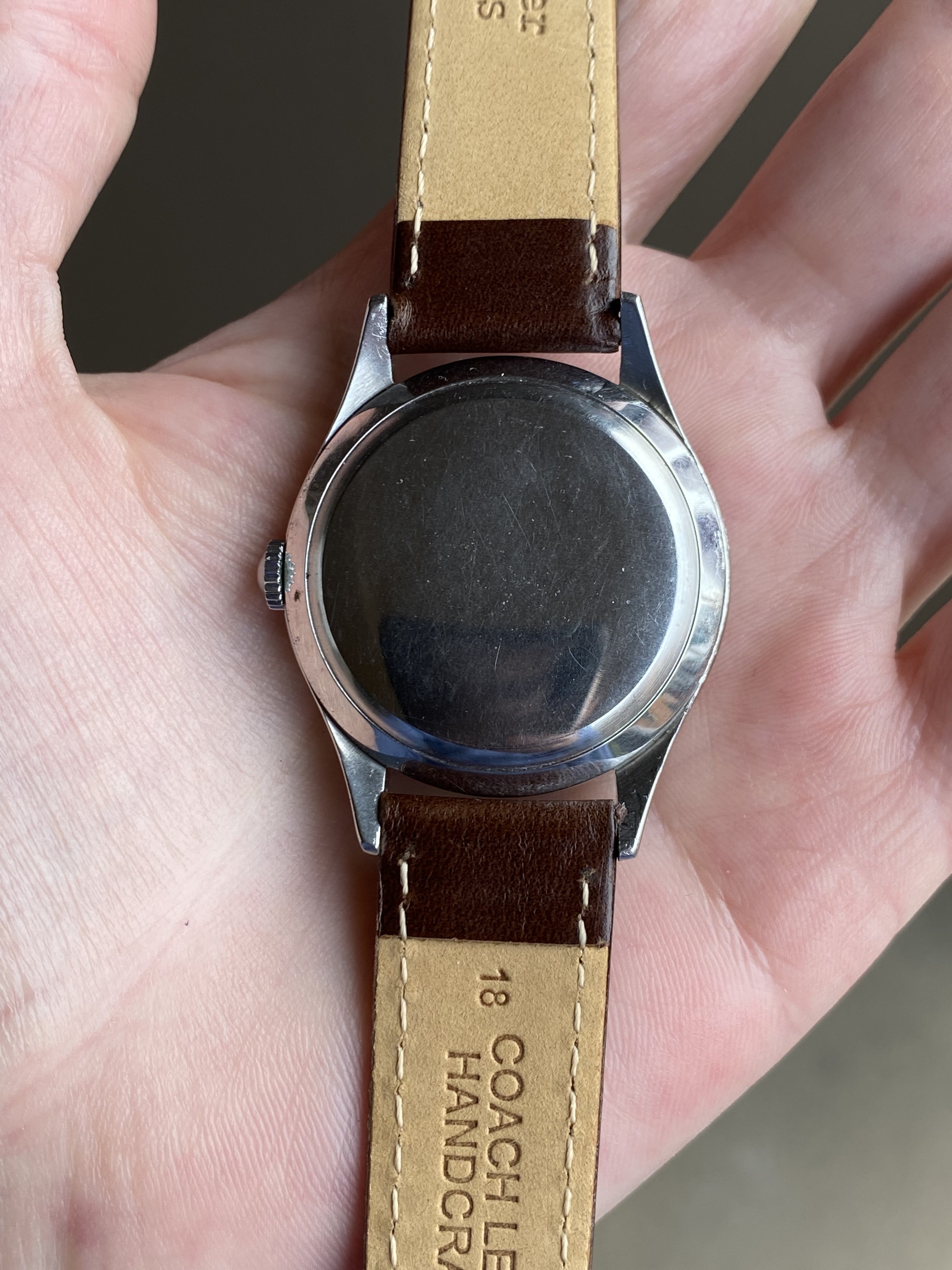 Strap: Comes on the brown DeBeer leather strap and steel buckle pictured. The watch also looks great on a vintage BOR; the one photographed is not available but I may have some similar ones if interested at extra cost.