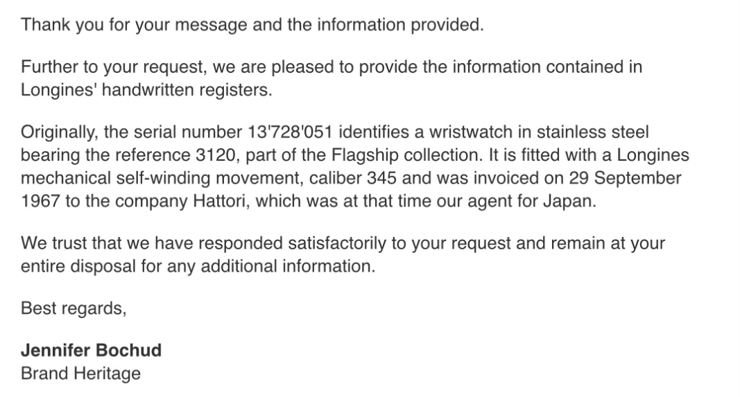 ·Up for sale is a 1967 Longines Flagship automatic 3120 reference. The watch is in nice condition all around and was recently fully serviced by my watchmaker. Longines archive indicates delivery to Japan in September 1967. Please see below for more info, and don’t hesitate to message with questions.