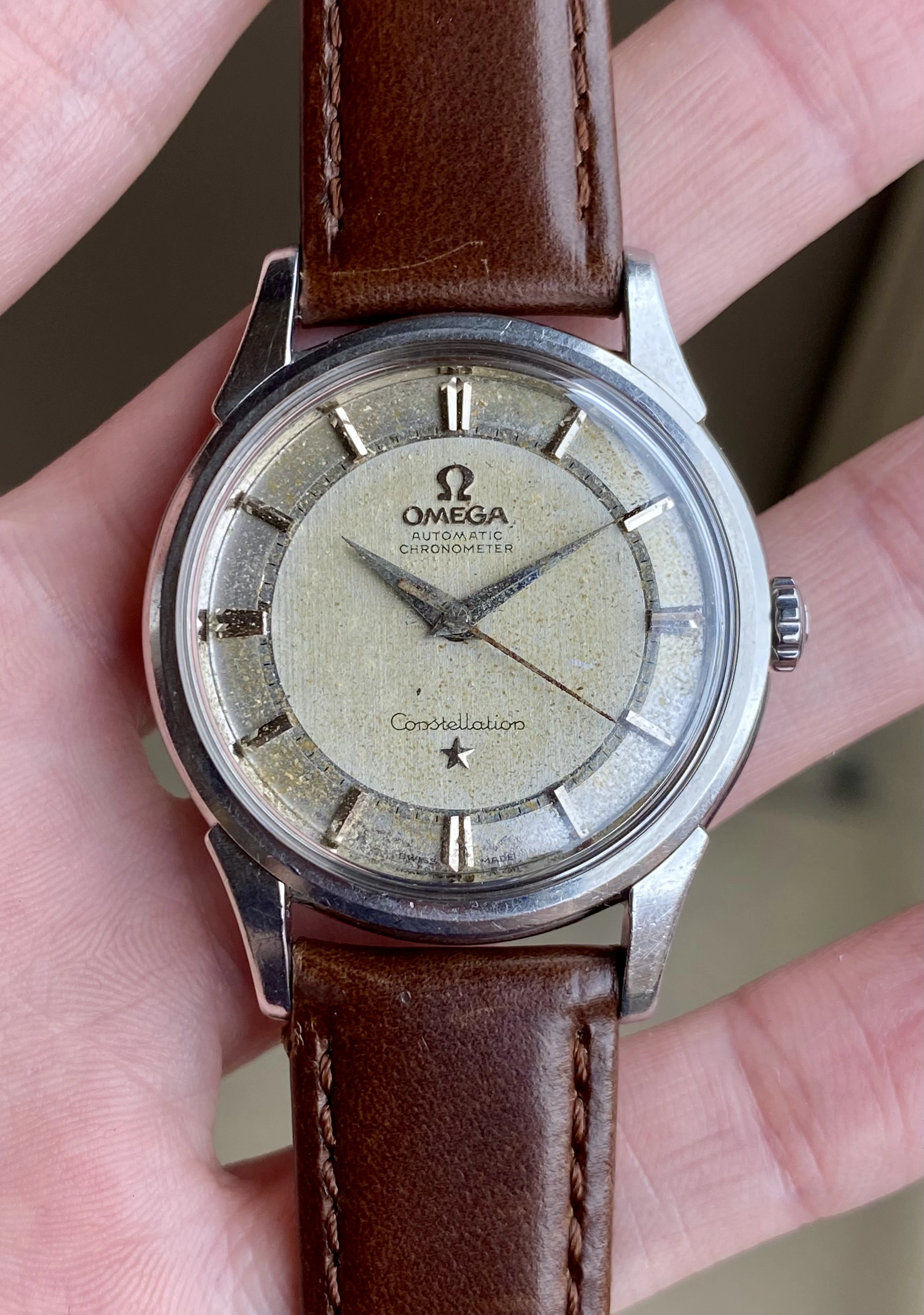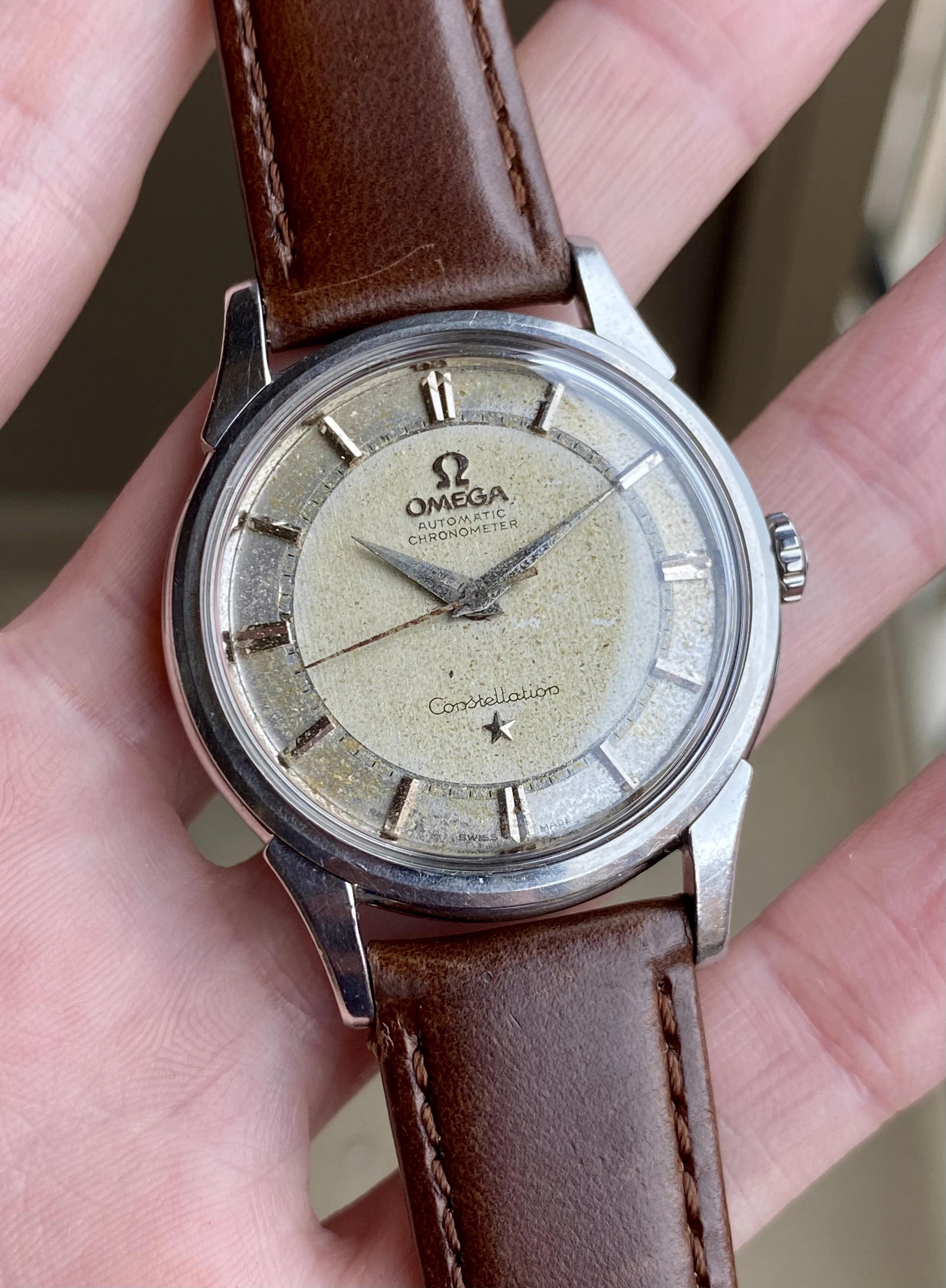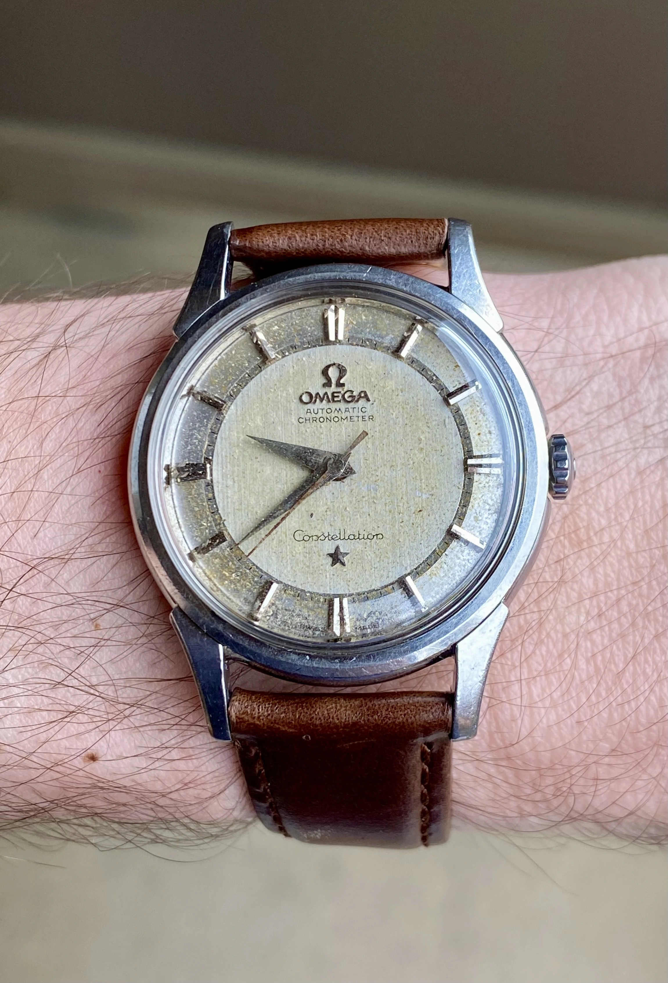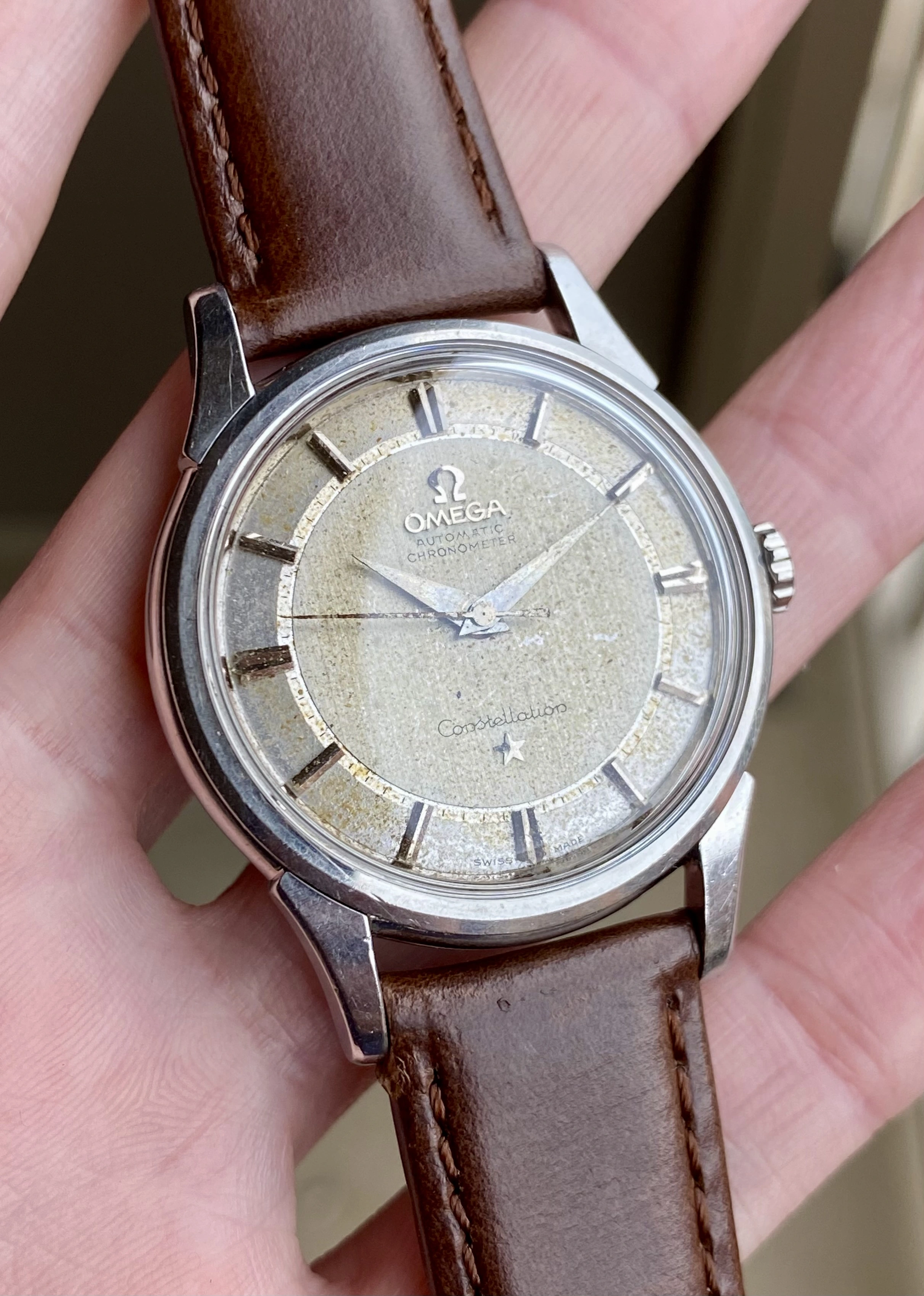 ·Up for sale is an original railtrack dial Omega Constellation. These railtrack dials are much less common than their pie pan siblings, but just as cool - if not cooler. The watch was well-loved with wear throughout the case and with heavy patina on the non-luminous dial. The 1701** serial number movement is a "special chronometer" movement that was part of a consecutive run of 20K movements that received chronometer certification with especially high accuracy. The movement needs service. See below for full details, and don't hesitate to message me with questions.