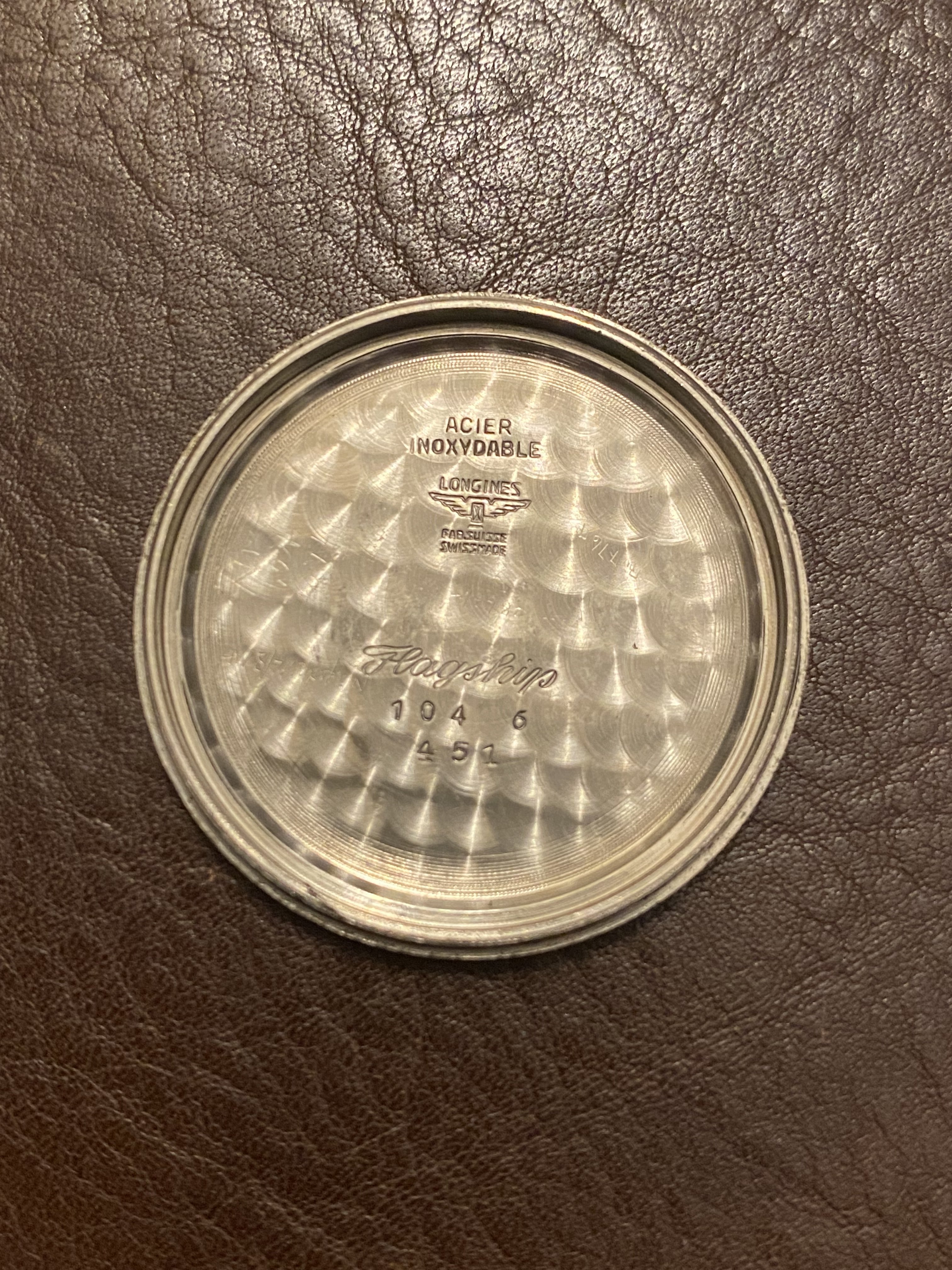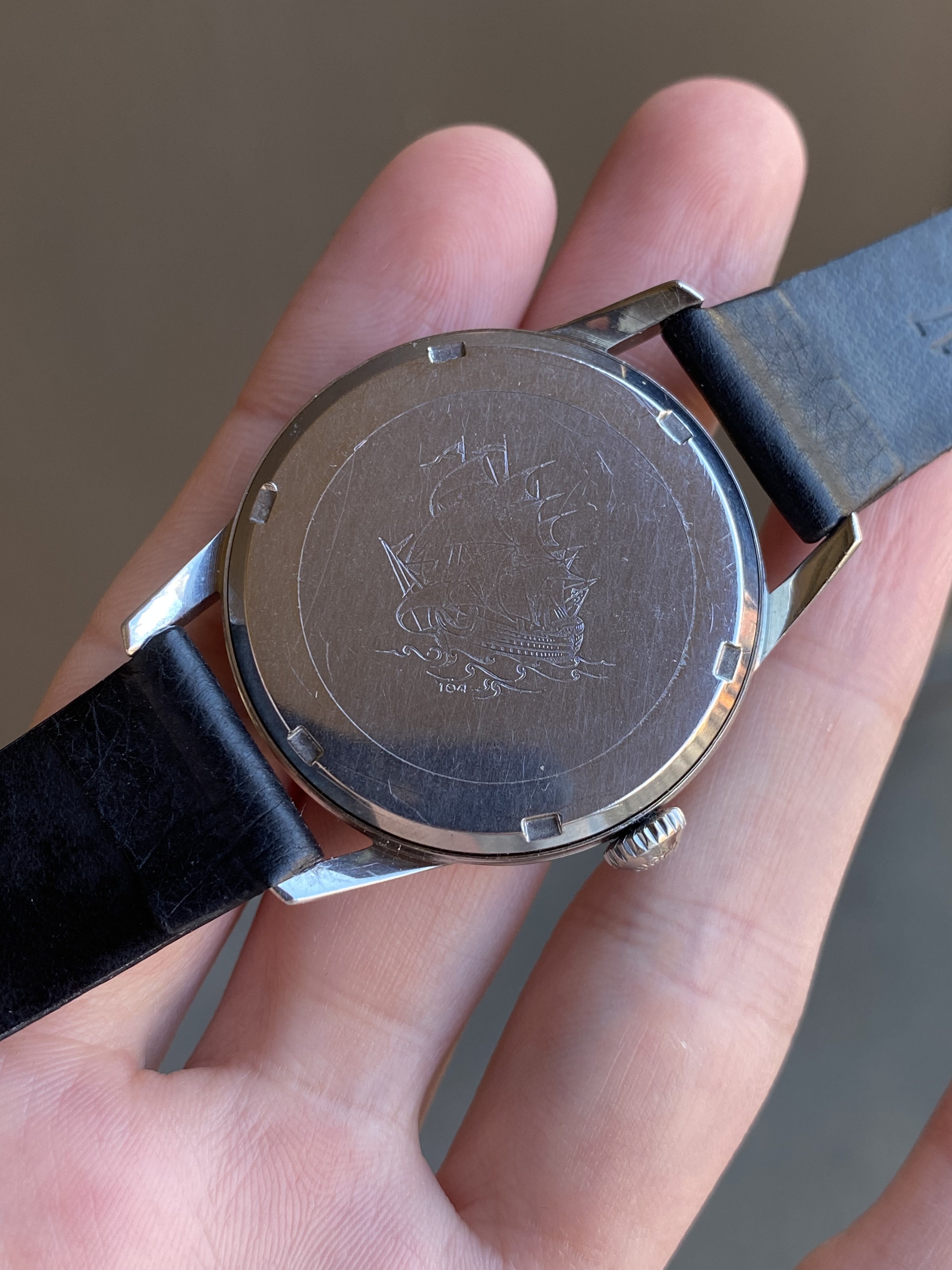 Case: The original 35.5mm 104 ref steel case has been lightly polished but the bevels on the lugs and the ship engraving on the caseback remain in nice condition. As mentioned above, this case wears much larger than most other Flagships from the era that were 34mm. I put a caseback sticker on the back to protect the ship engraving (easily removed).