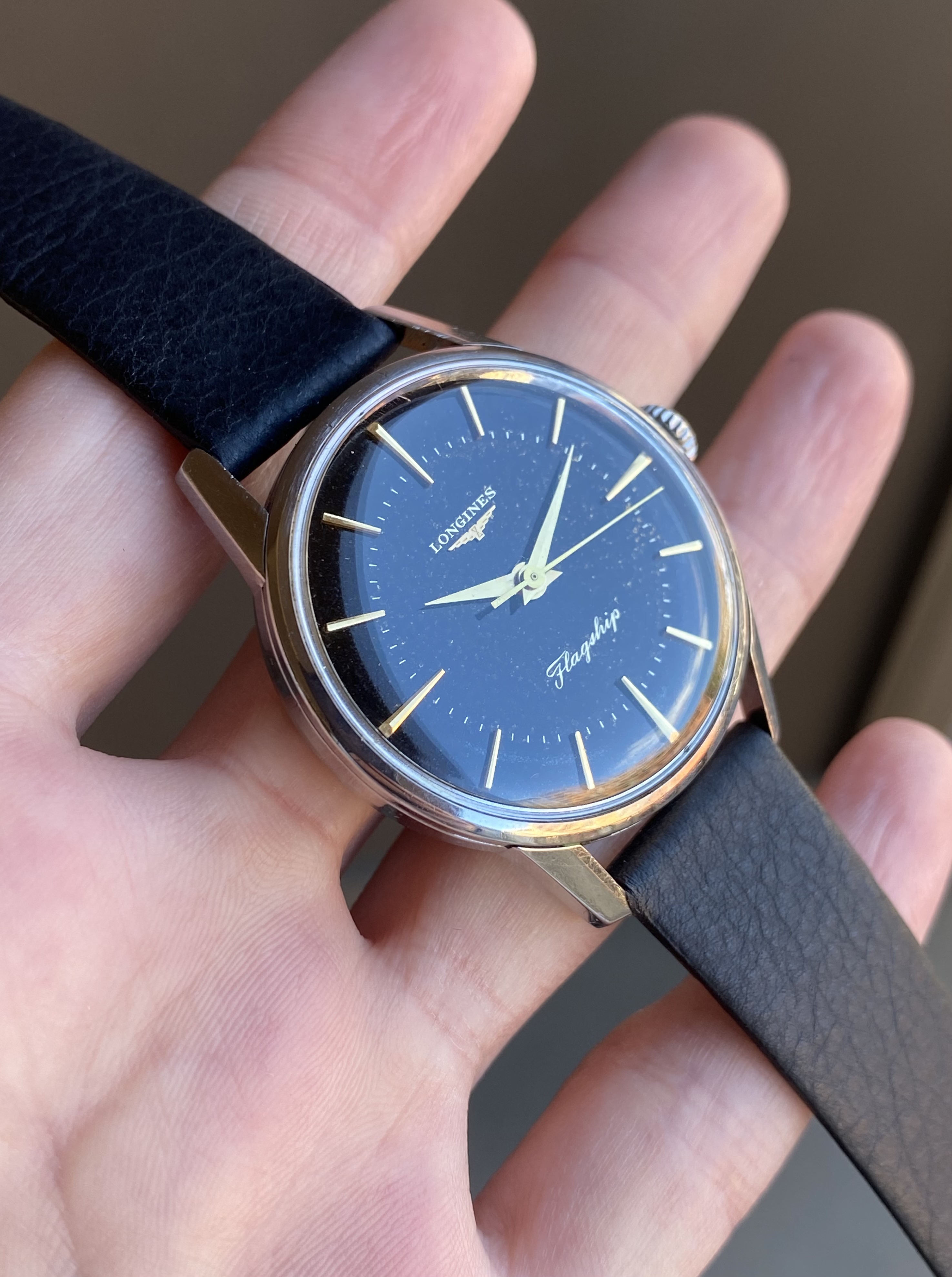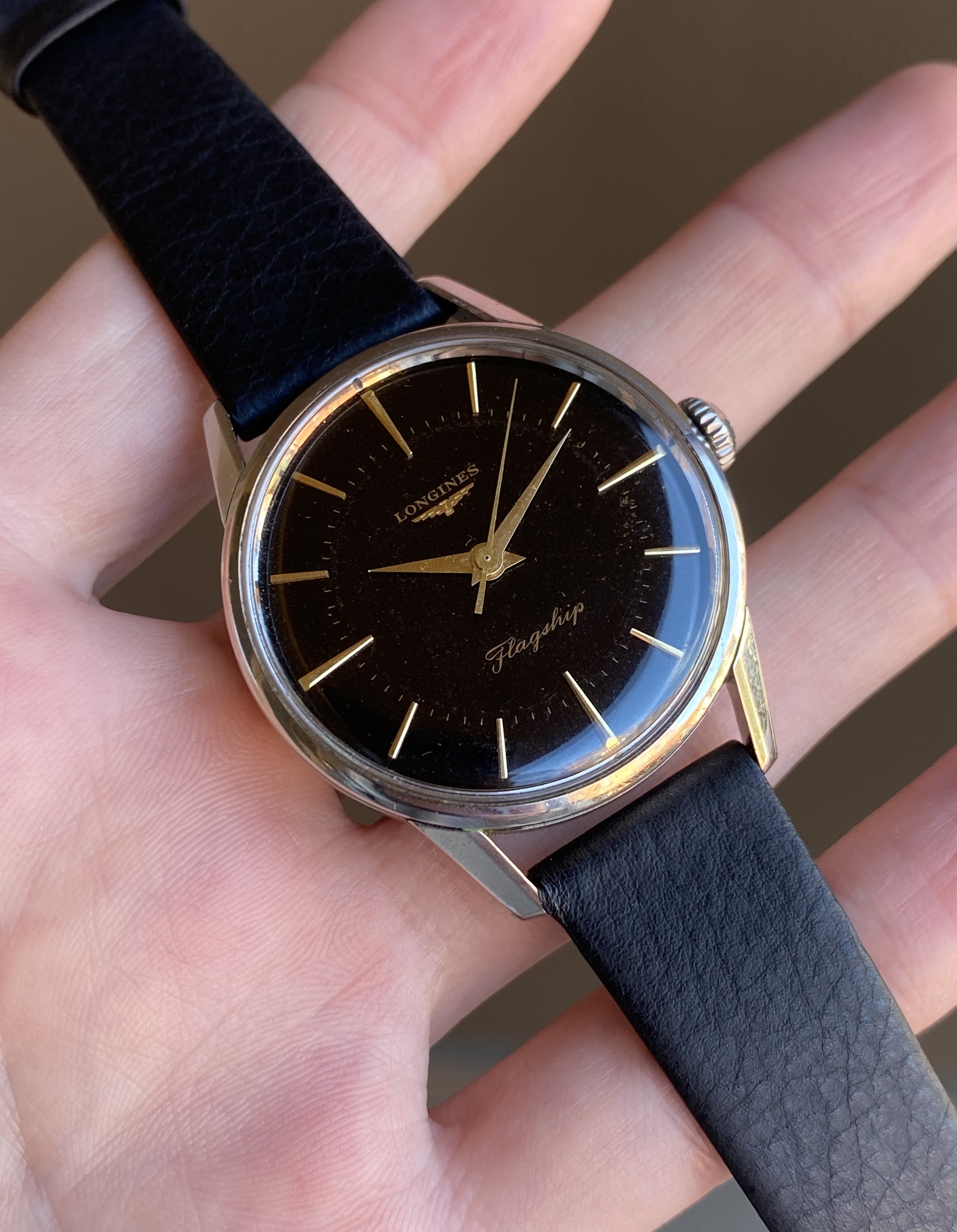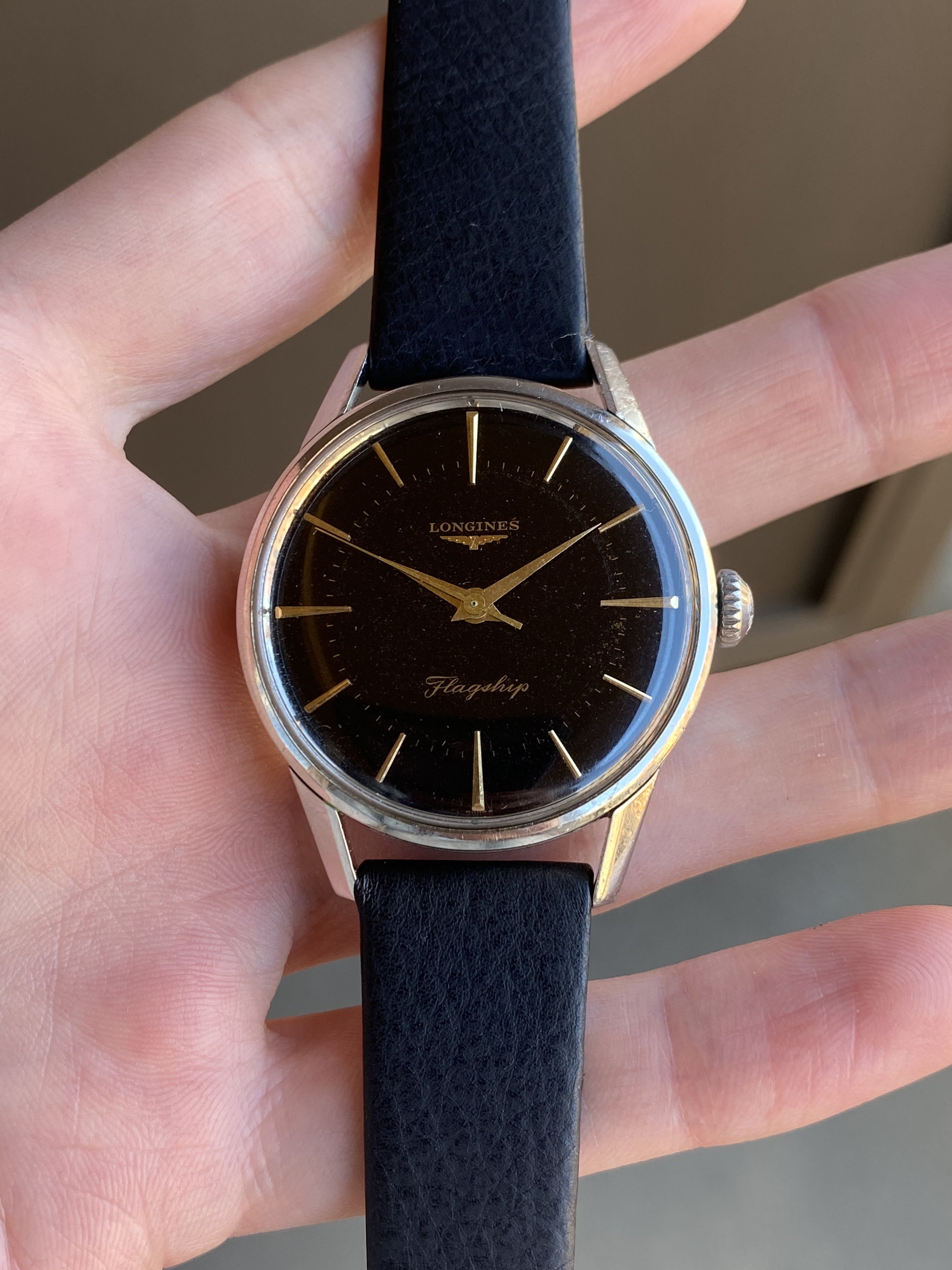 ·Up for sale is a rare 1962 Longines Flagship with an original black gilt dial. The 35.5mm 104 ref case is noticeably larger than its 34mm 101/103 reference siblings. This is also one of the models used to guide the design of the 2020 Flagship Heritage reissue. See below for more info, and don’t hesitate to reach out with questions.