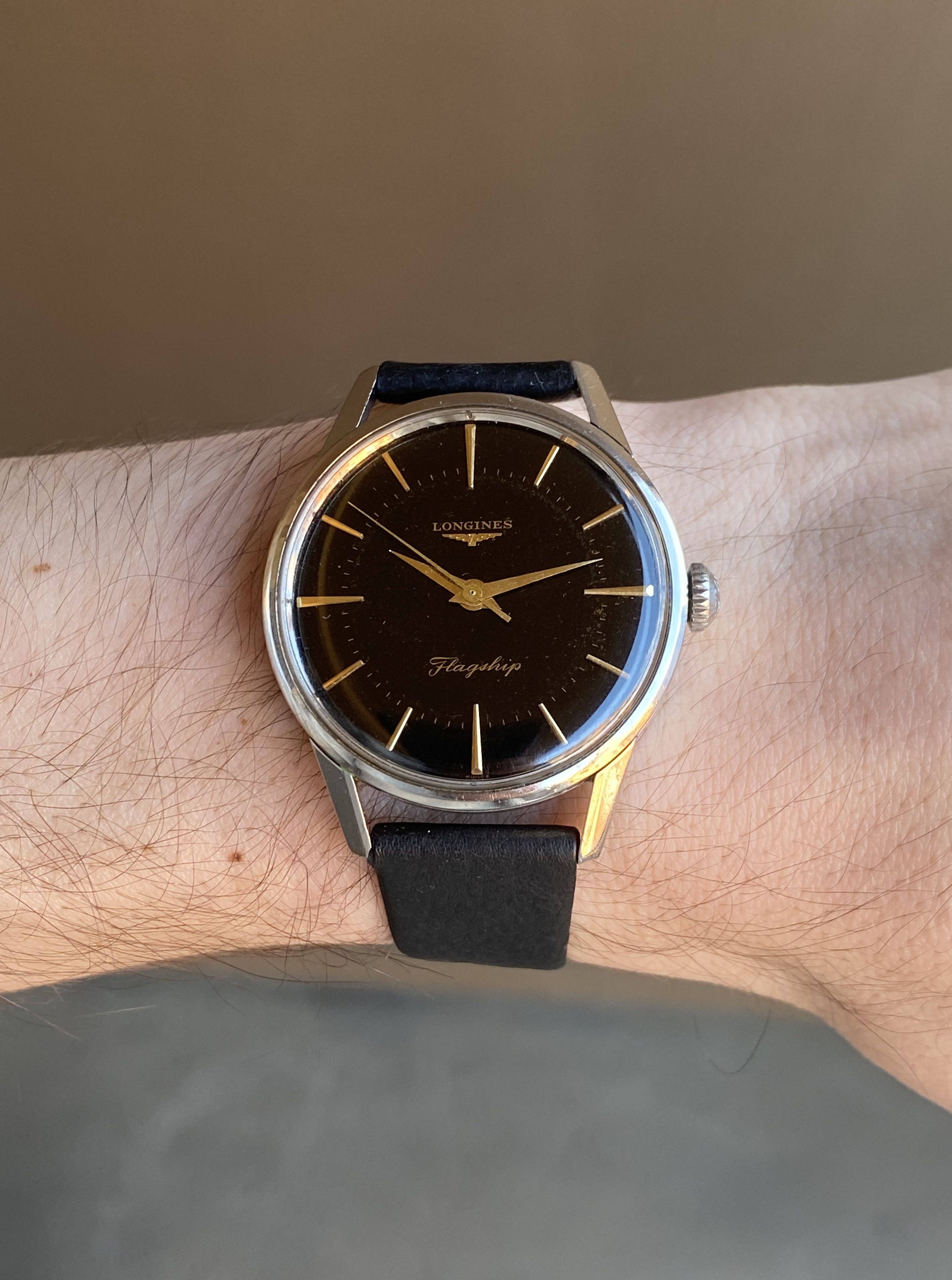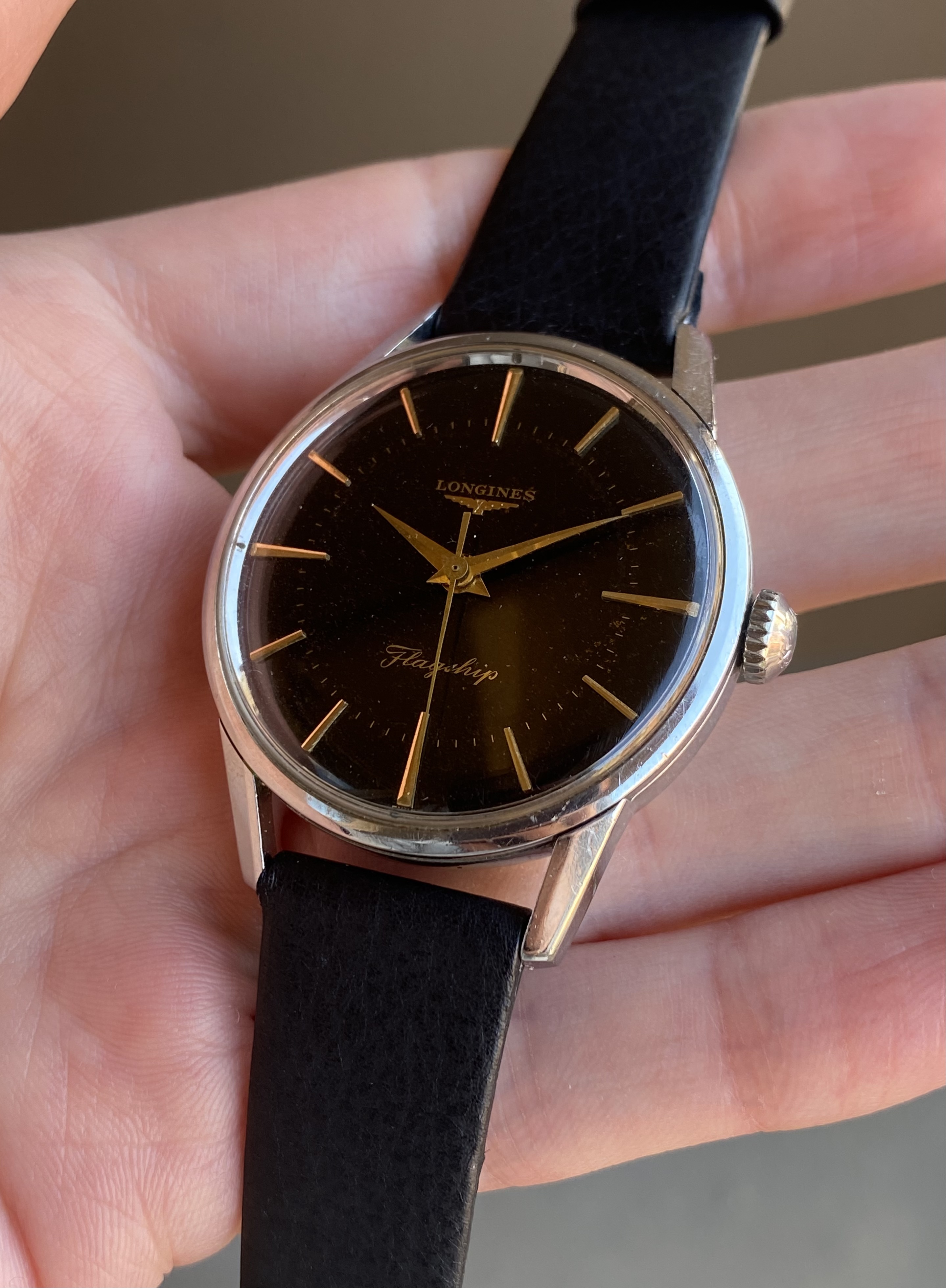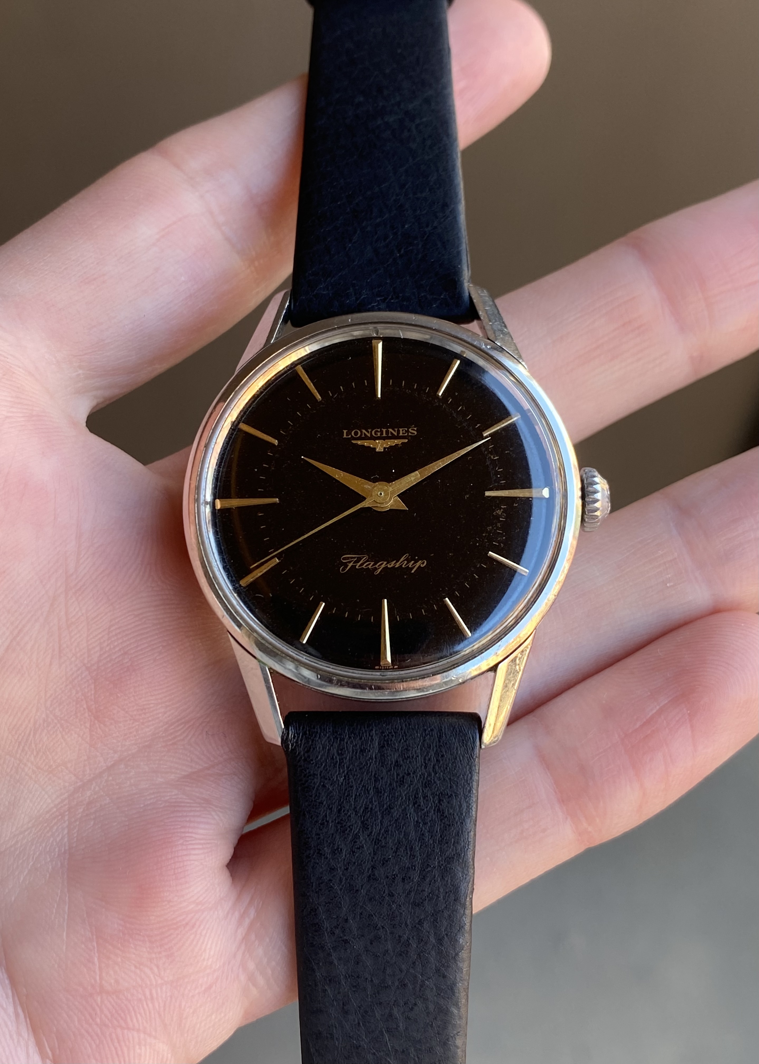·Up for sale is a rare 1962 Longines Flagship with an original black gilt dial. The 35.5mm 104 ref case is noticeably larger than its 34mm 101/103 reference siblings. This is also one of the models used to guide the design of the 2020 Flagship Heritage reissue. See below for more info, and don’t hesitate to reach out with questions.