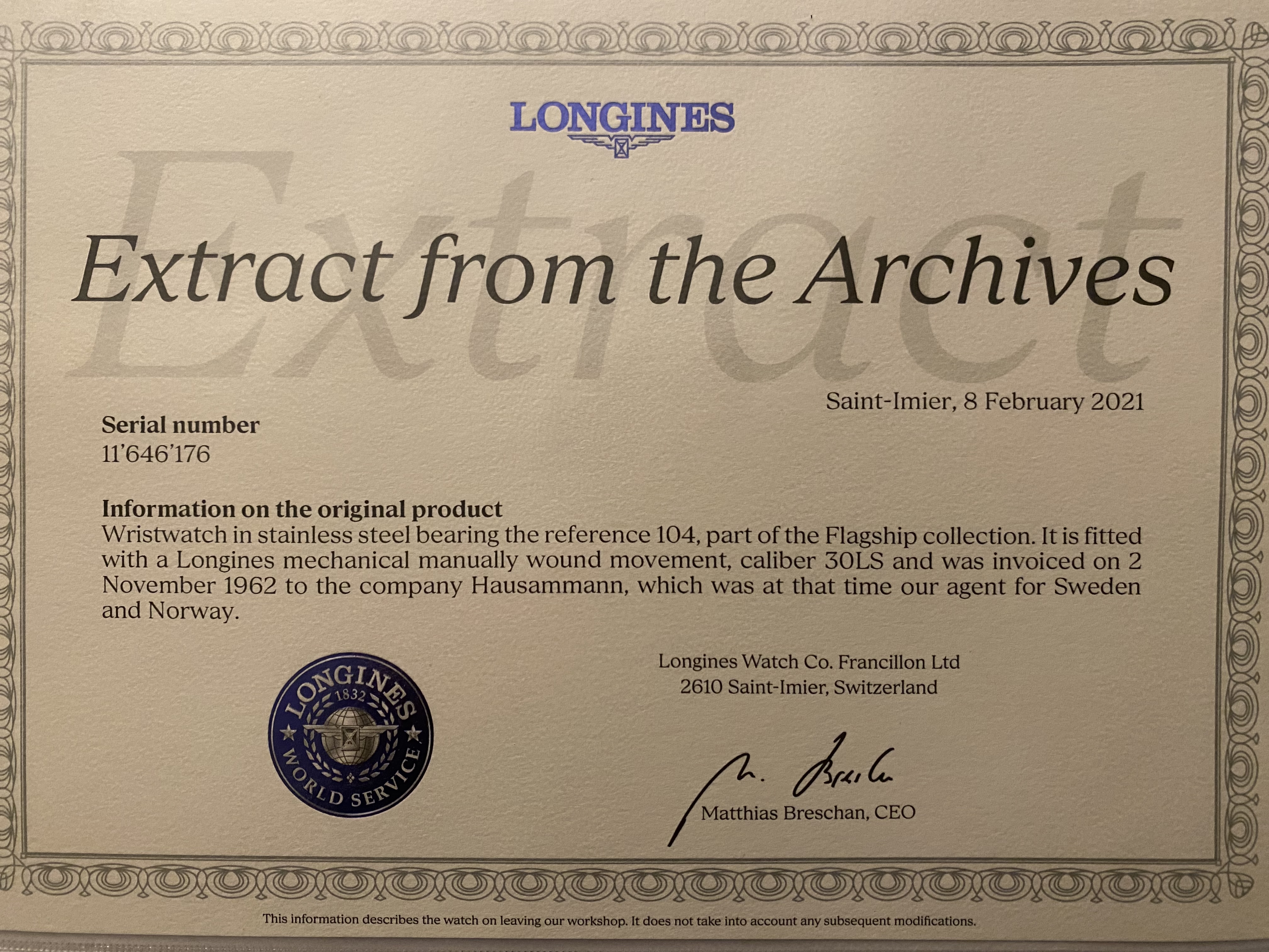 Comes with a physical Longines extract from the archives that indicates the watch was sold in November 1962 to Sweden/Norway.