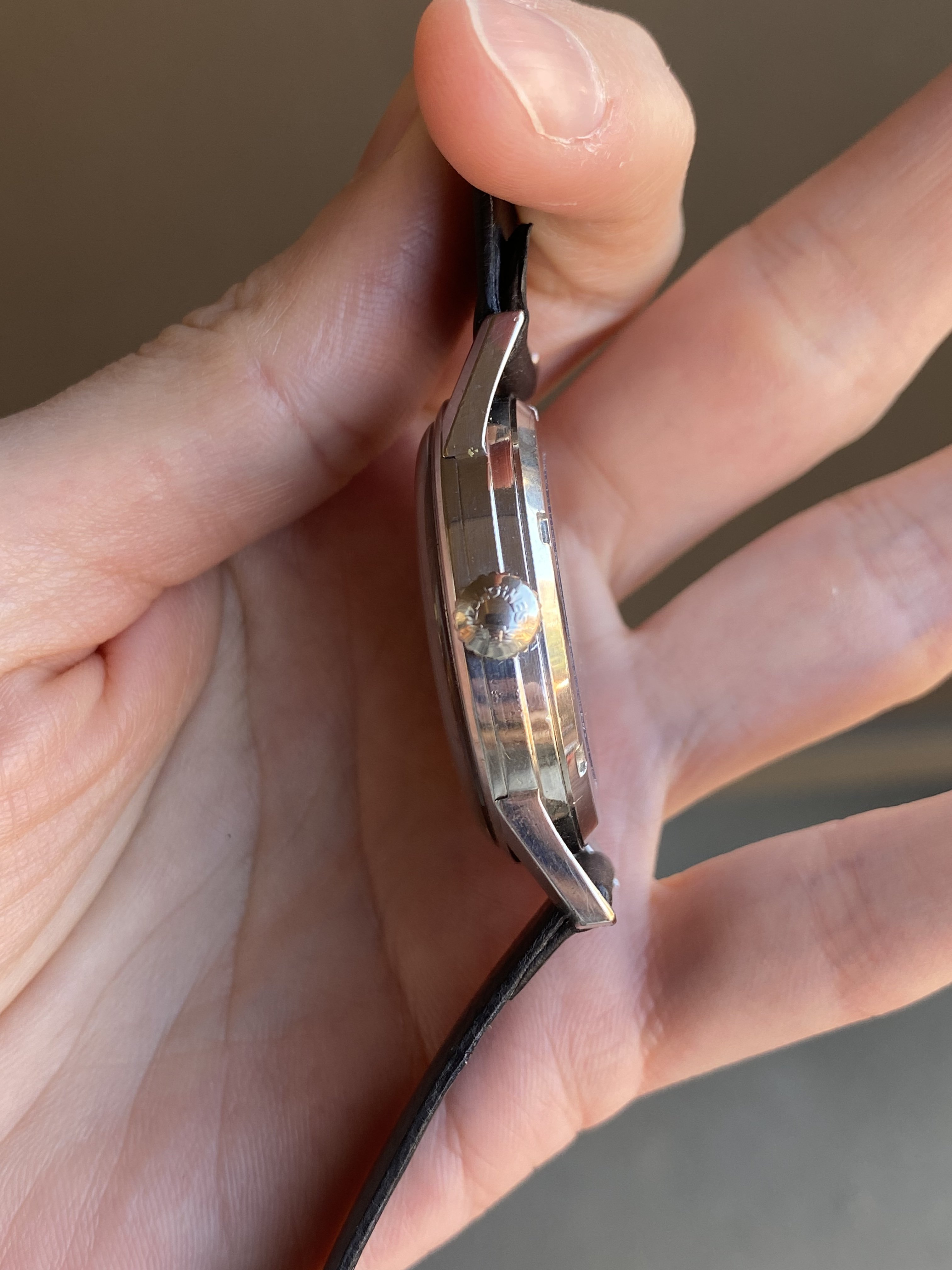 Dial: The original, non-refinished black gilt dial is in nice condition with a light speckling of gold colored patina. Features yellow gold markers and hands. The minute hand has a very slight dent in it (difficult to see but wanted to note it nonetheless). The second hand is original, despite the odd length (that’s just how these came new..).