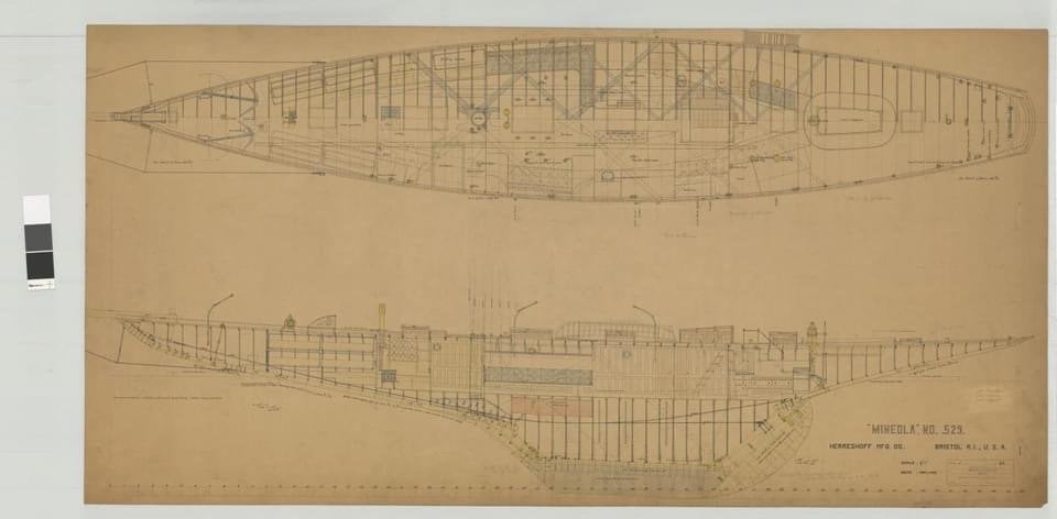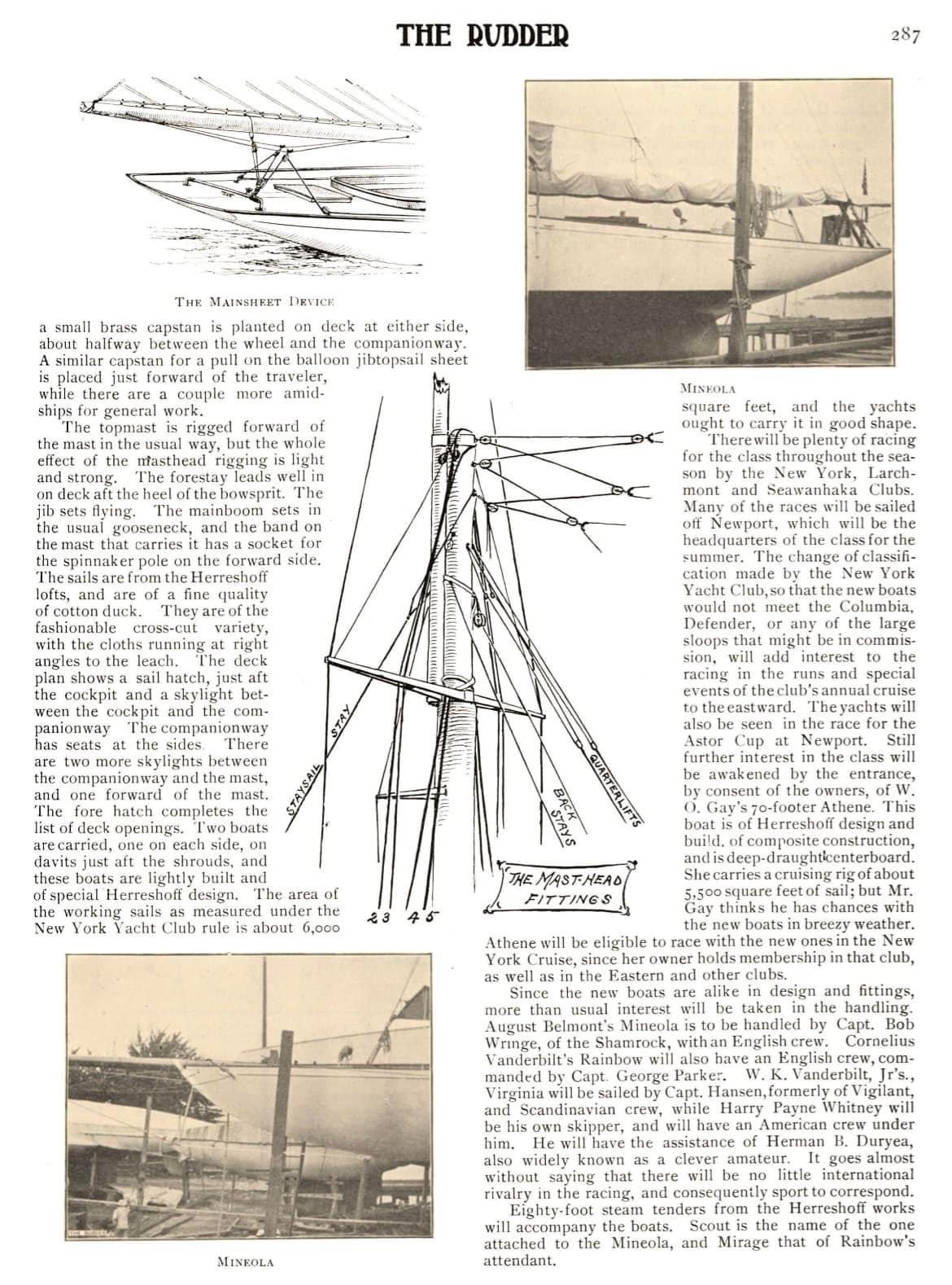 The Yankee was the 4 and last NY70 with hull number 534 , you see it in the main drawing by boiler plate of the Mineola which was used for all 4 boats... The first yacht was the Mineola owned by August Belmont and sail number H5, hull 529 , the Rainbow owner , Cornelius Vanderbilt and sail number H 6 , hull 532, The Virginia owner W.K. Vanderbilt sail H7 , hull 533 ....