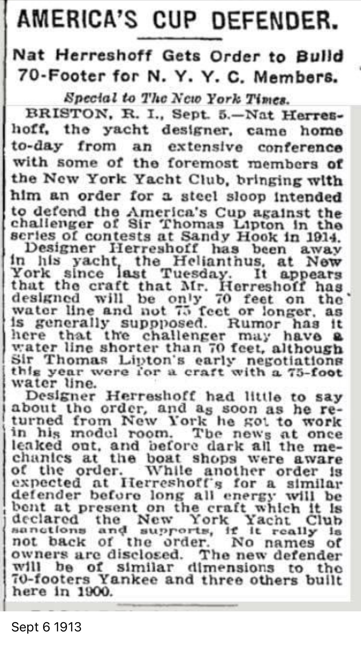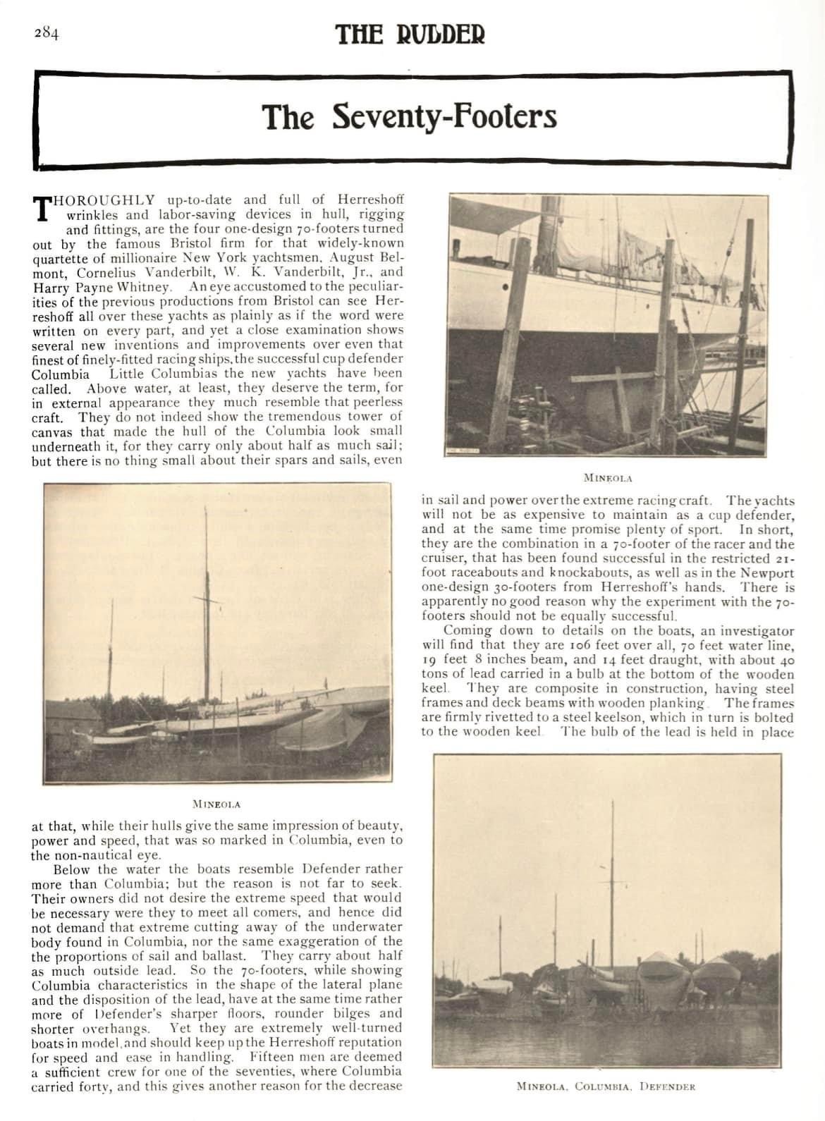 "Four 70-footers were built respectively for August Belmont, Cornelius Vanderbilt, W.K. Vanderbilt, Jr., and Harry Payne Whitney. To this date, the most expensive one-design class ever conceived for some of the most influential owners of this day. Superiority will only be achieved by each owner's ability to excel by one's skill in sail handling and tuning by a crew of 15 professionals."
