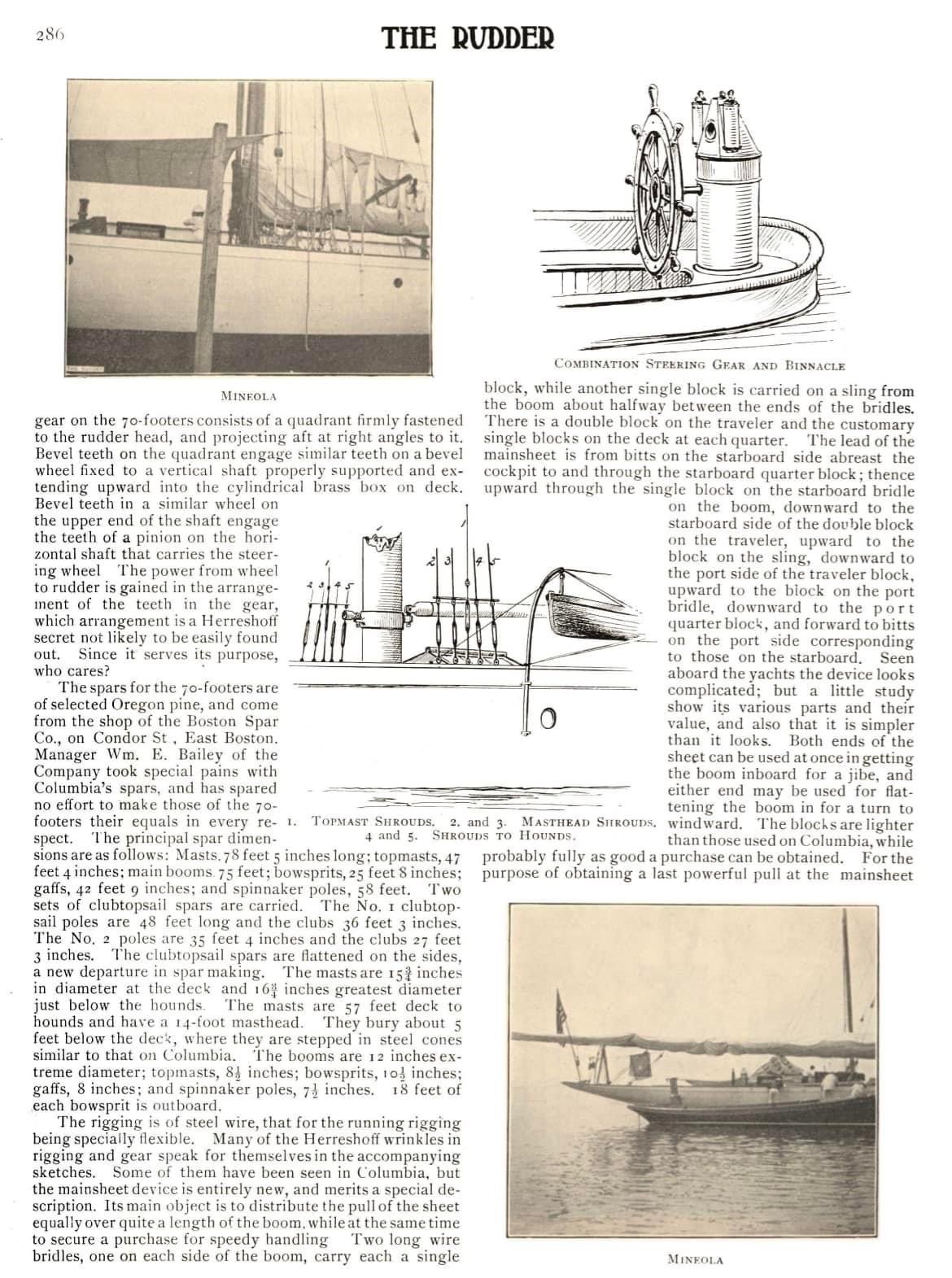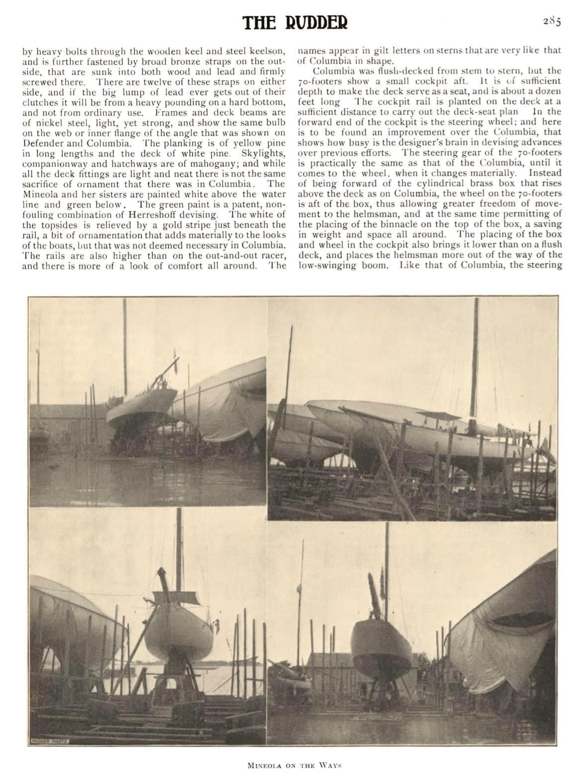I won't go into detail on the construction the 1900 Rudder article attached goes into detail... But its is wooded planked on a metal frame. From other sources that I have read , they were " leaky" but fast !