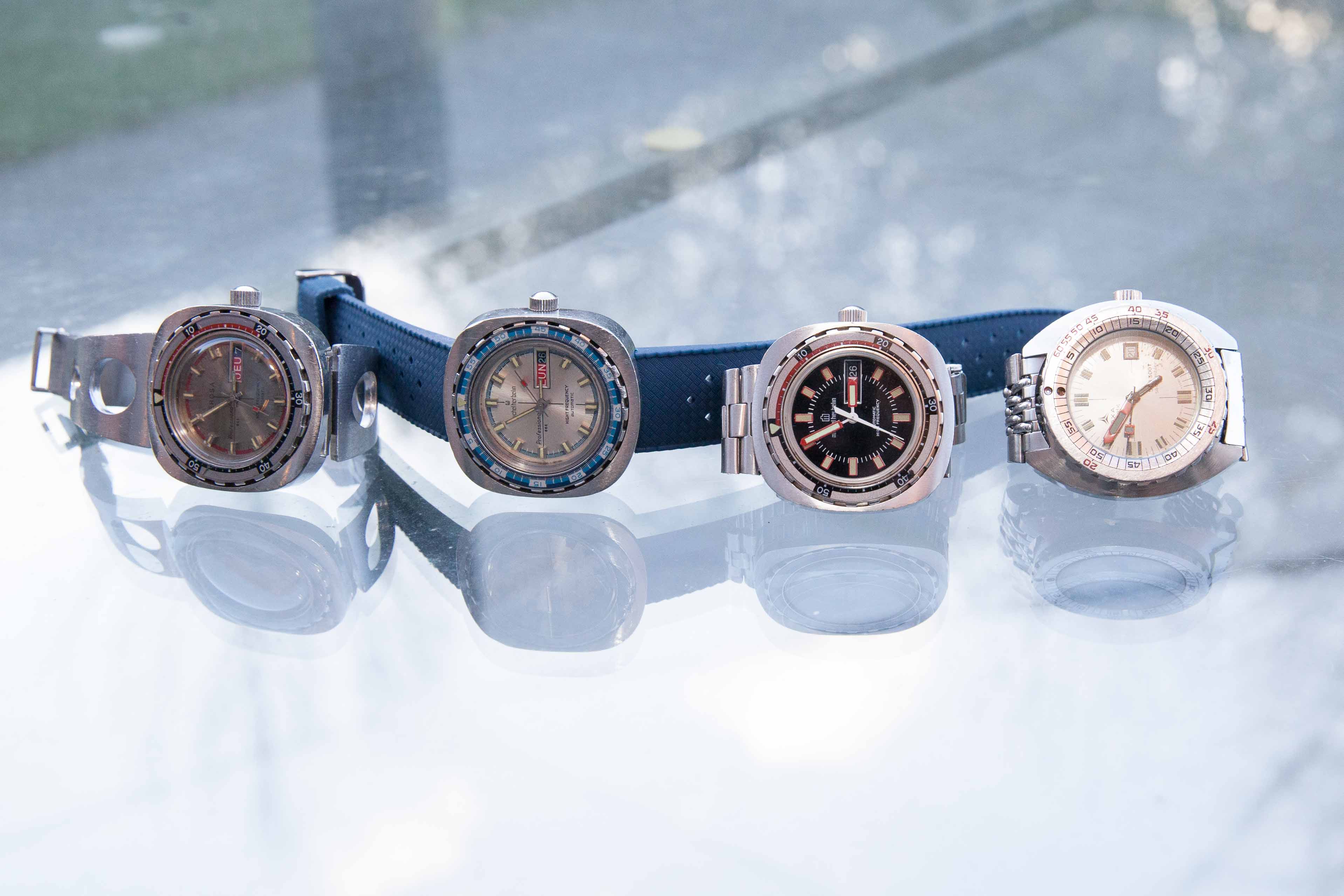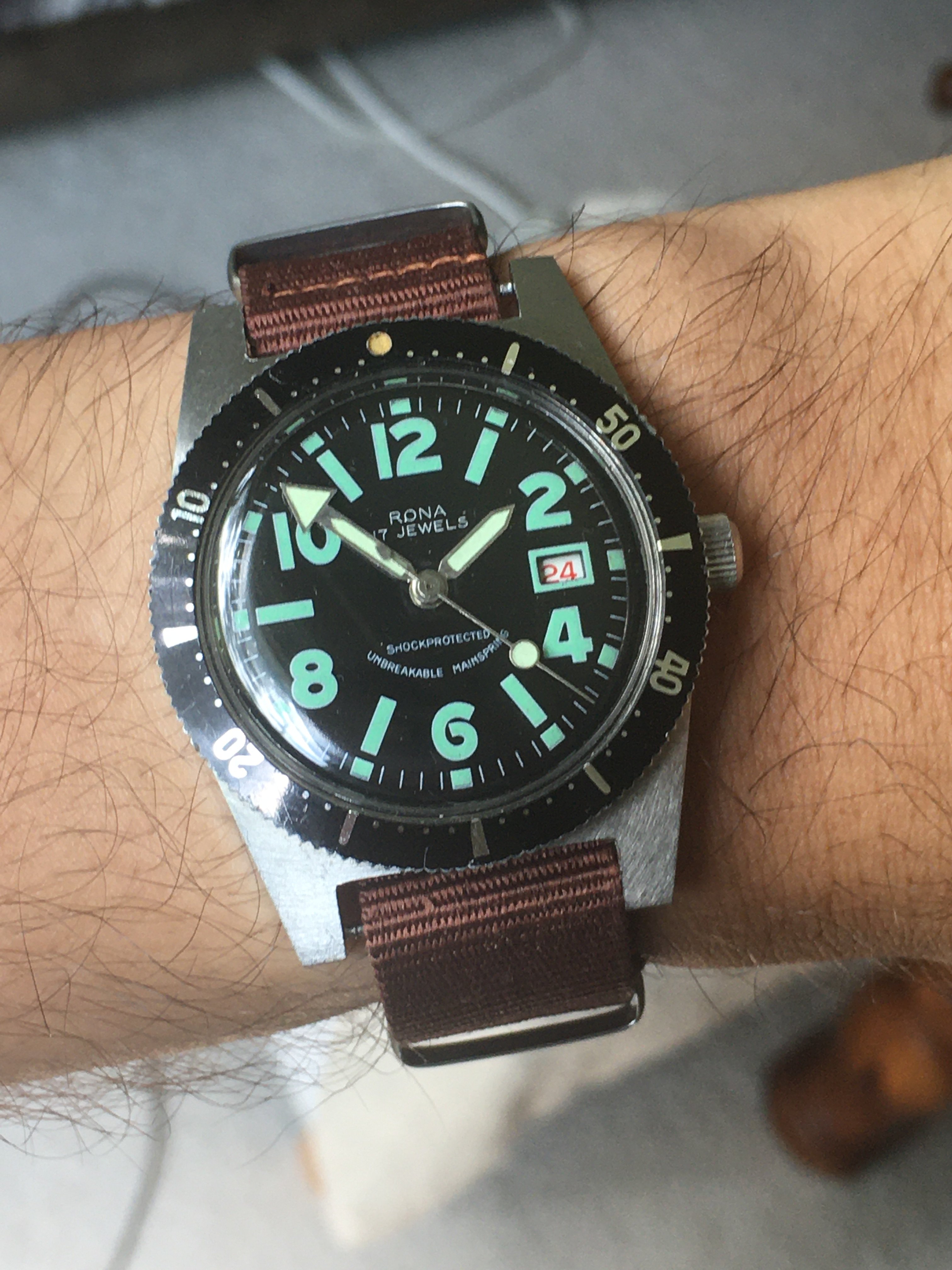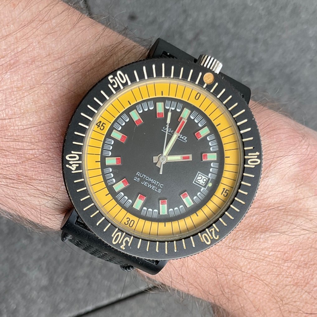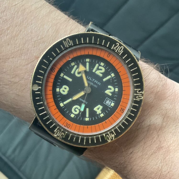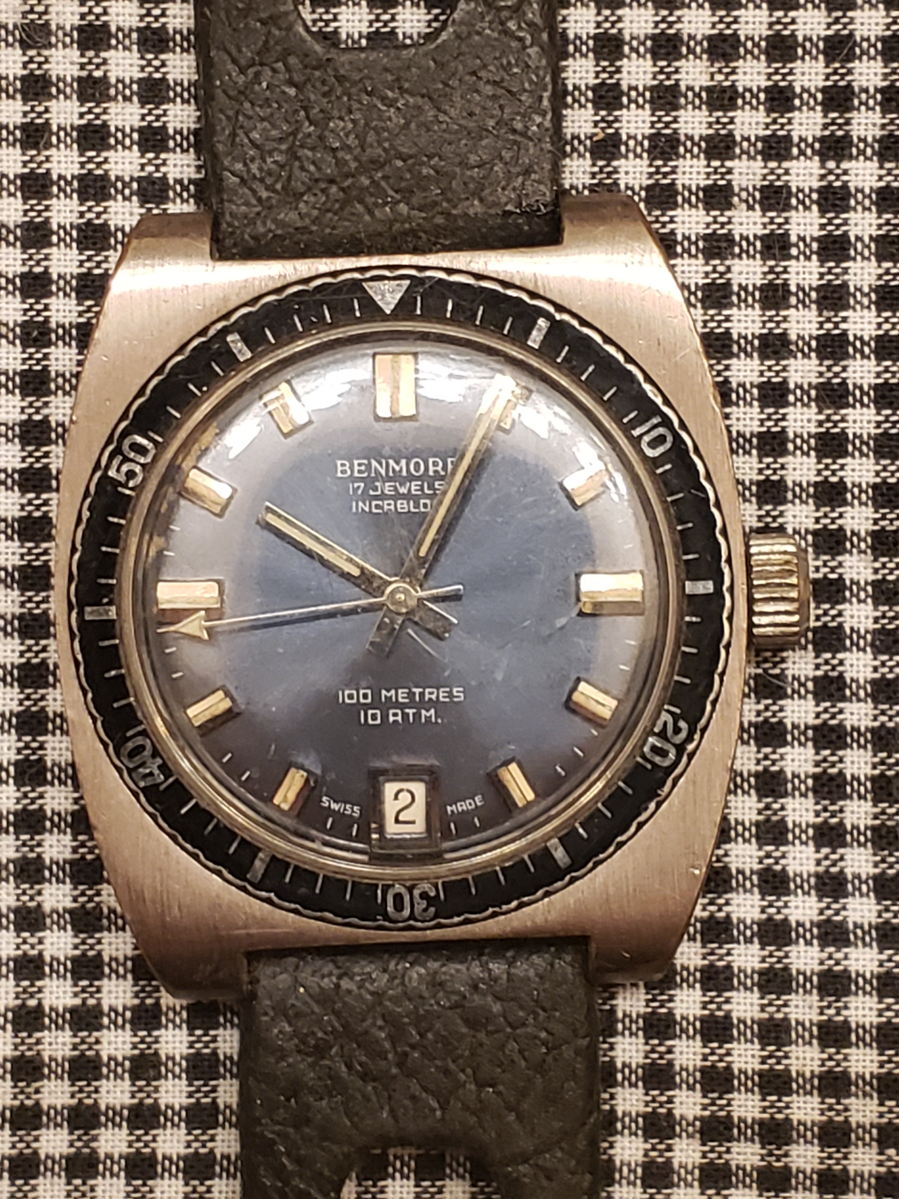 ·Hello everyone, I have a dive watch from perhaps the 60s or 70s I'd love to learn more about. It is a Benmore 17 Jewel Incabloc rated for 10 ATM. What I love about this piece is that the bezel is countersunk into the case for a sleek look and thinner case. The case is 36 mm in diameter without the crown and only 10 mm thick. The watch still functions as does the lume on the dial and hands. Any information would be great as I'm considering having this watch serviced. Thank you!