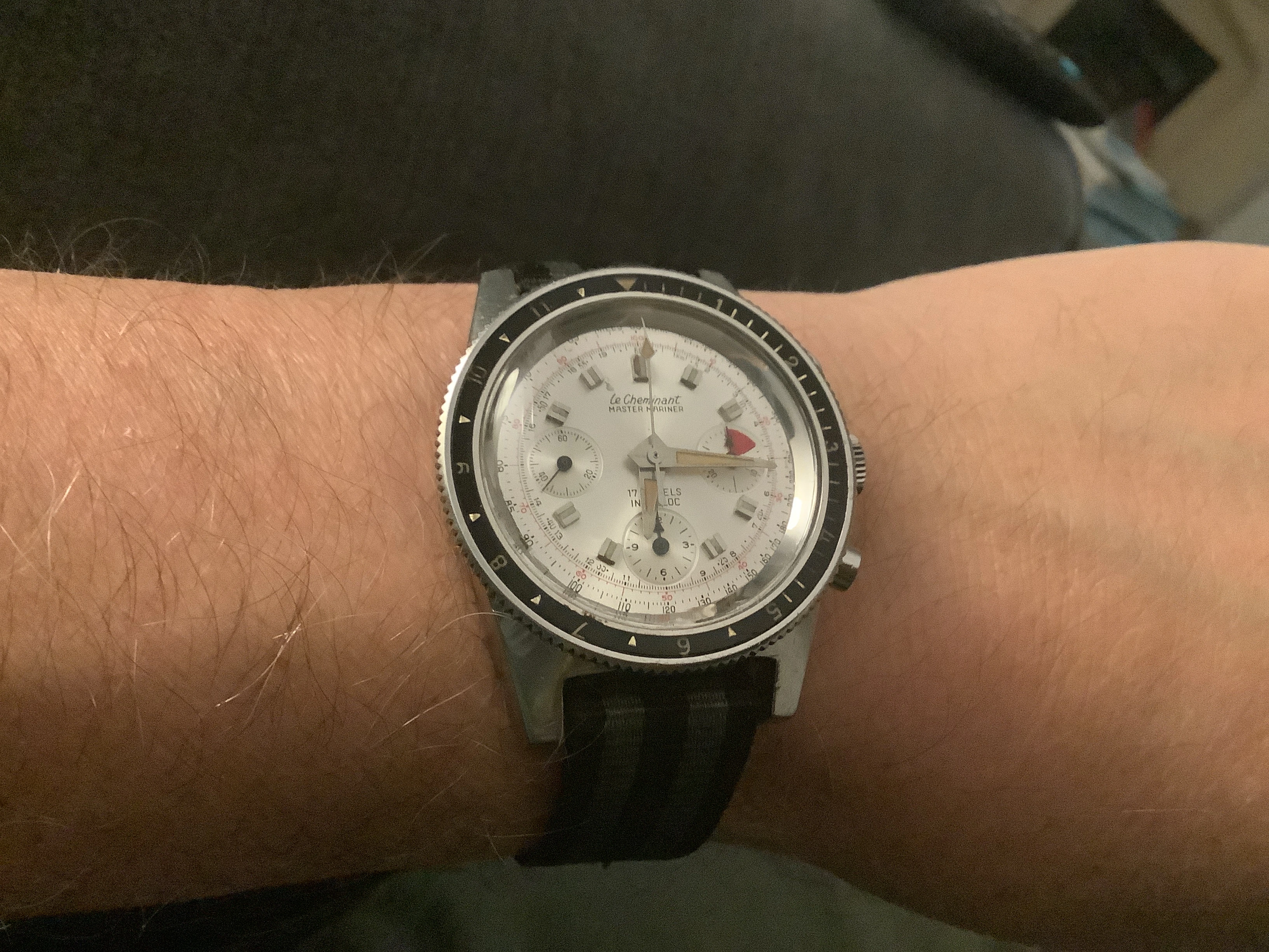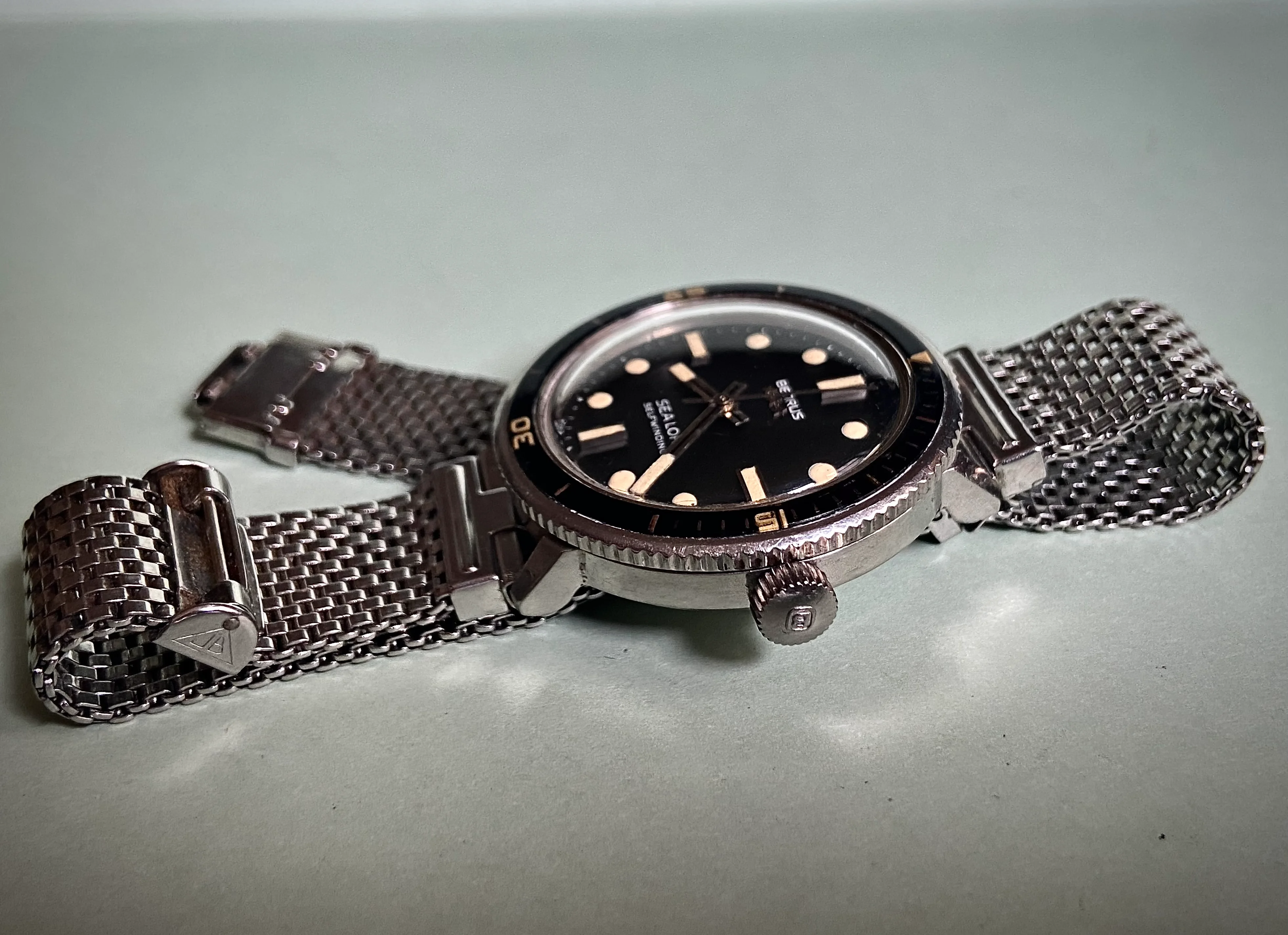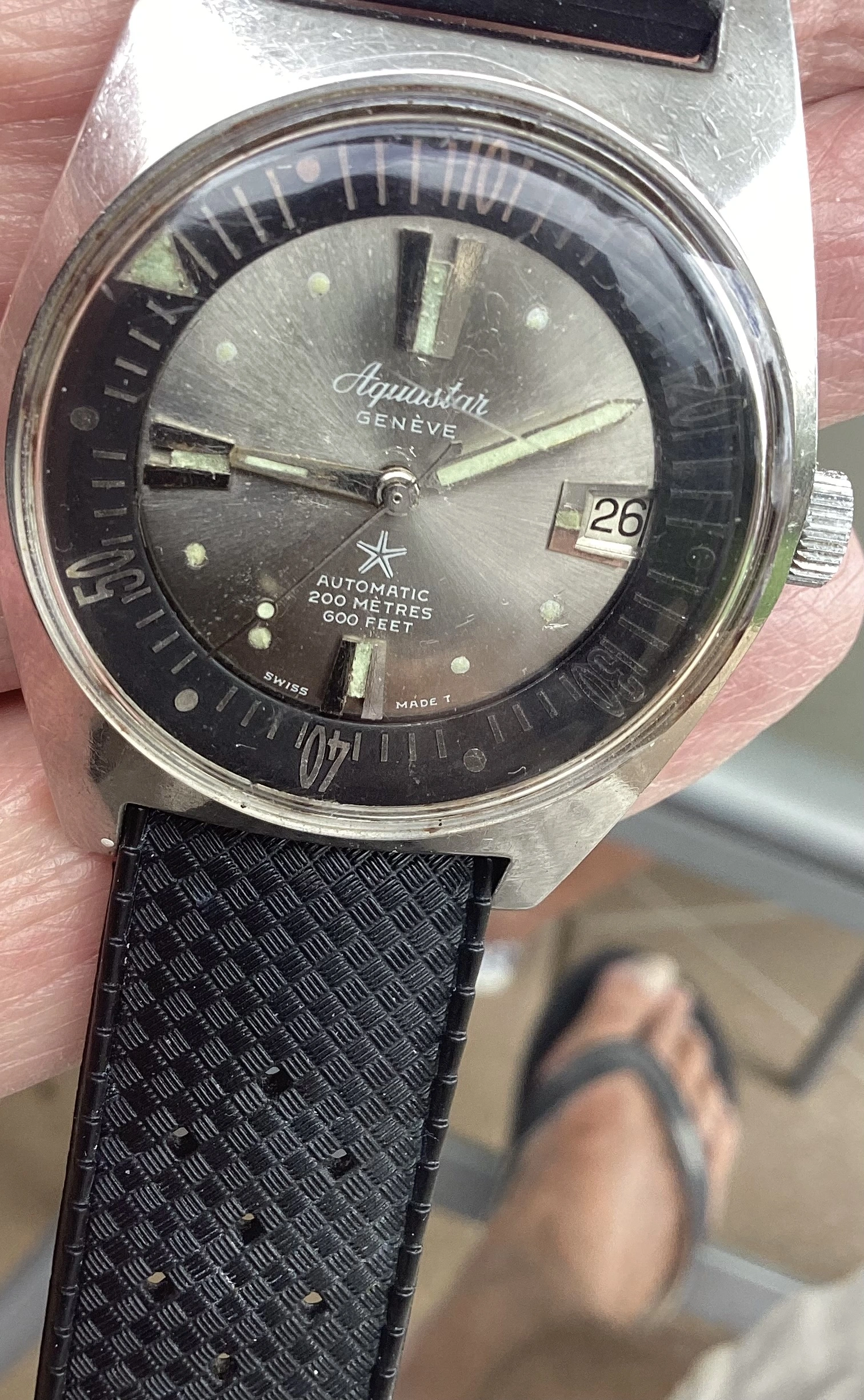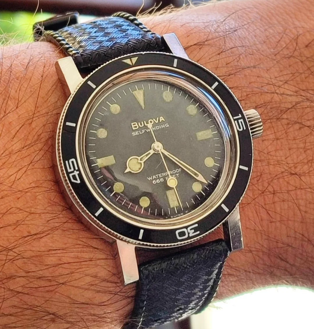 During my diving days, it was Dacor as my go to brand for regulators and other dive gear. This baby landed Sept 16 and I have to say the dial and crystal is in great shape and the case looks good too. The endlinks on the bracelet are a tad wonky and might need a little sympathetic bending. Thankfully I have a tropic strap that works. It definitely needs a service so it's presently residing at my local watchmaker., The watch was made by Titus in Geneva and I think this one dates back to the mid or late sixties. It has an ETA 2472 movement. Definitely looking forward to having her back!