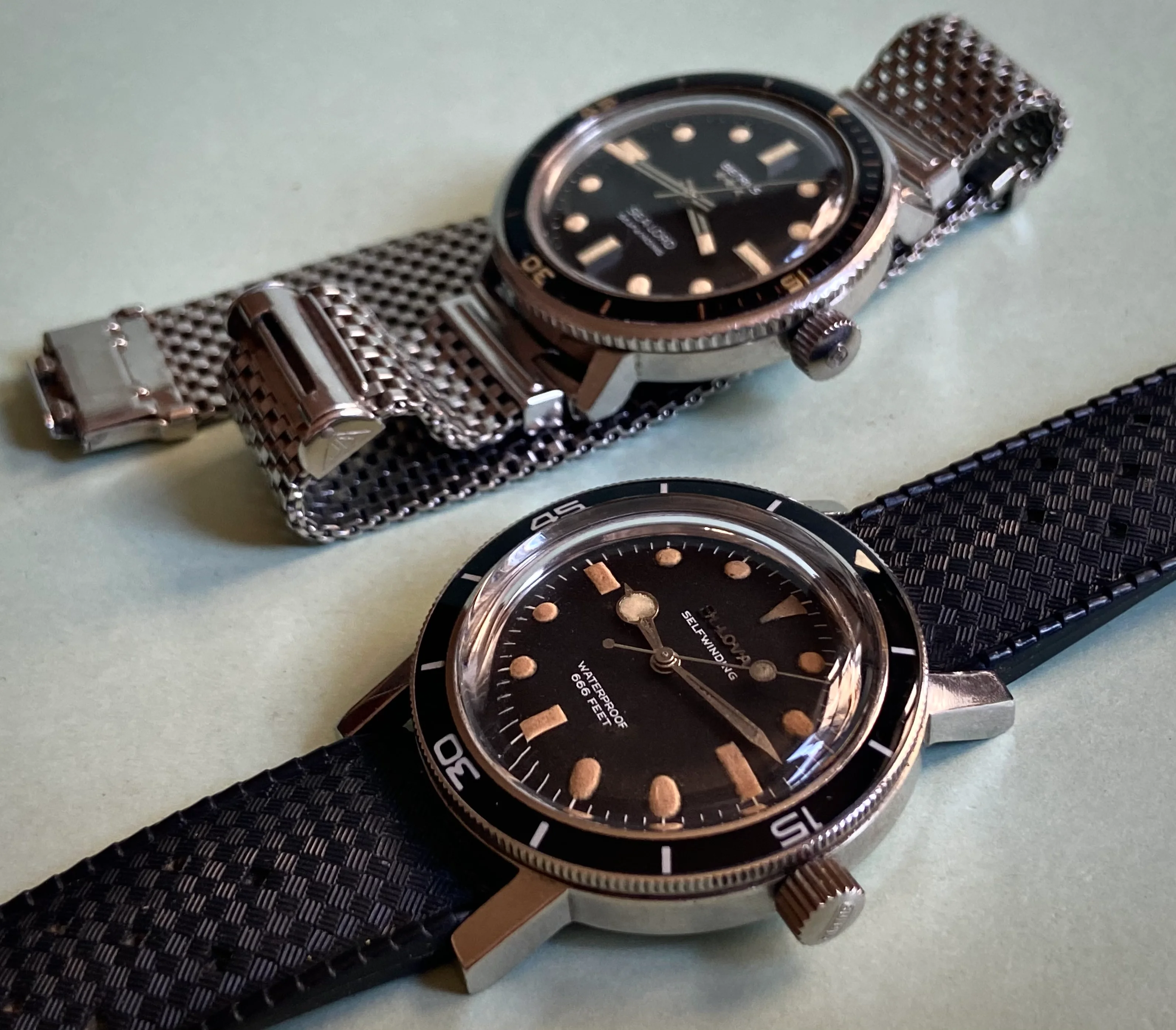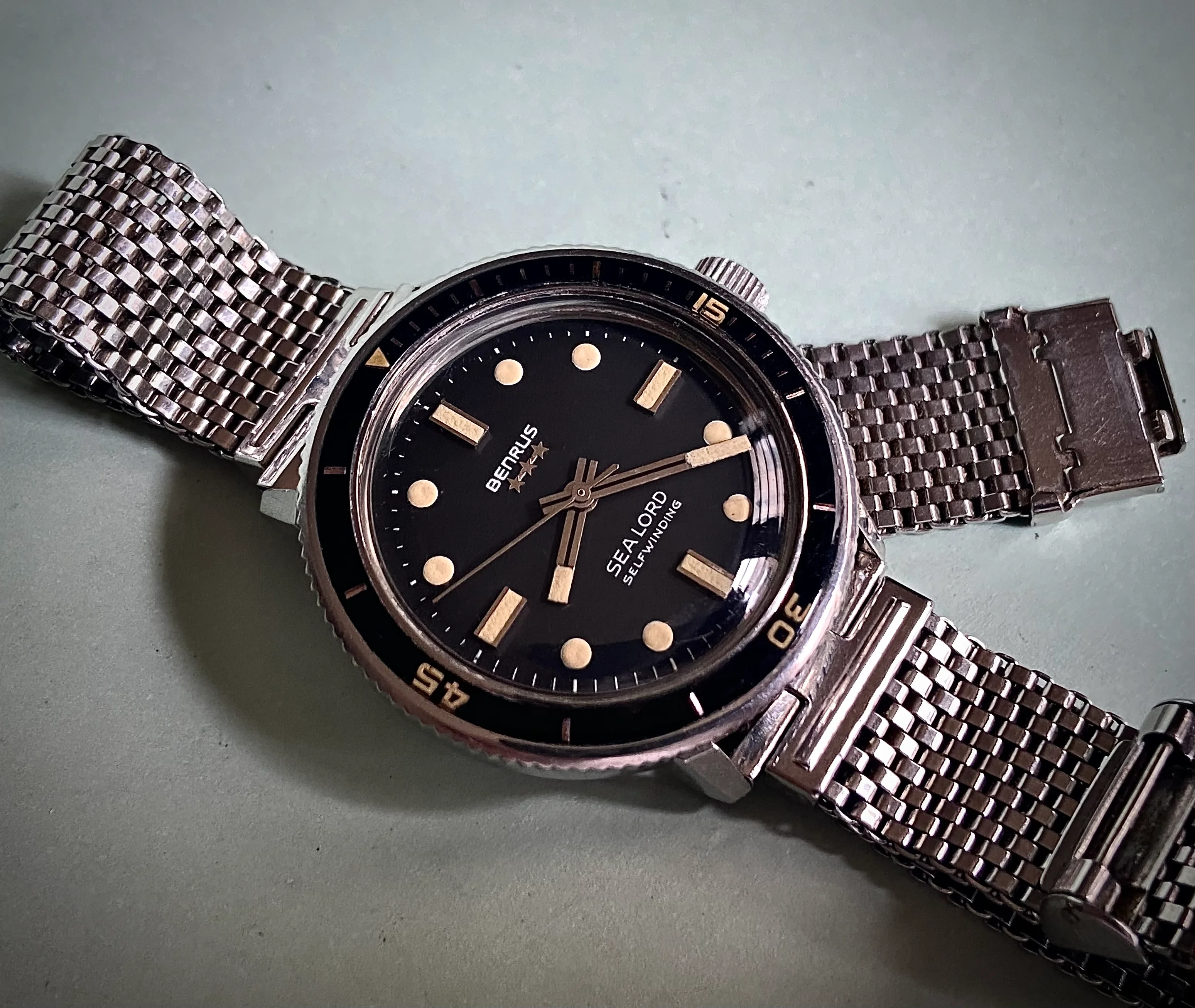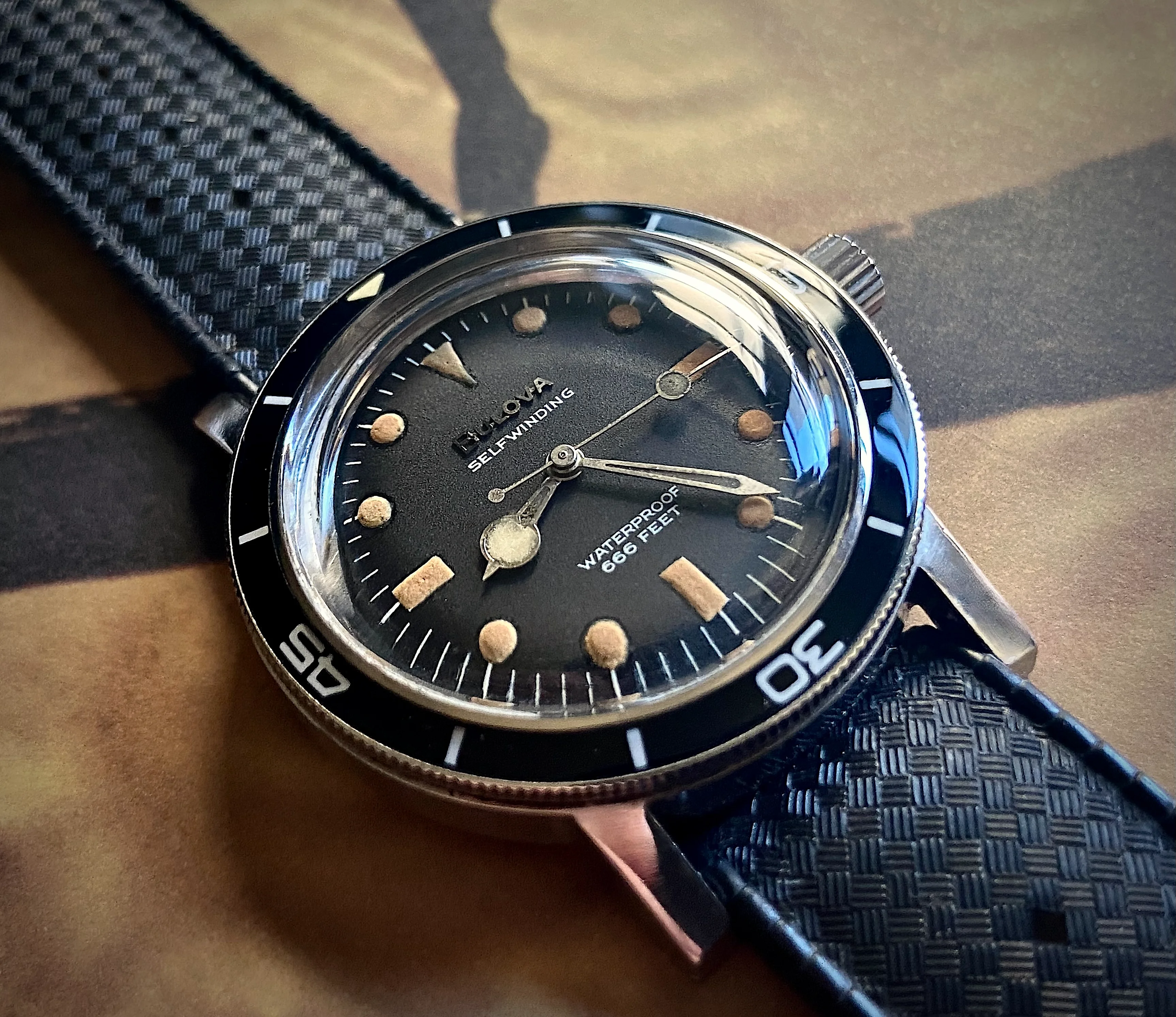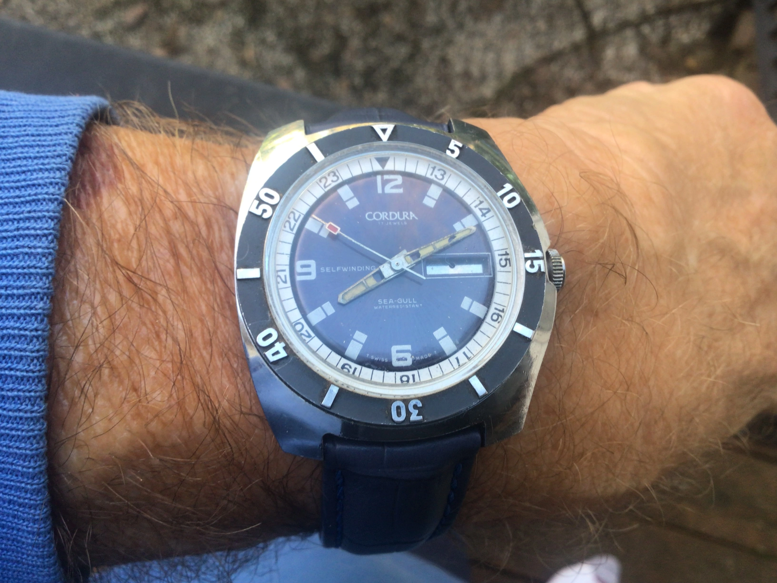During my diving days, it was Dacor as my go to brand for regulators and other dive gear. This baby landed Sept 16 and I have to say the dial and crystal is in great shape and the case looks good too. The endlinks on the bracelet are a tad wonky and might need a little sympathetic bending. Thankfully I have a tropic strap that works. It definitely needs a service so it's presently residing at my local watchmaker., The watch was made by Titus in Geneva and I think this one dates back to the mid or late sixties. It has an ETA 2472 movement. Definitely looking forward to having her back!