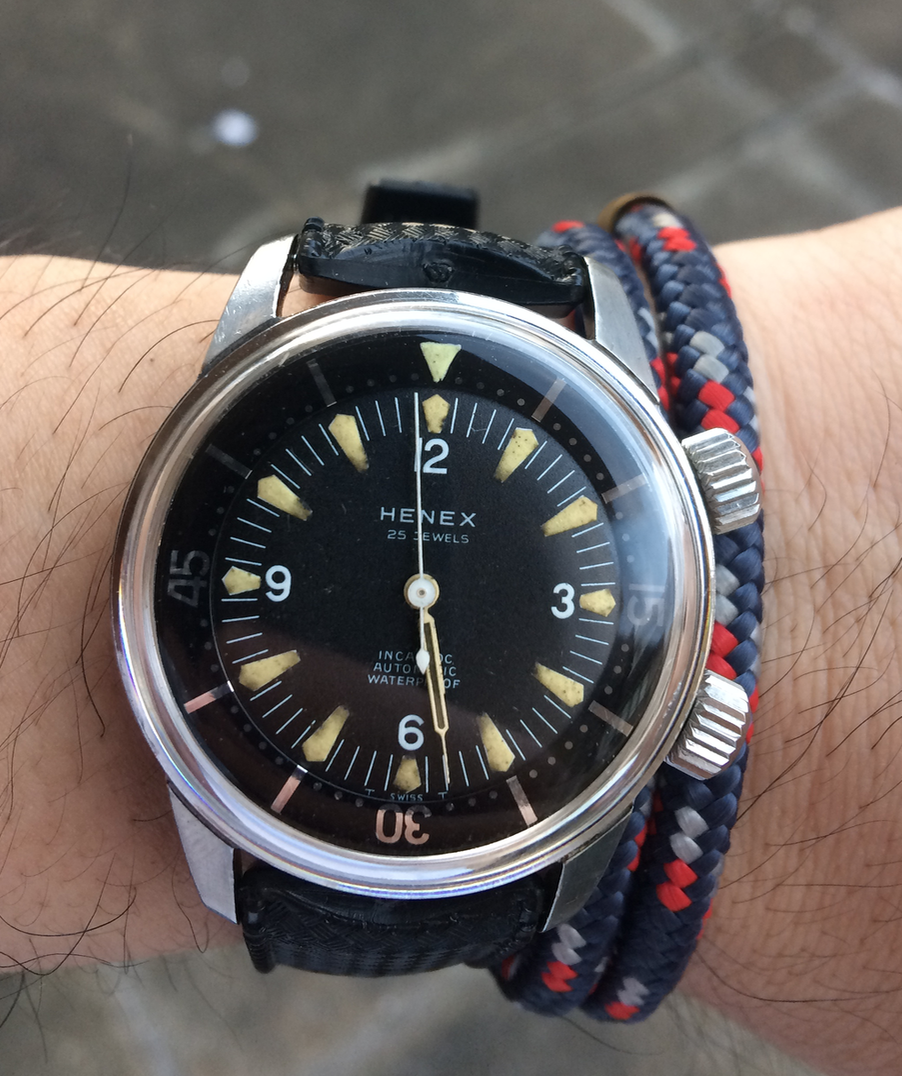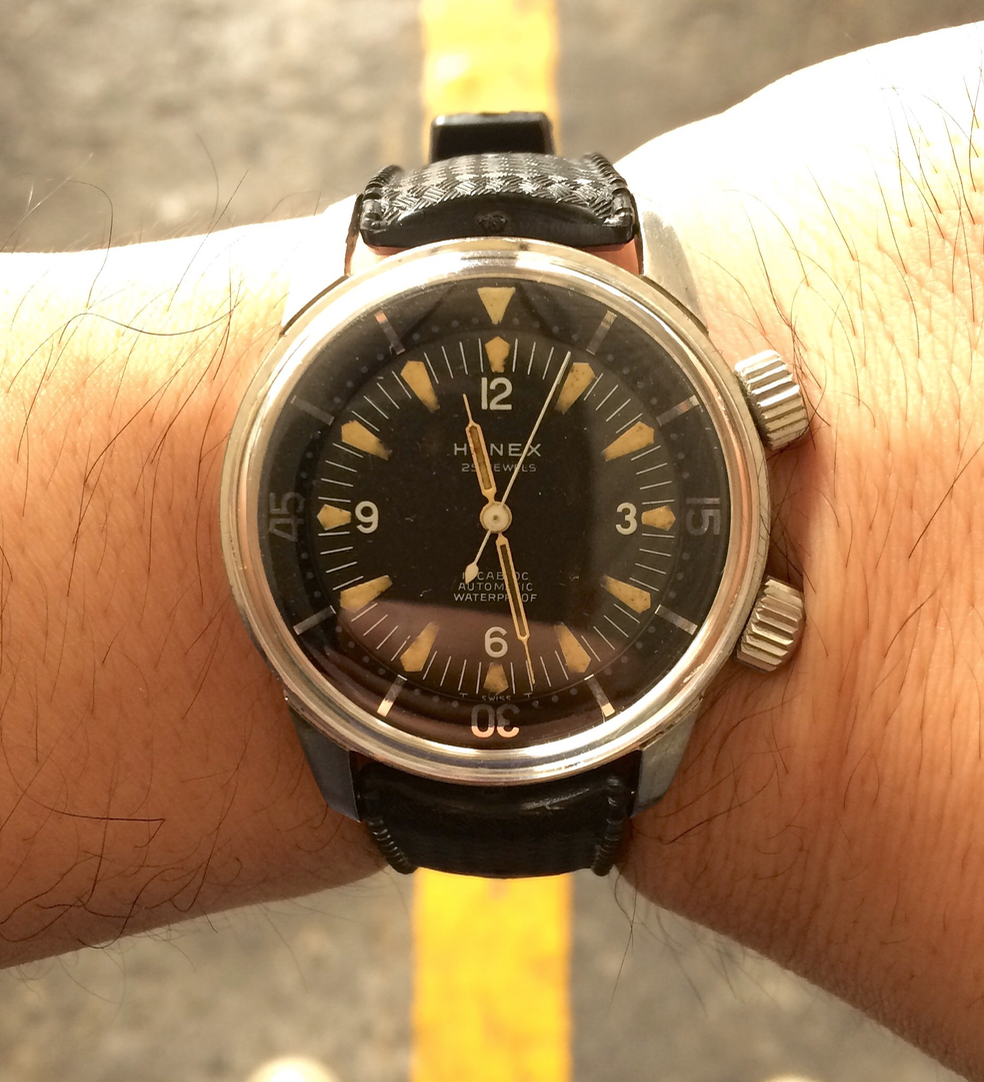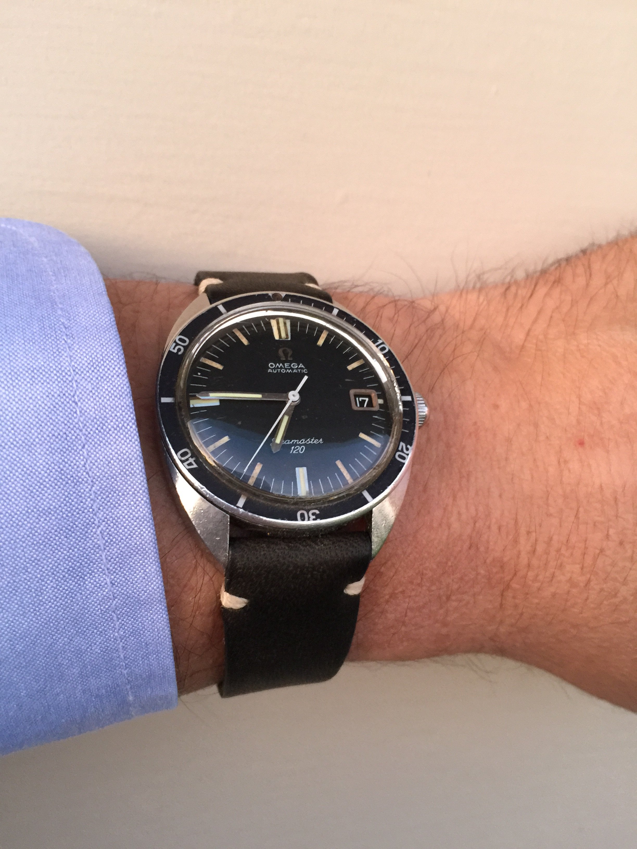 1967 Omega 120 ref.# 135.027 cal. 601 manual wind .... worn by my Dad in Vietnam [2 tours of duty] ... bought at SUBIC NAVAL BASE The Republic of the Philippines in 1967 .... 1970 my Dad brought it to Omega Service center he wanted to see if he could have the hand set replaced with better visibility both day and night as he was in the Jungle / in the field ... the technician took the hour and minute hands from a 1960's Omega Geneve and the second sweep hand from a 1960's Omega 300 ... the result is what u see ... i have had the crystal replaced in 1989 by omega as well ... I have tried to maintain and care for this watch as it was my fathers, it is also pressure tested to it's dive depth rating ... all service maintenance on this watch has been done thru Omega only and has only 2 original owners ... my Dad [deceased] and myself ...