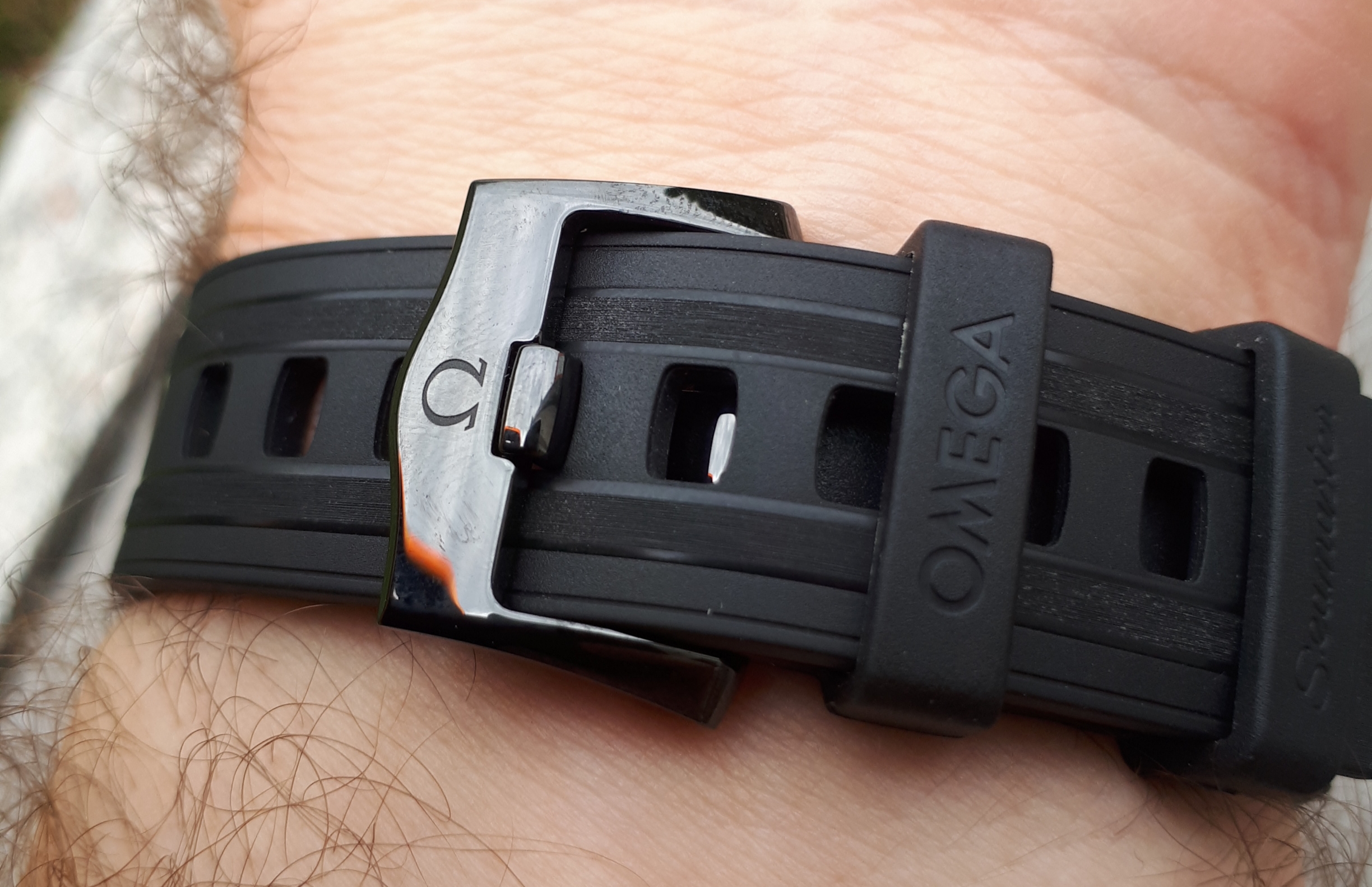 I think that’s a point well taken! Certainly on my wrist there is plenty of adjustment length left to accommodate a wetsuit. I would also say that the pin buckle here is exceptionally well done - polished black ceramic with Omega logo engraved and brushed sides to complement the case. No desk diving scratches here!