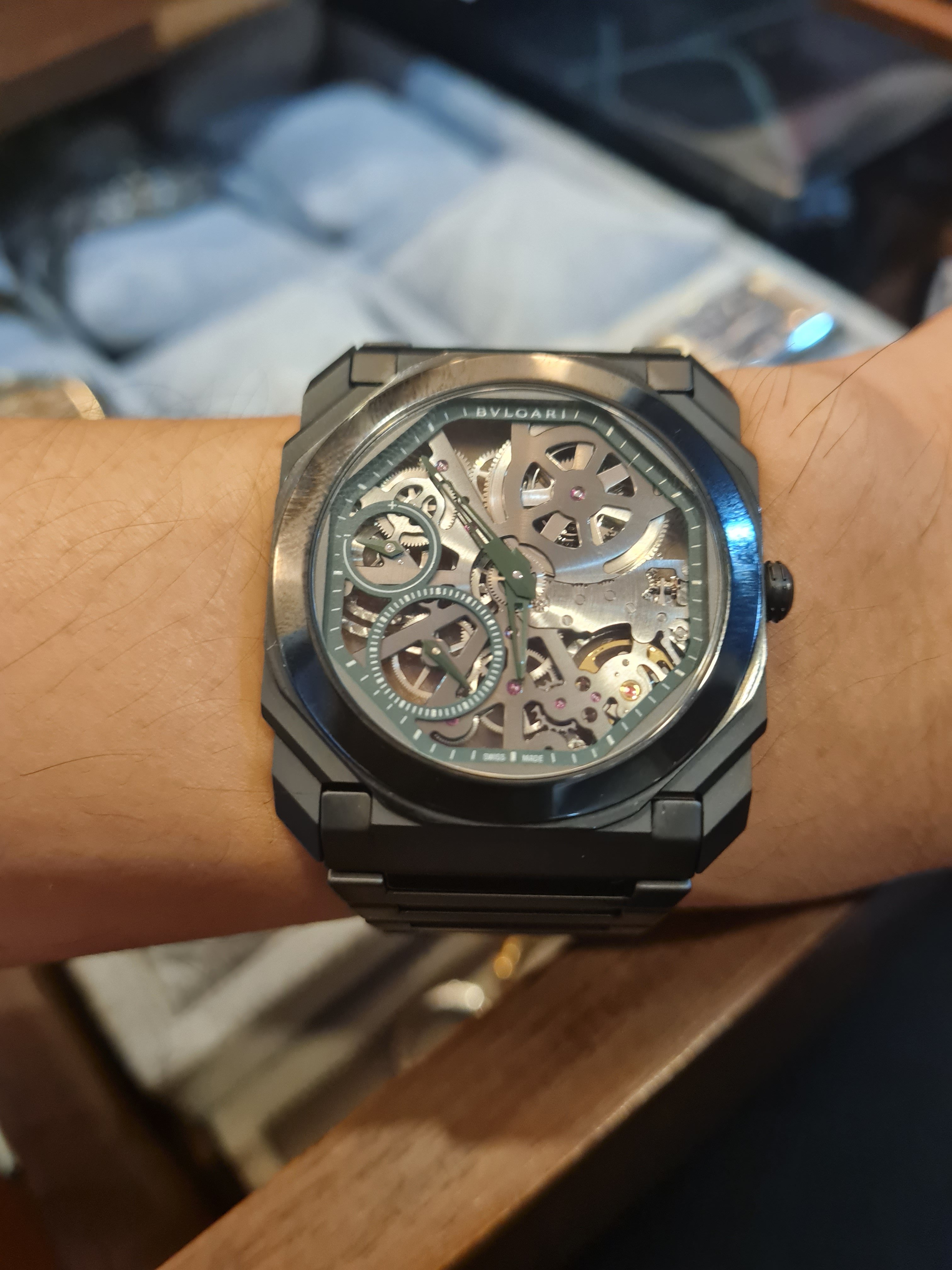 Here is the Octo Finnissimo Skeleton Harrods Limited Edition (1 of 12) black ceramic. Green is my favourite color and this is my first ceramic watch. This thing wear so comfortably, and its unlike any watches out there. Quite hard to read the time though, lol. Because its ceramic, gotta be a bit careful wearing it. If they make an Octo steel with green dial, i might just have to sell my AirKing to get another one, lol.