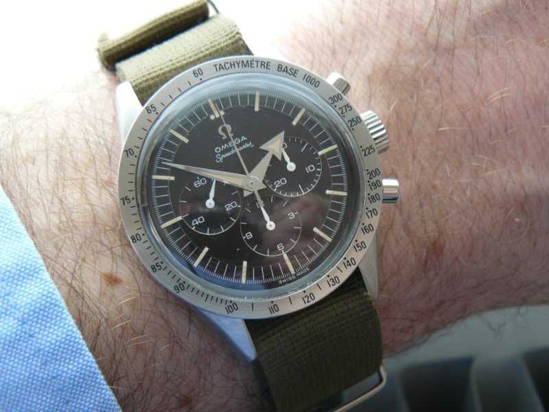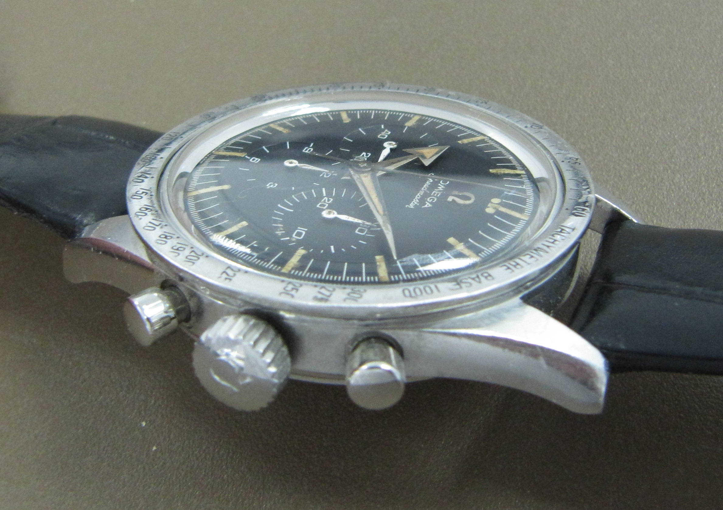 Fools rush in where angels fear to tread and before I knew what I was doing I had wired more money than I have since admitted to my wife to a bank in Canada and was anxiously awaiting delivery. I've been completely fascinated by the watch since it arrived and wore it daily until I found someone who would service it. Spacefruit and Flame (thanks guys) advised me to take it to Swisstec, the division of STS that doesn't have to send 321 movements to Bienne for a service. I picked the watch up yesterday and am completely delighted by the work of the incomparable Simon Freese and his colleagues. A modern steel bezel has been lathed to give a more aged and less obtrusive look, correct pushers and crown sourced, the dial (modern service replacement as it turned out) sympathetically aged and the scratches in the original crystal buffed out.
