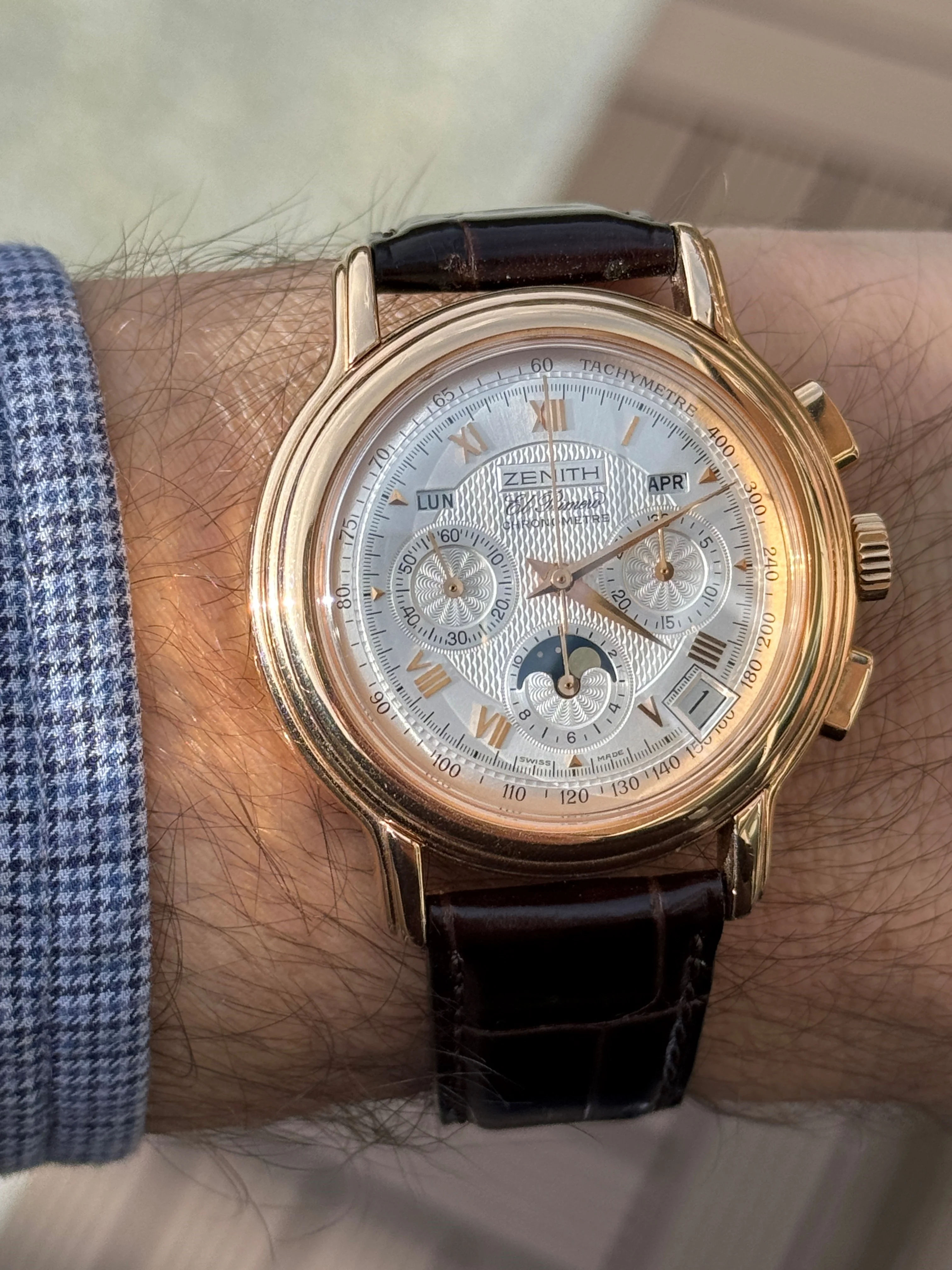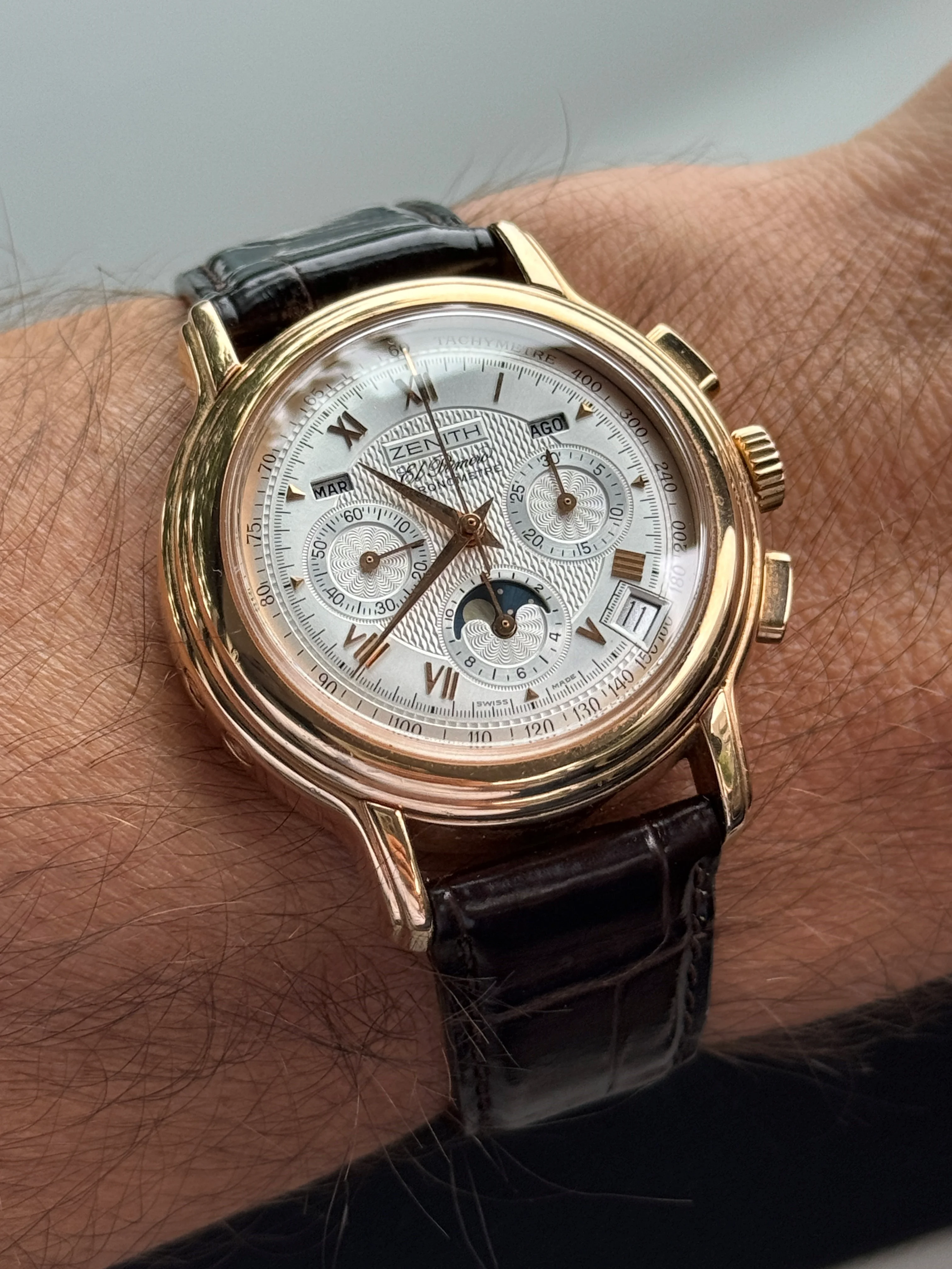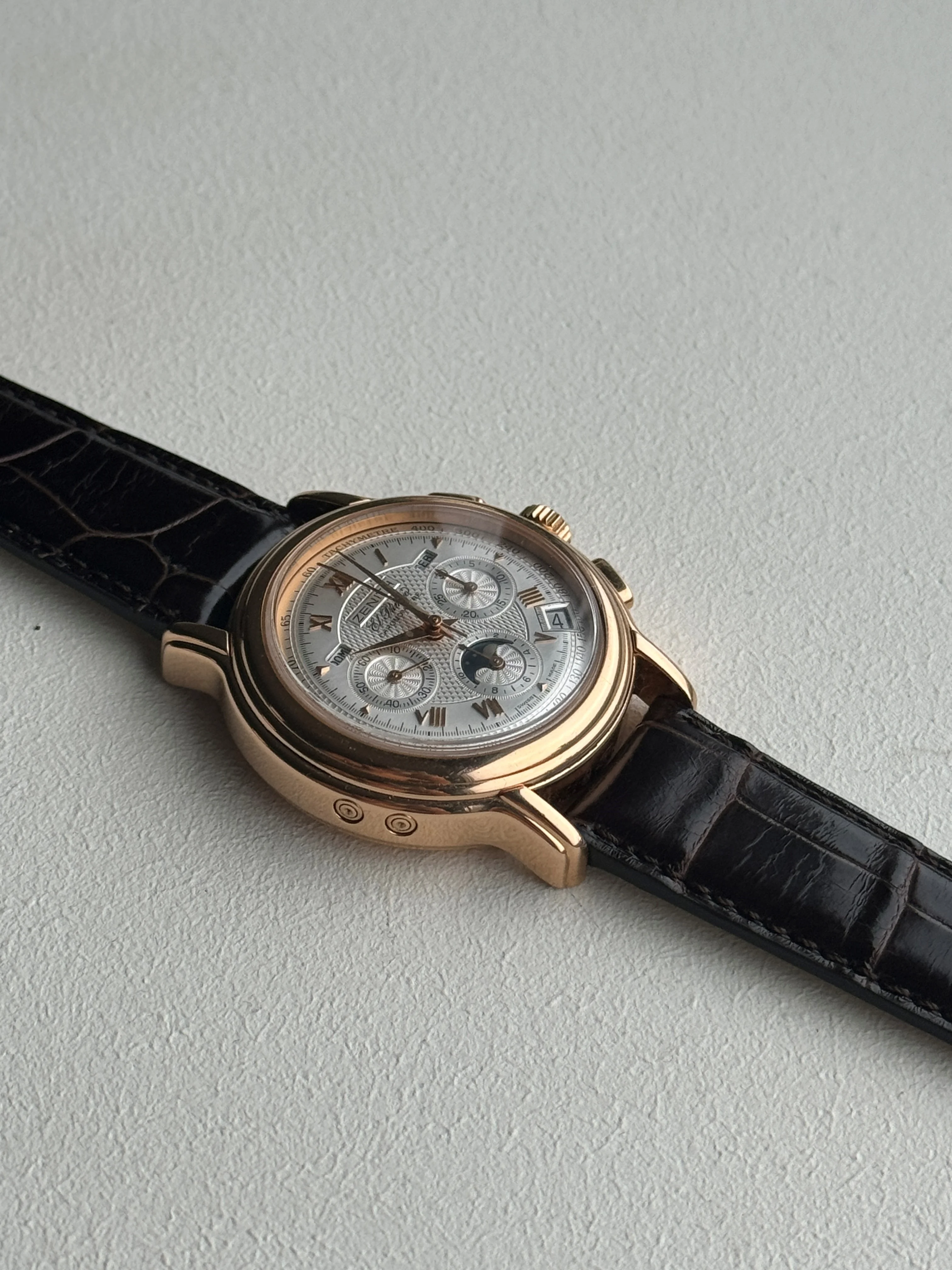 This watch is in excellent condition. The guilloché dial is flawless, and the case is also in superb shape. The sapphire crystal on both the front and back is scratch-free. The renowned El Primero movement in this model offers not only a chronograph but also day, date, and moon phase functions. Additionally, this version is chronometer-certified, and the set includes a copy of the COSC certificate. The watch retains its original signed crown and the original 18k rose gold tang buckle.