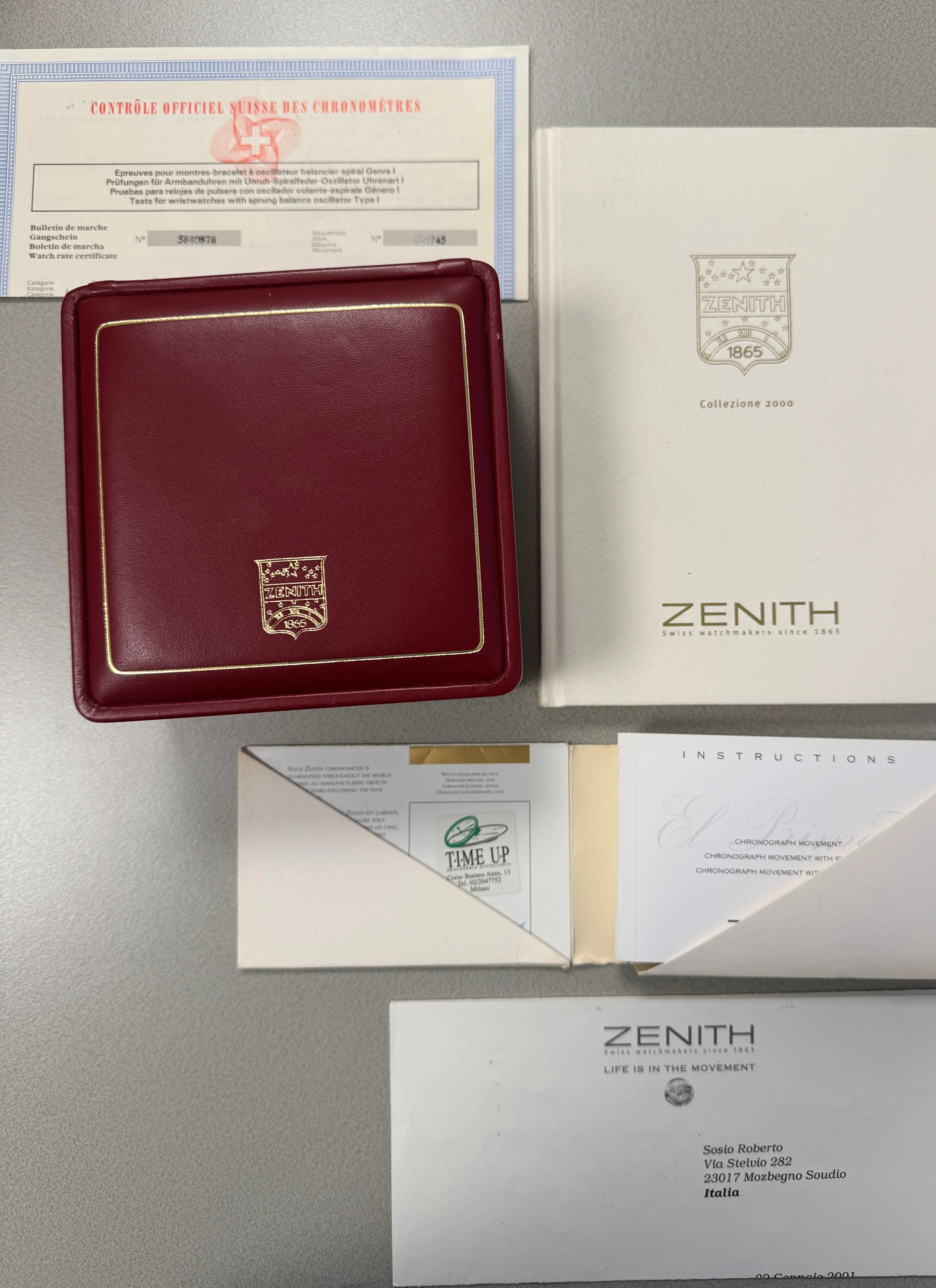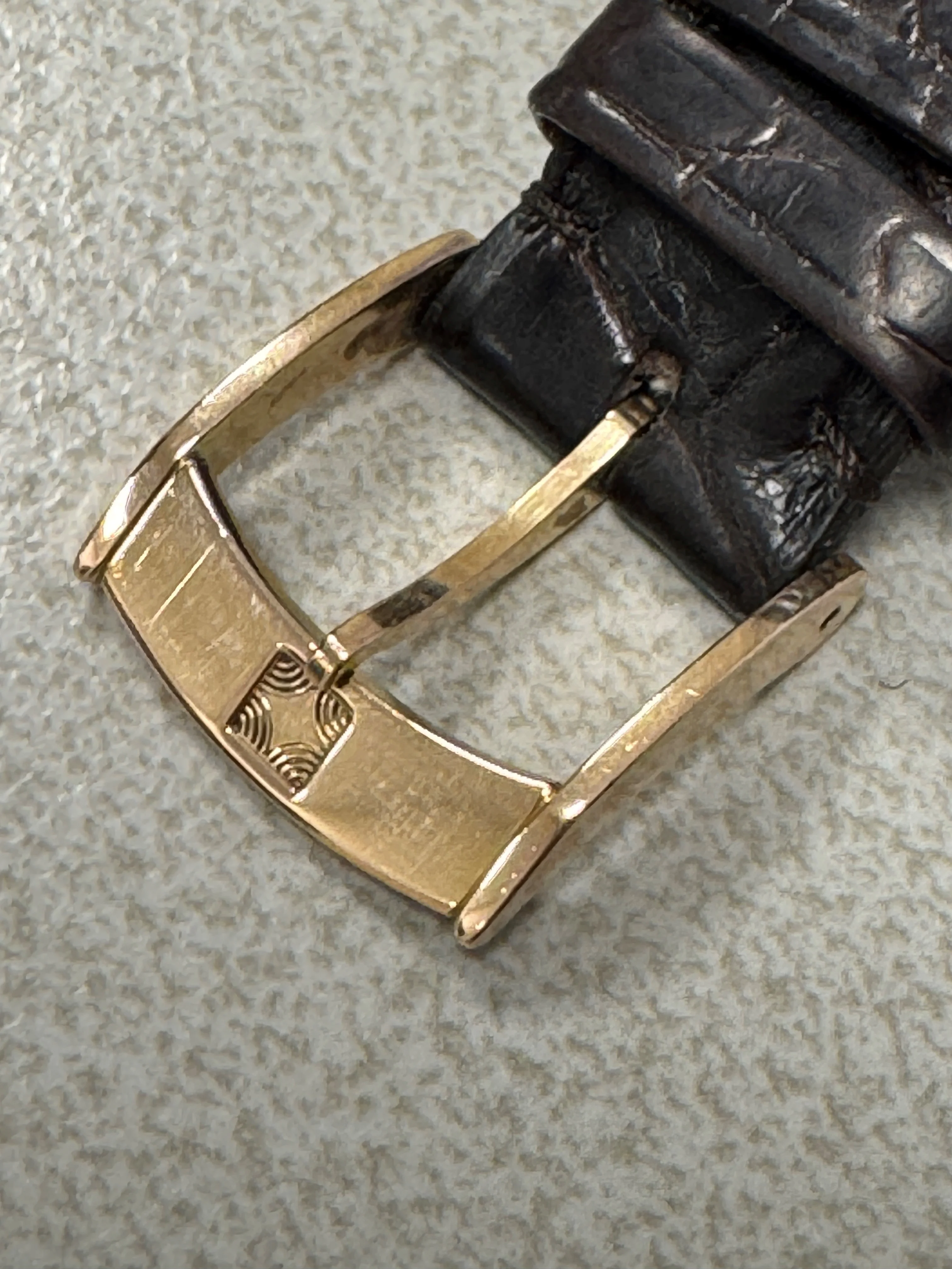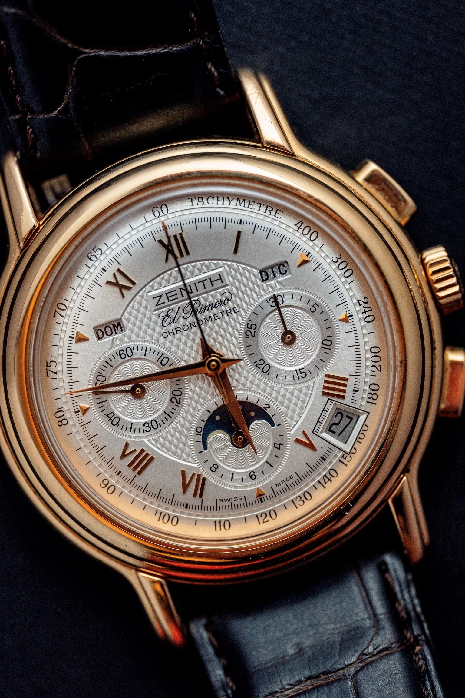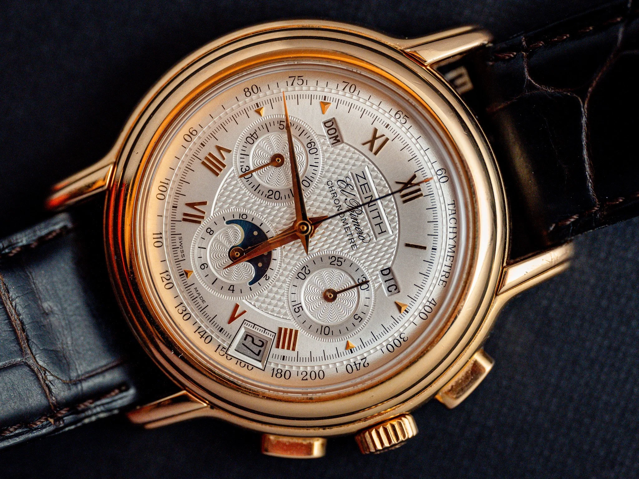 This watch is in excellent condition. The guilloché dial is flawless, and the case is also in superb shape. The sapphire crystal on both the front and back is scratch-free. The renowned El Primero movement in this model offers not only a chronograph but also day, date, and moon phase functions. Additionally, this version is chronometer-certified, and the set includes a copy of the COSC certificate. The watch retains its original signed crown and the original 18k rose gold tang buckle.