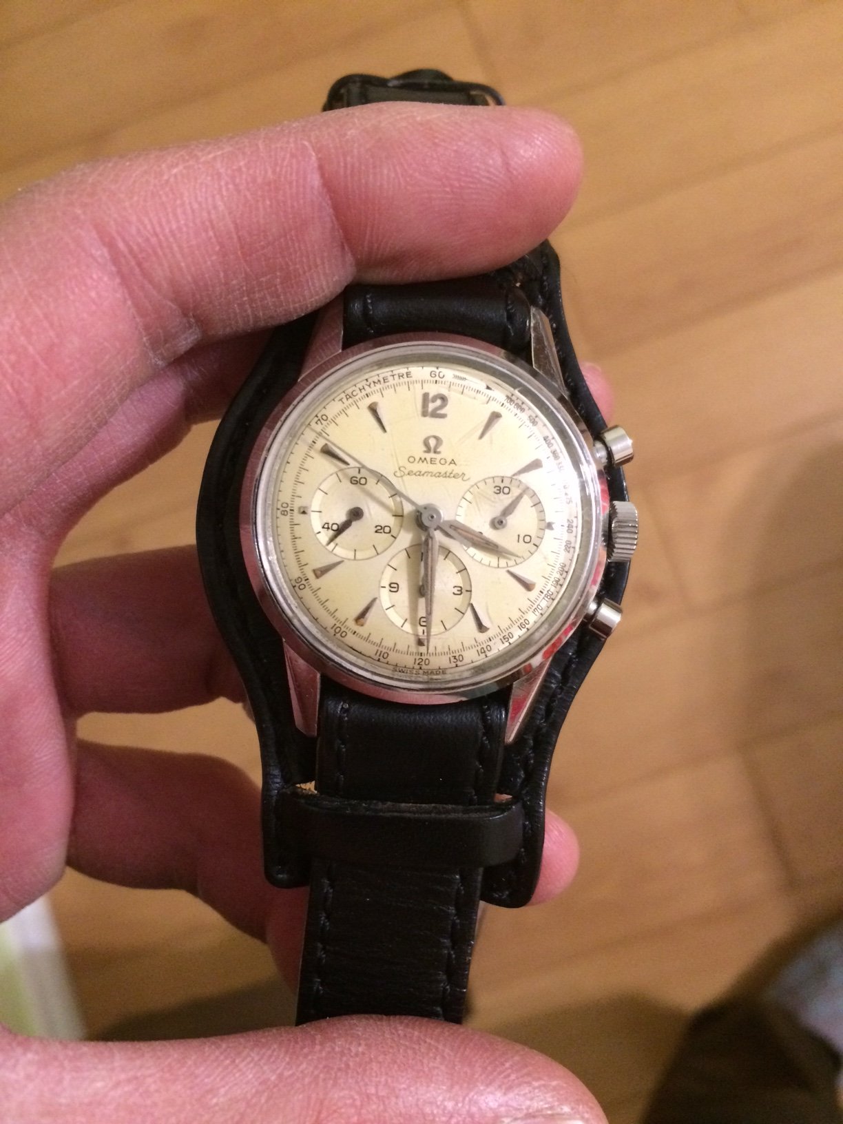 Picked up this watch in a trade a few weeks ago. Incredibly lovely dial and alpha hands. Everything looks original (dial, all hands, pushers, crown, caseback) except the movement number (11.4xx.xxx) is too earlier for this ref (CK2947). My assumption is that this is a marriage watch and it is priced accordingly considering prime examples of this watch have been going for 3500-4000. Keeps reasonable time (+20ish) with about a 45 hour power reserve. Chrono runs 100% and resets perfectly to zero. Main hands have a slight misalignment by about 8 minutes (ie the minute hand gets to noon about 8 minutes before the hour hand). This is shown clearly in the photos. Original case back shows "WATERPROOF" and "SEAMASTER" through it is faint. Watch head only.