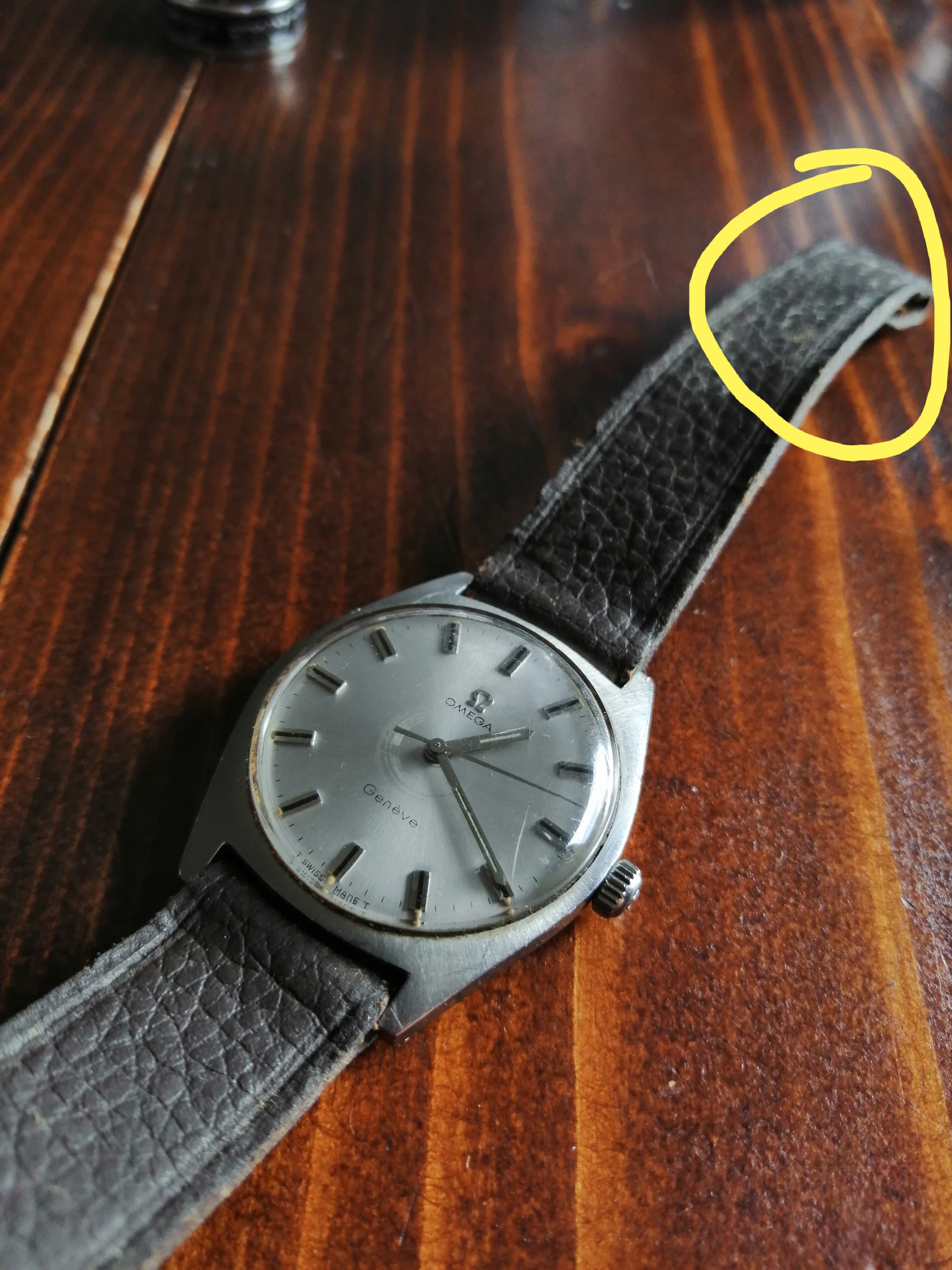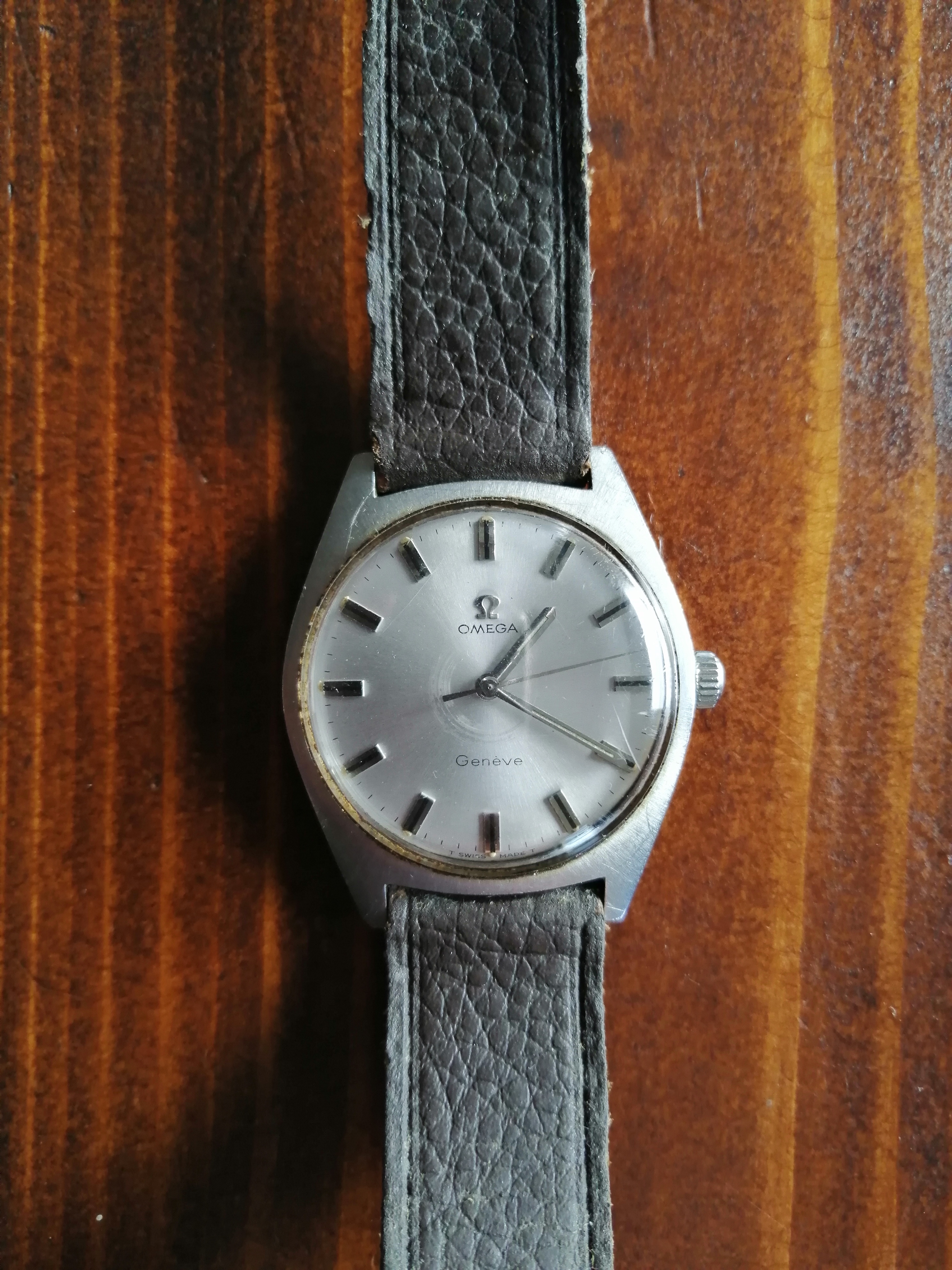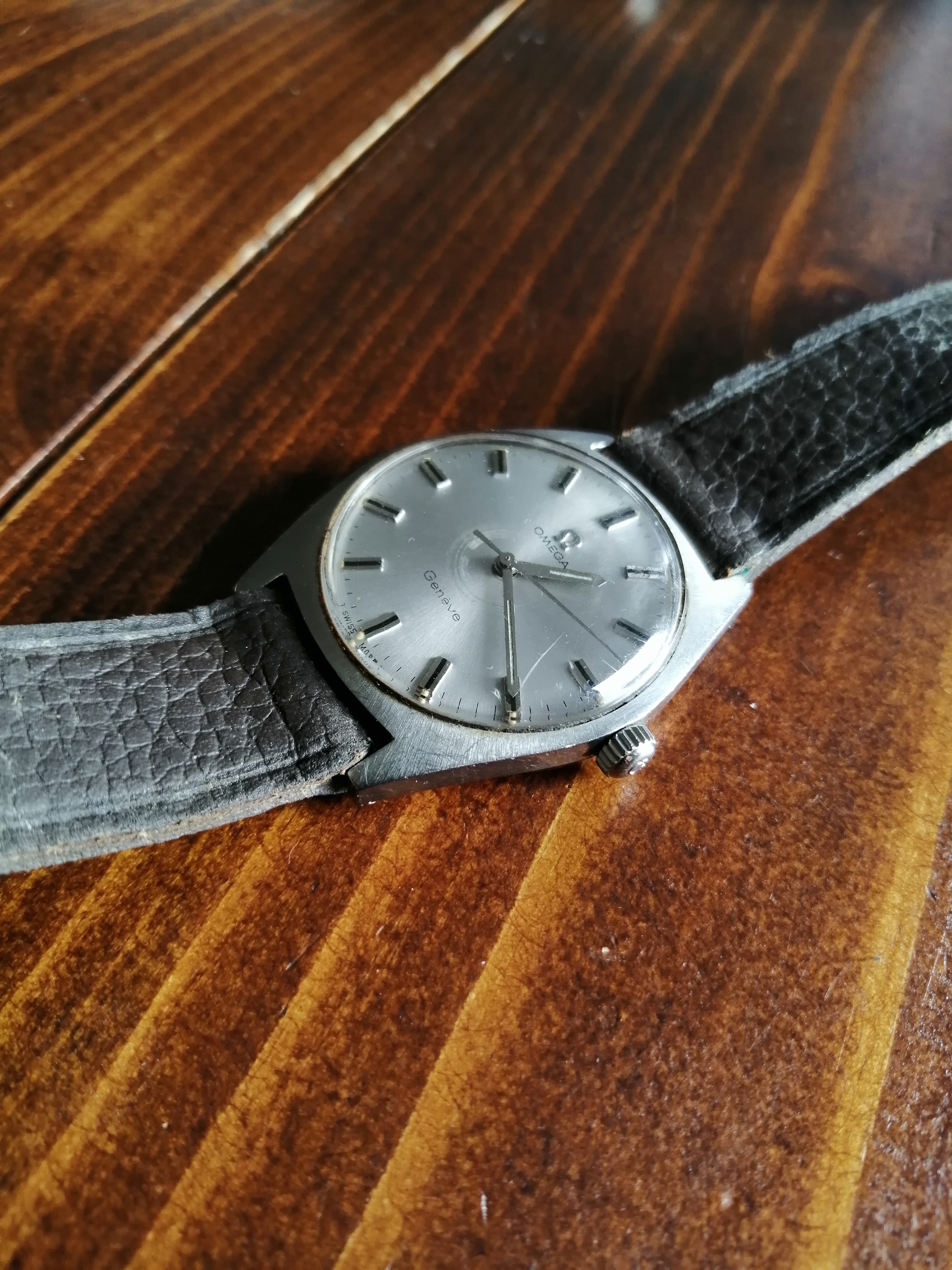 It's a waterproof stainless steel Genève with no date with a dark leather band (which definitely has to be swapped for a new one). The watch only works if lightly shaken so I will have to get it fixed (I know a very skilled guy or two who could do the job) and it needs a good polish. While I wait for the watch to get opened so to read the serial number, does anyone know which model and year this could be?