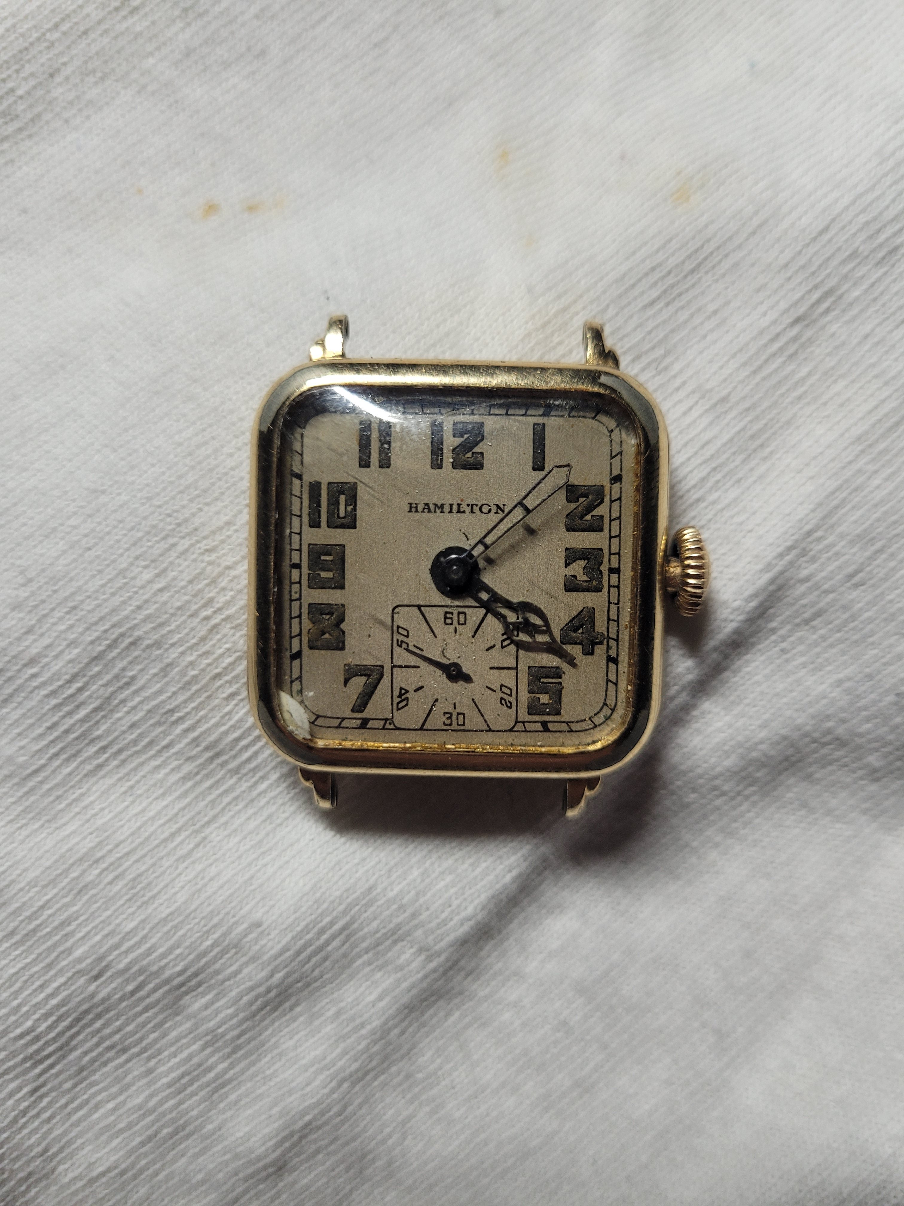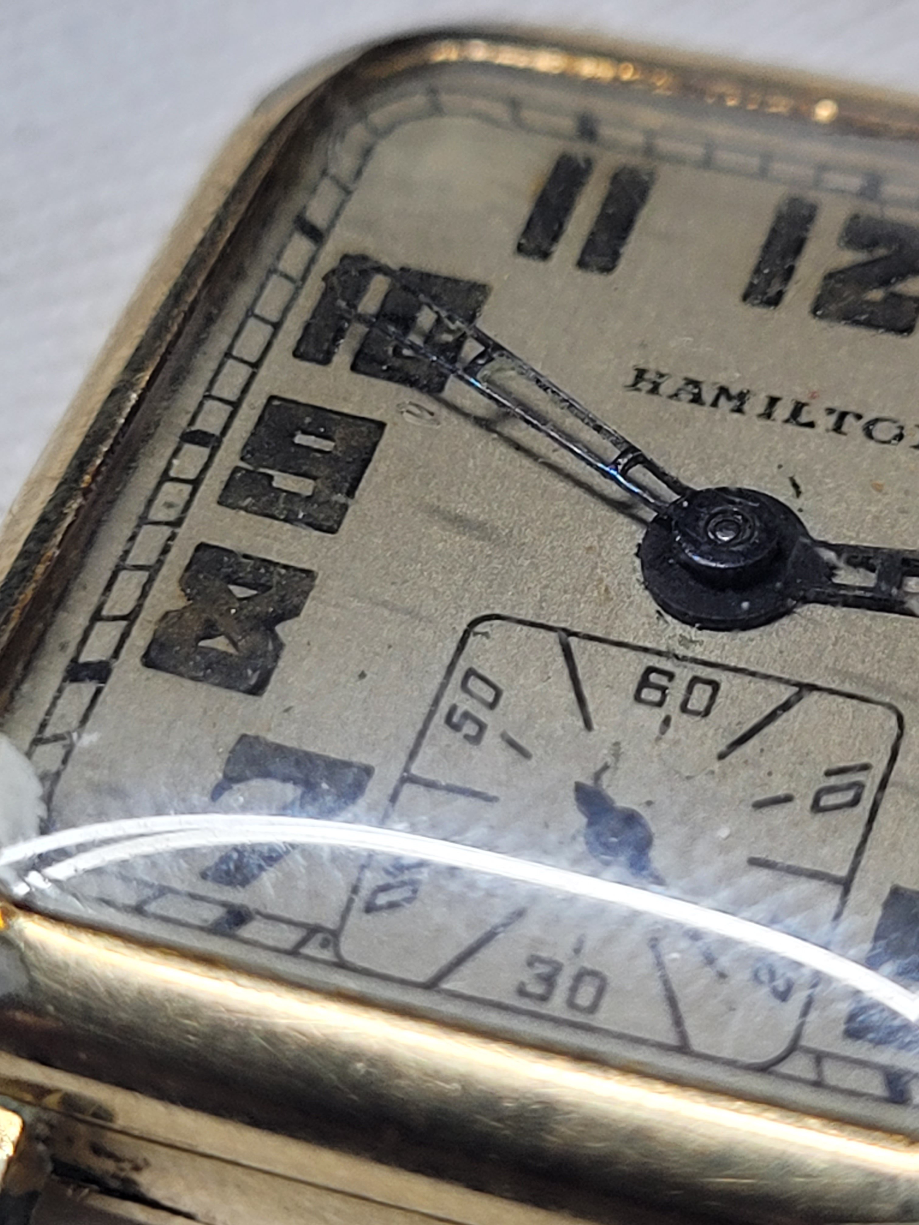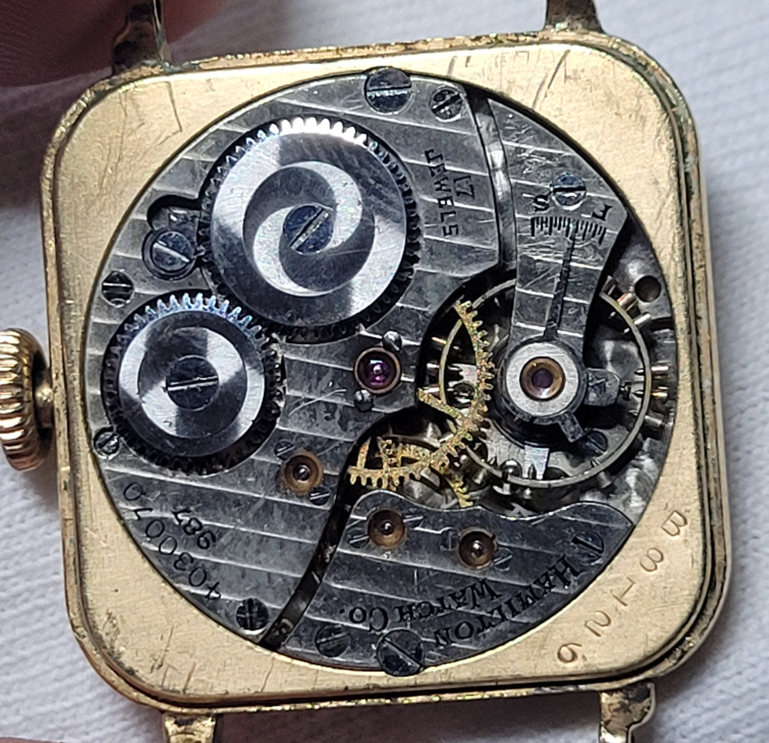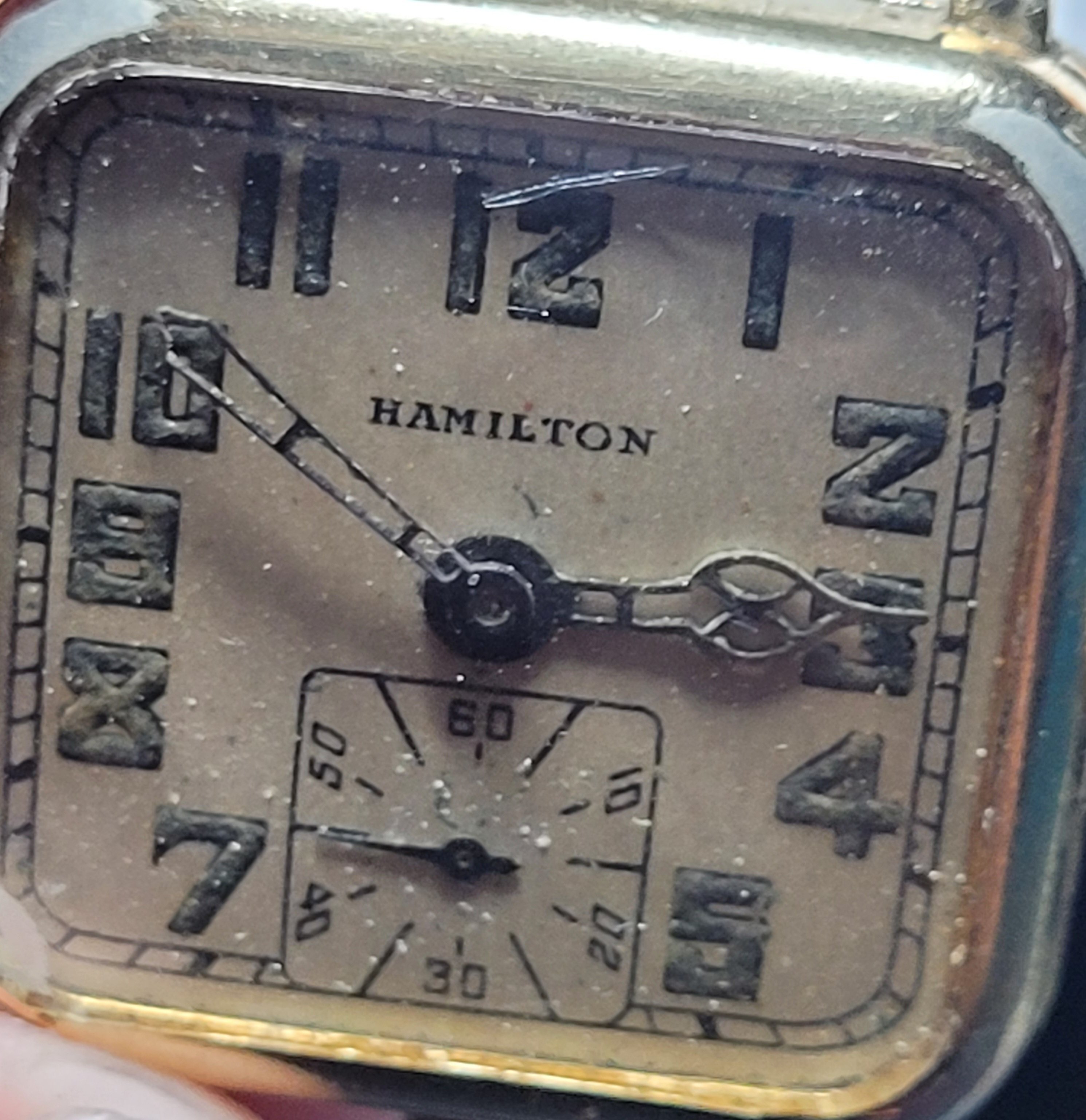 ·Going through more of my grandfathers things and came across this neat but very old looking square Hamilton watch. Watch was not too happy to being wound so I immediately stopped when I felt resistance when I first tried. It did start running but needs a very good service. Was able to open it up. Hopefully the inside will help too. I tried looking up the general serial number which looks to put it in the 30s? Everything on the dial looks original. I don't think it was ever touched? Funny enough when I shined a bright light on it and killed the lights. There was a tiiiiiiny bit of glow on the very edge of the minute hand. would definitely like to keep it and wear it on occasion. So I'll have it serviced. Hopefully they won't touch the hands since I love how they look. Thanks in advance!