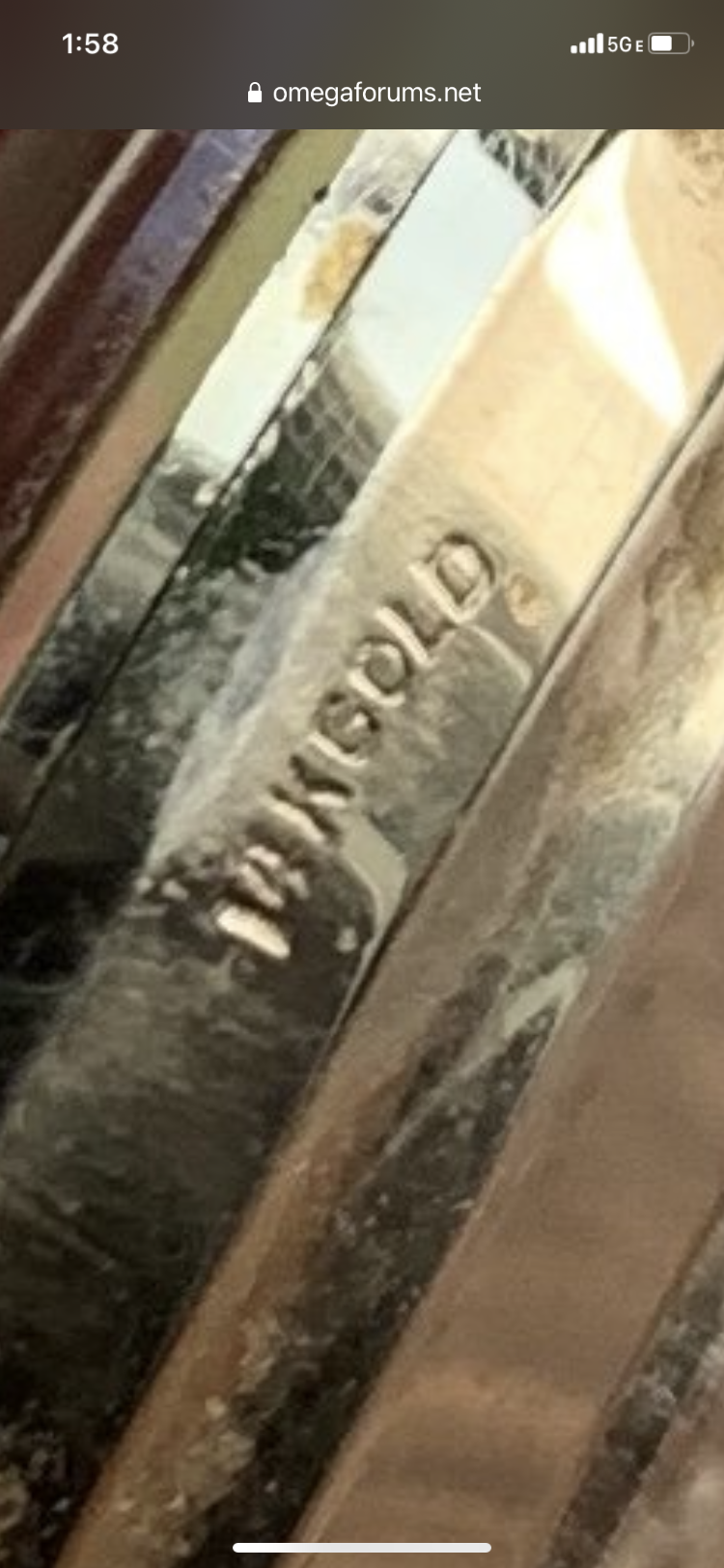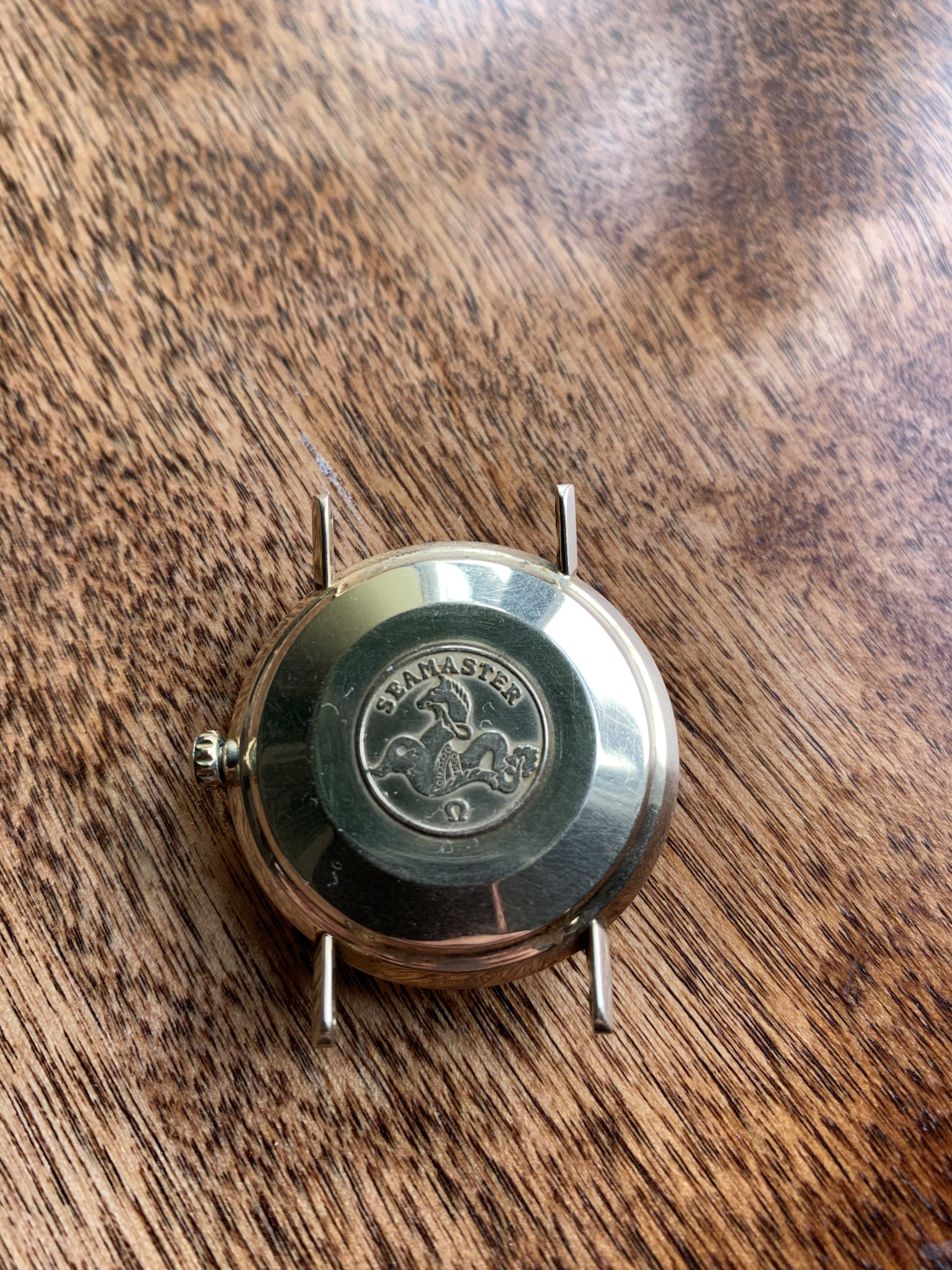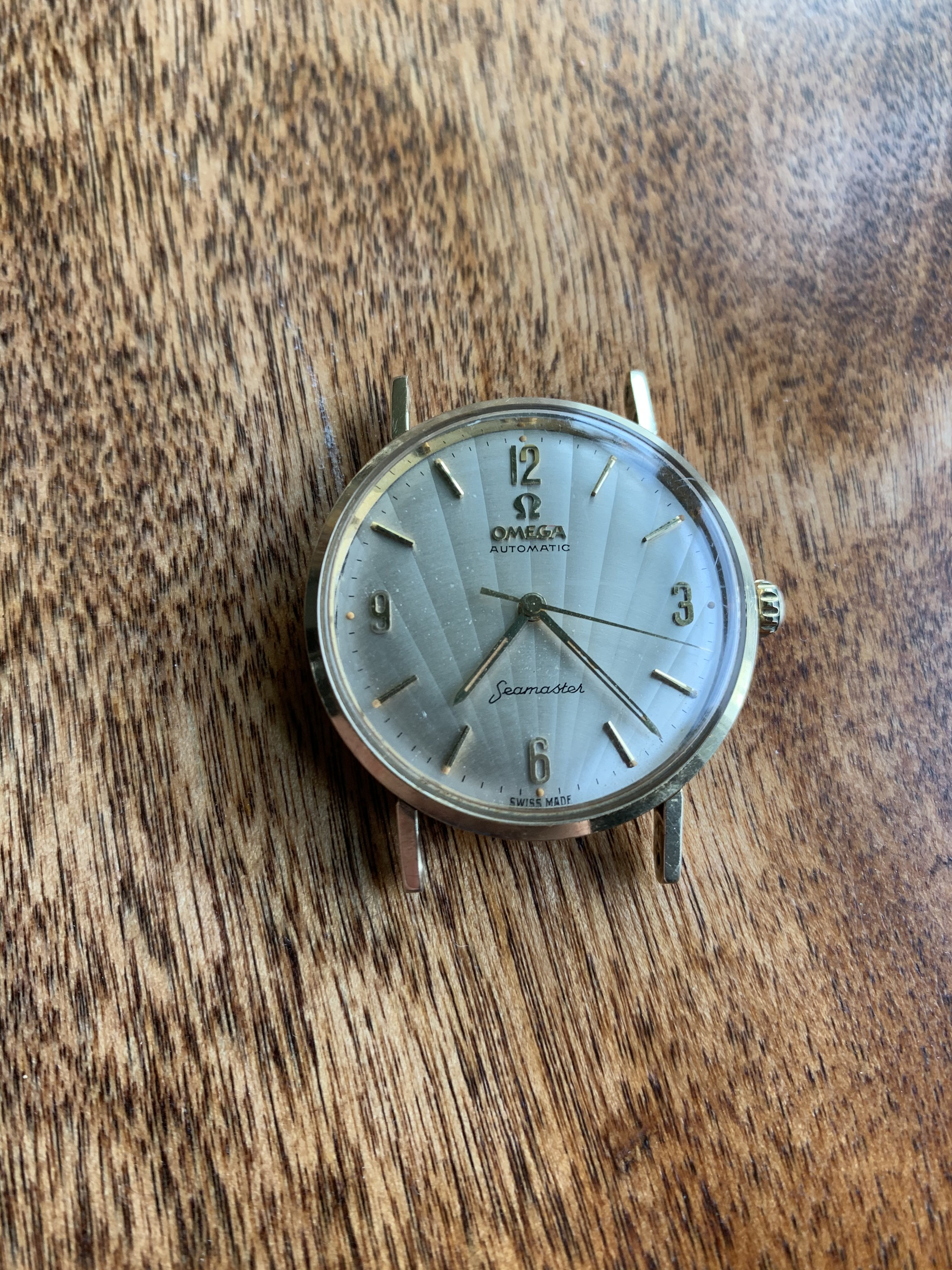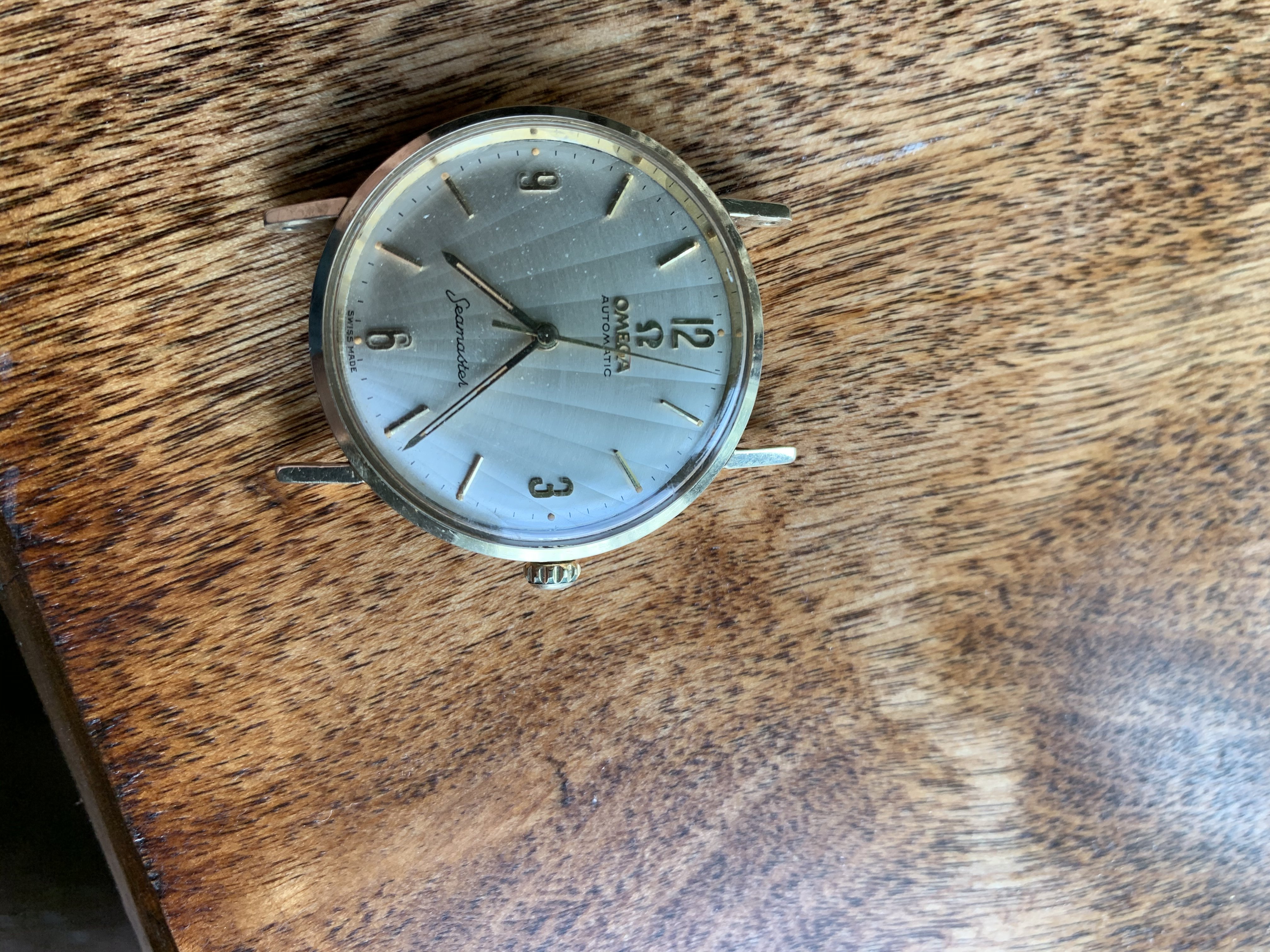 ·I was recently given a box of old watches from my grandfather who is moving into a more assisted living environment and did not think it was prudent to take much with. Inside were some old pocket watches, a mid 1940’s Tissot, 1950’s Eterna, and this somewhat suspect Omega Seamaster. The Omega seems suspect because I have never seen an Omega with a dial like this, the crown looks a bit off to me (just in general), the gold OMEGA logo looks a bit off... etc.