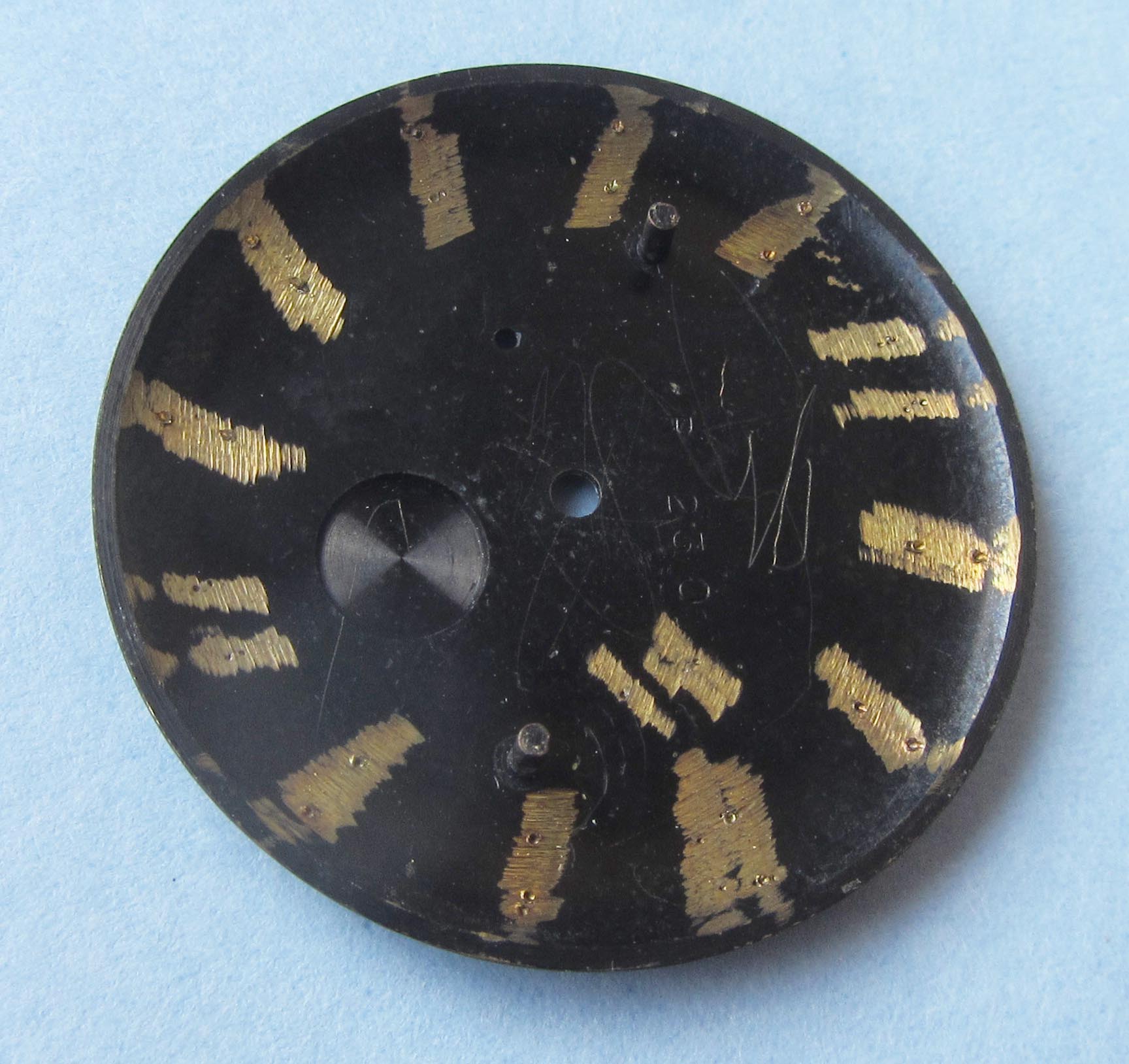 On the third dial, I wonder if the golden sections, in between the hour markers, are embossed rather than applied. Also, I am intrigued that the reverse is not black. Maybe the black on the front was not applied using a galvanic process.