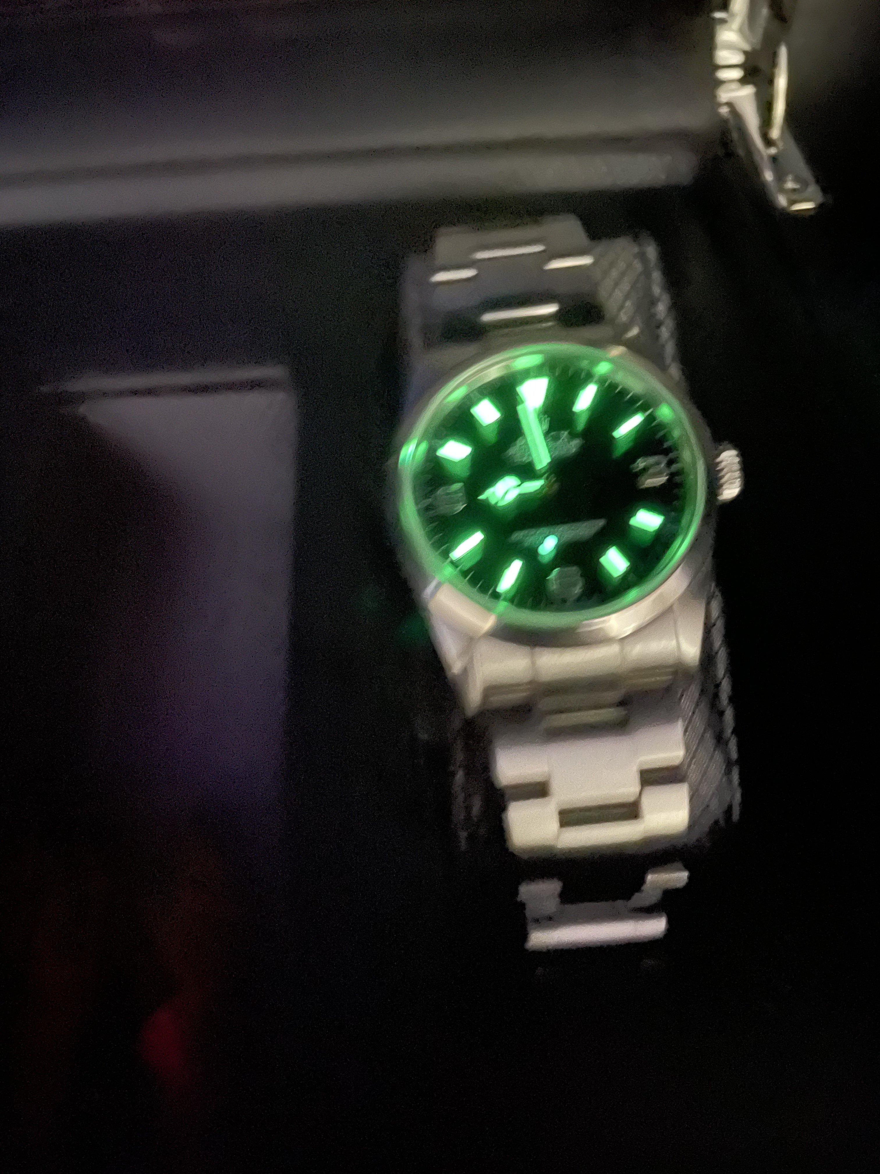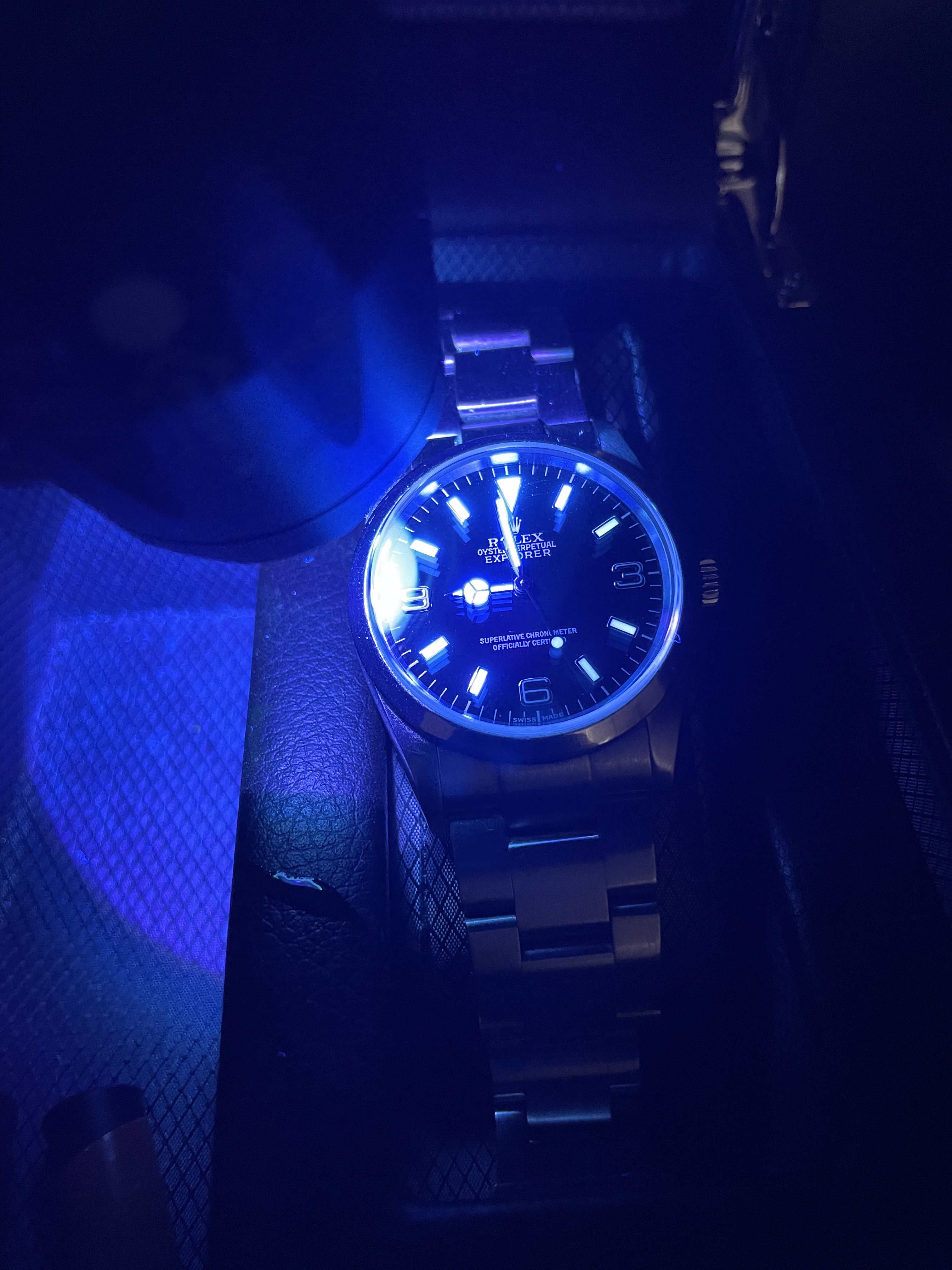 ·Got a question that has been bugging me for a few weeks. I got a UV flashlight to charge the lume on my watches before I go to bed. I noticed something odd on my Rolex Explorer from the early 2000s that has a SuperLuminova dial/hands. While it glows green (like I expect), it is distinctly a bright blue when under the UV light. See the attached pics. Every other watch I have with SuperLuminova Is the same green under the UV light as it is after I take it away. Only the Rolex is different.
