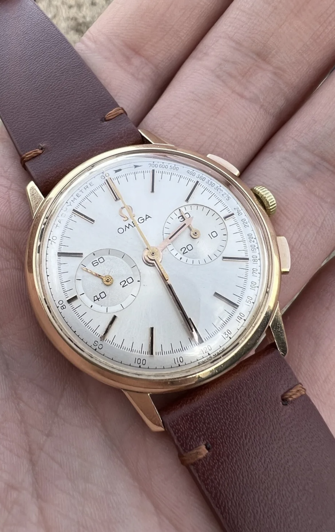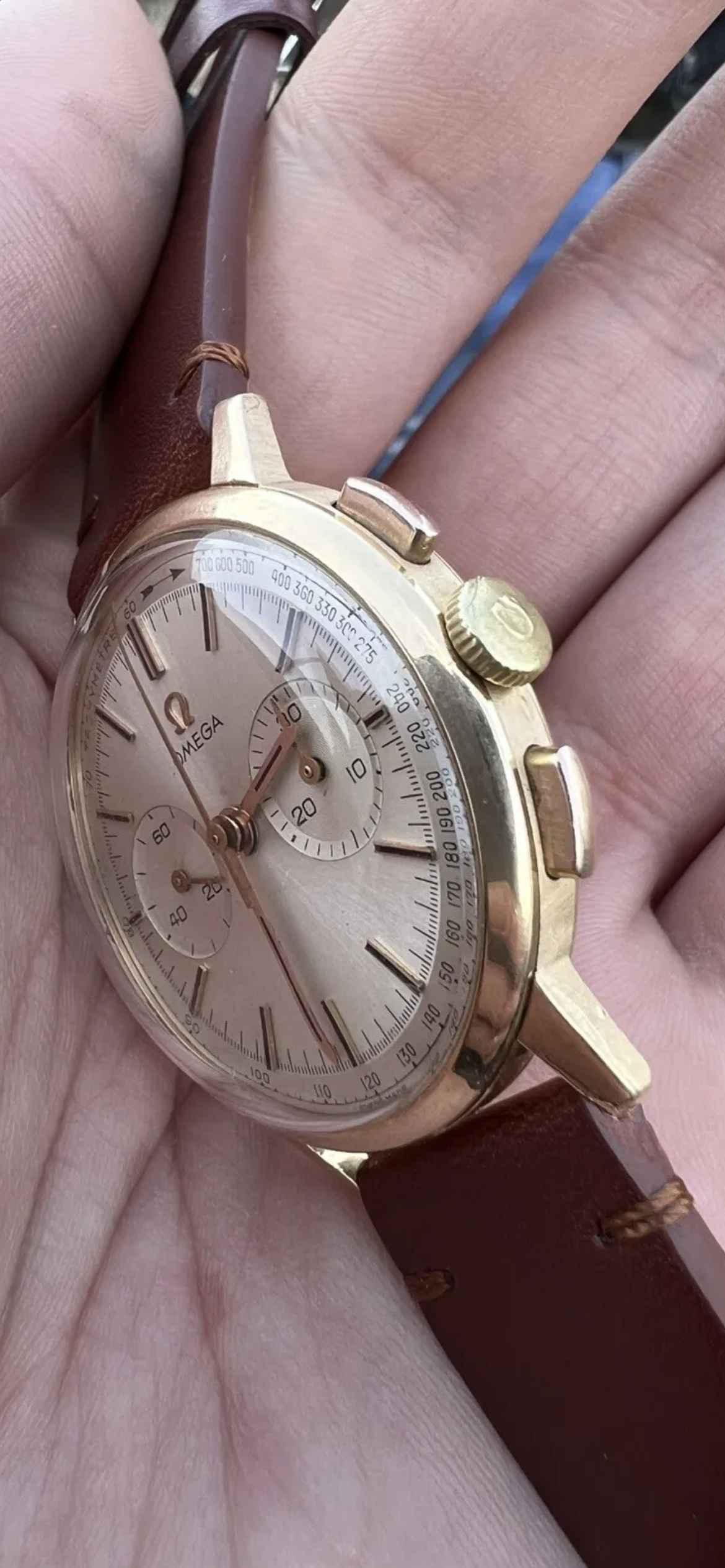 Iv won this Omega 101.009 18k gold on eBay which is €1.2 cheaper than the buy it now price. I requested day light pictures which look less sharp than the add, the dial looks in decent condition, slight wear at 11o’clock. But I think the crown is a replacement although Iv been told it’s original, what you think? Seems a different tone gold Also some bad deterioration on the second chrono hand. Let me know your thoughts I’m a little hesitant if it’s not original. From research I think a fair value would be €2k-3k?