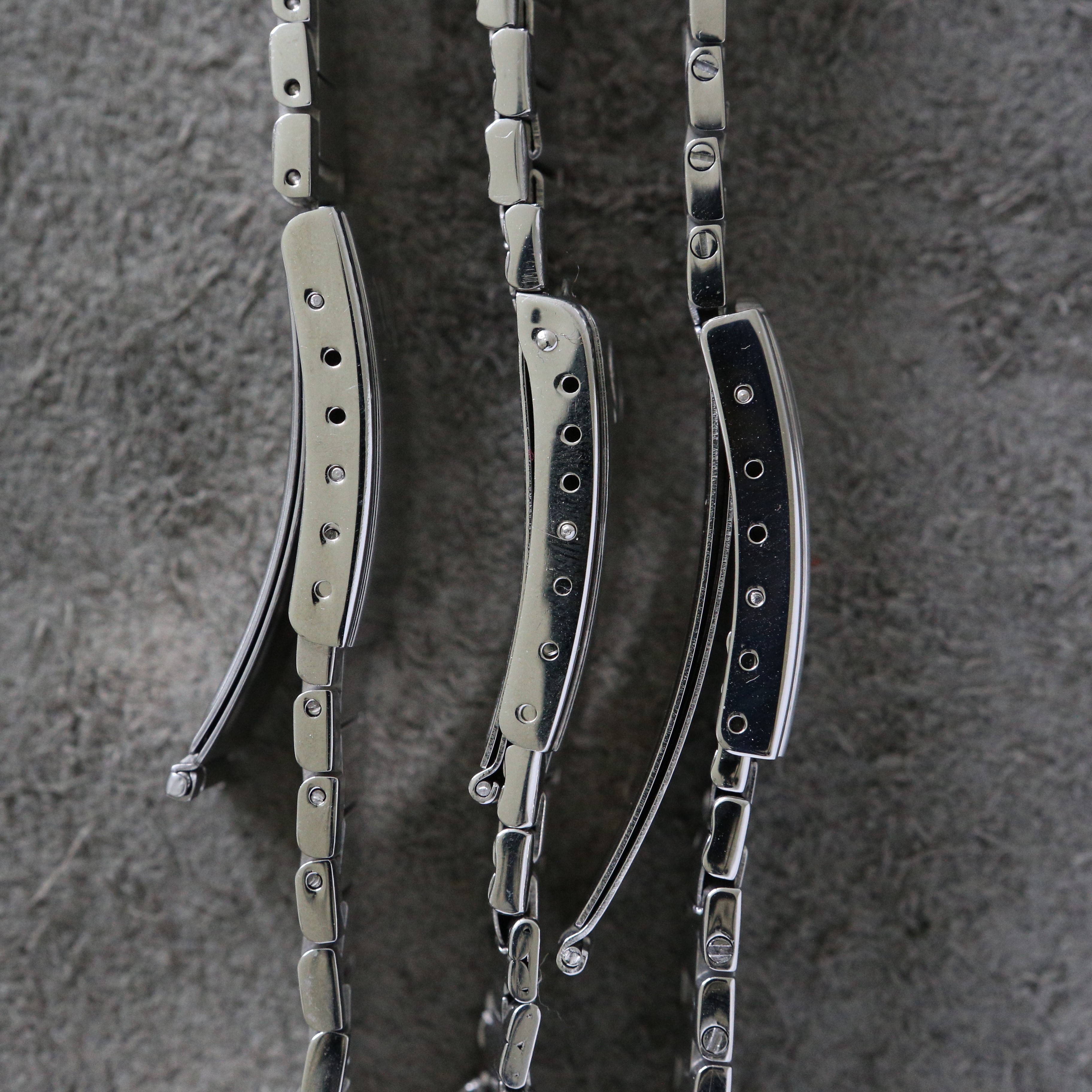 Side-on view of the clasps and links. Biggest difference to be seen here is the mechism by which the bracelets can be resized : US uses pins, Omega uses those funky disassemblable links (which are very easy to disassemble and reassemble once you know how), and FB uses a secure and independant screw system. Its much clearer to see in this shot the 'tightness' of the Omega, and how without tension some of the links are automatically rotated by an angle.