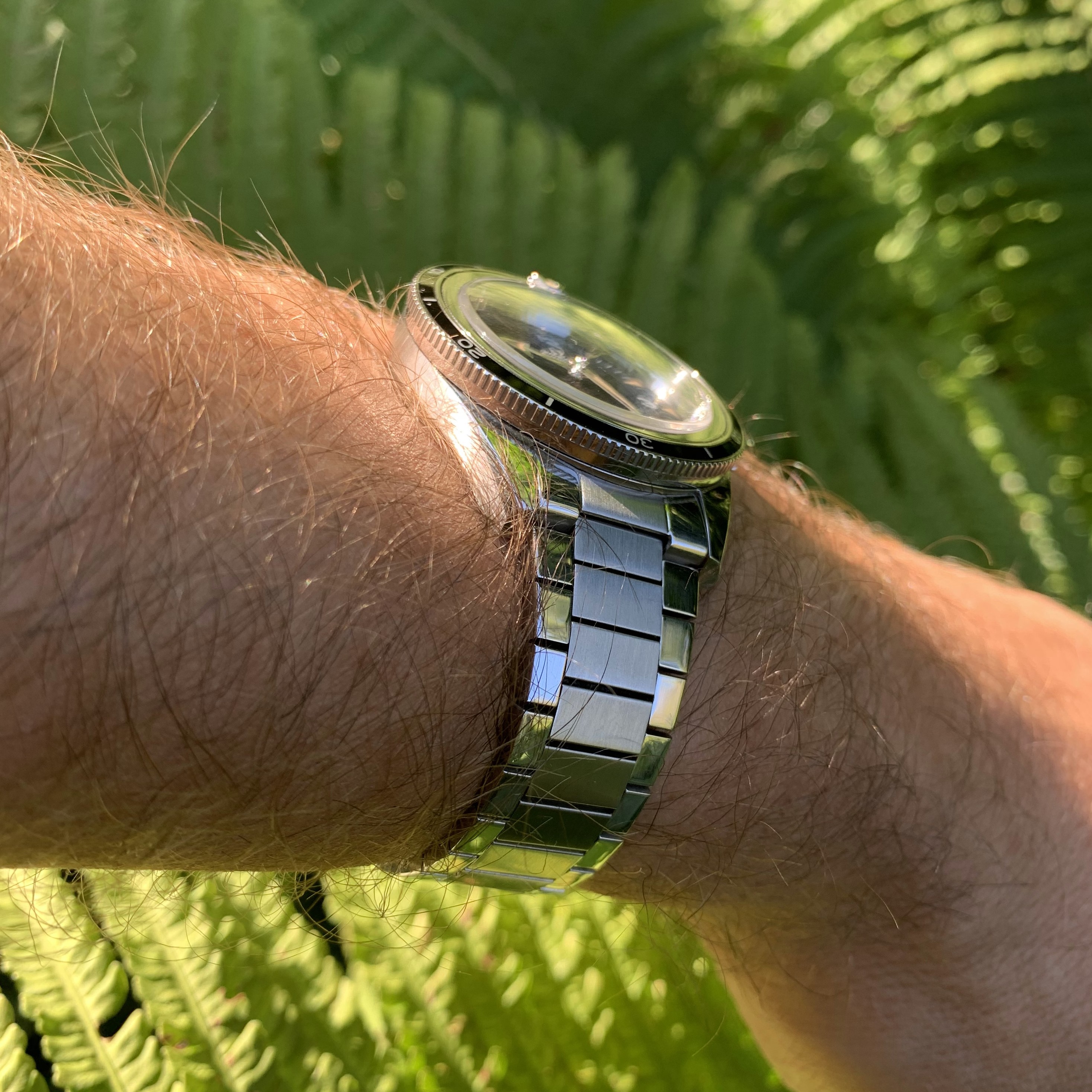 This also looks great and fits tight without play, however, the bend of the endlink (around the springbar) sits a bit too high on this watch for my liking. Perhaps it could be bent to fit better on this watch. I'd rather not ... it looks great on my Seamaster.