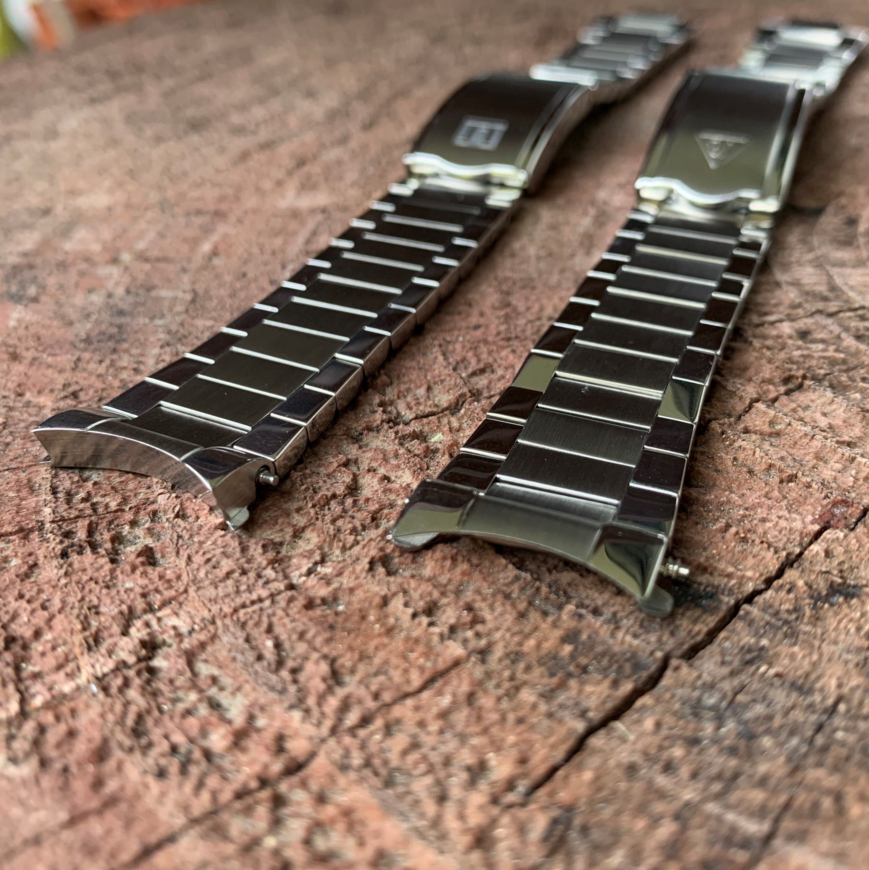 The Forstnerbands looks great...however the only thing that bothers me is the superior height of the endlink to the inside of the lyre lugs. Its very slight here, but looks much more on the Tintin pictured below. Its also worth noting that the last link is slightly narrower than the end-link (which I think looks great).