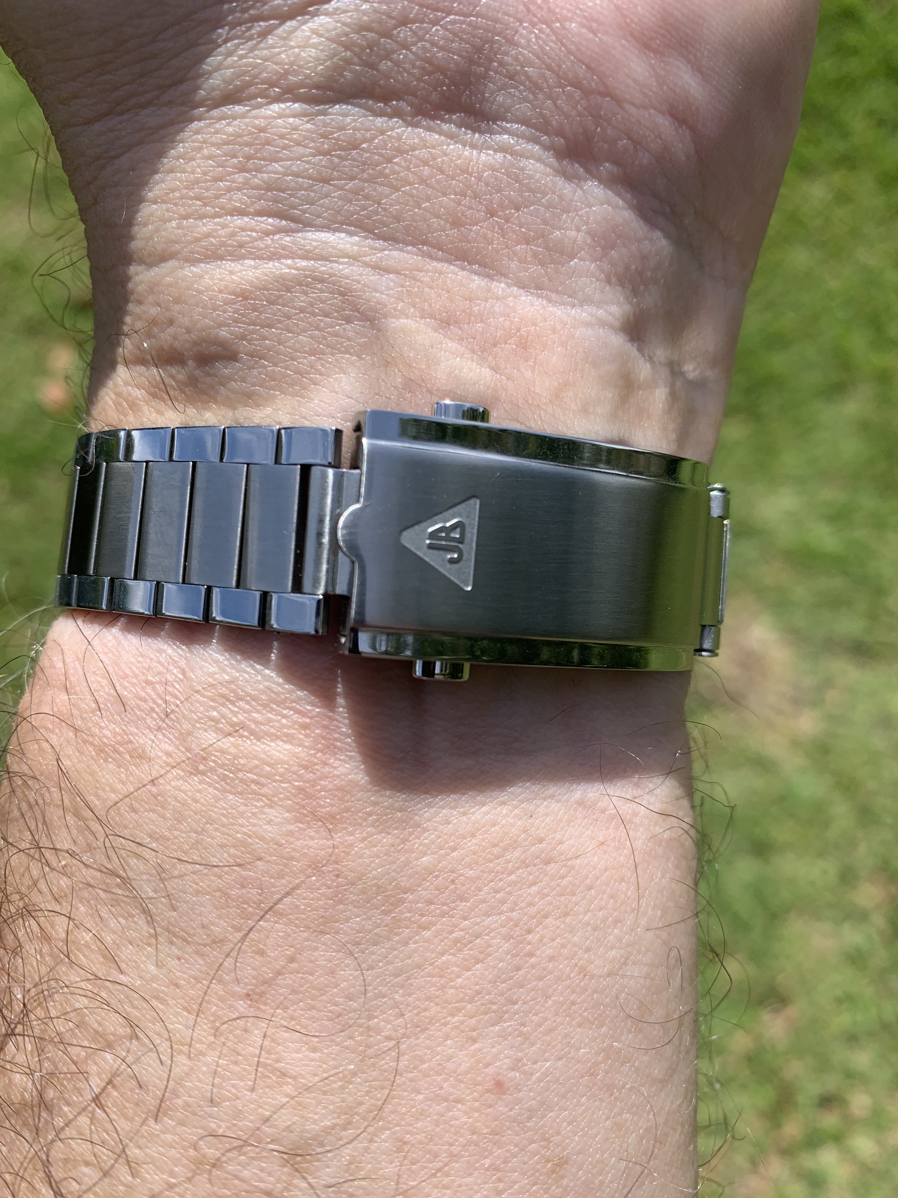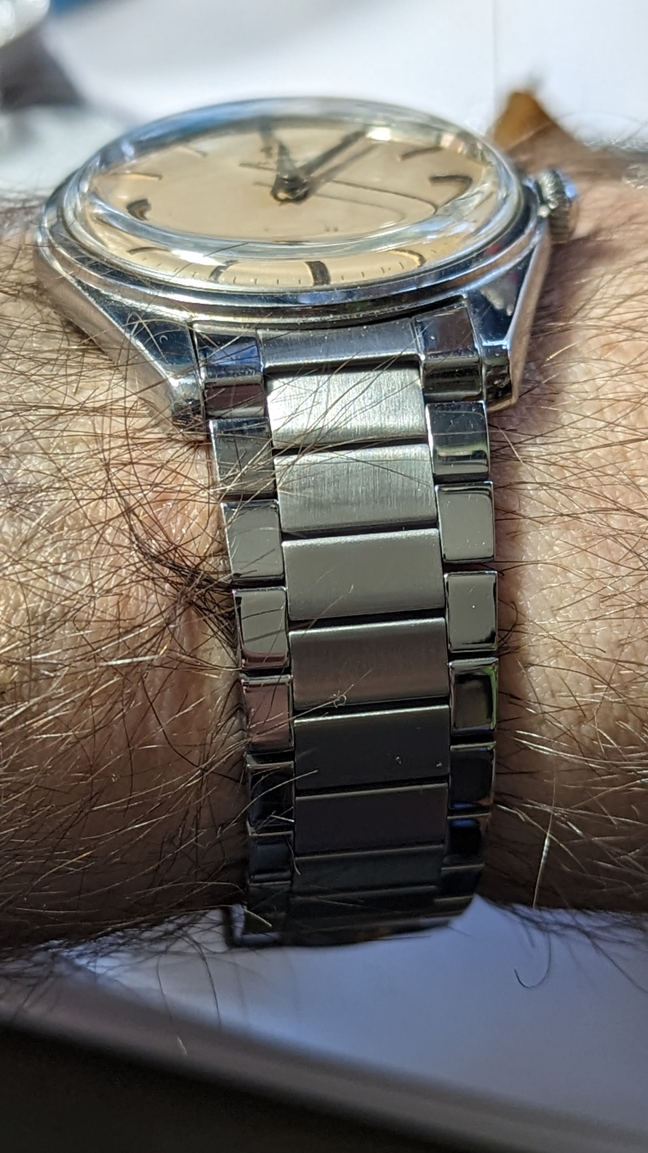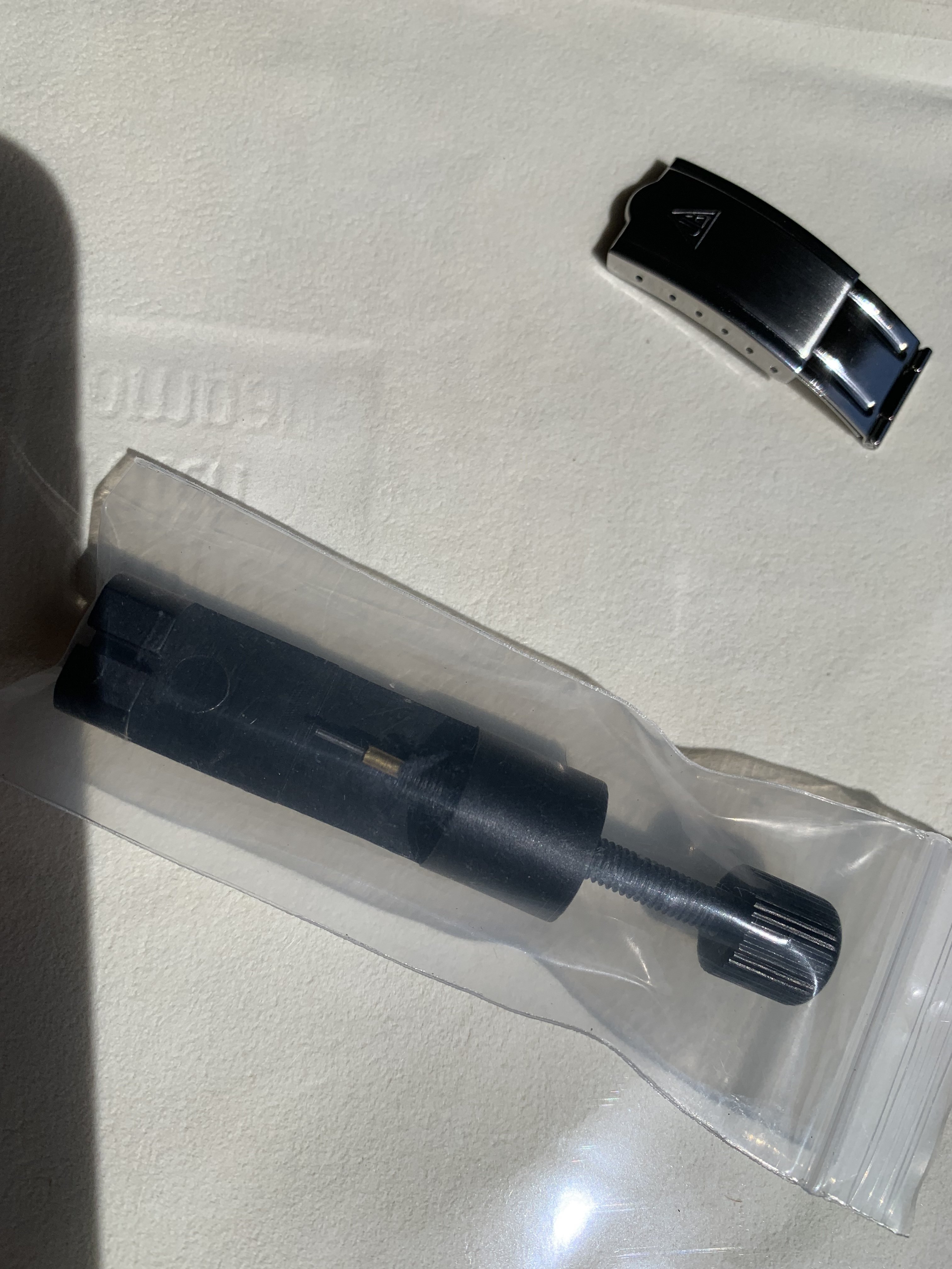 The bracelet I have on my FOIS is not old enough to have the push pins. I think Forstner stopped making those a while back. The $185 Forstner bracelet that comes with the milled clasp doesn’t have the stretch links found on the $150 bracelet I have on my FOIS. Both have solid end links. The 19 mm and 20 mm bracelets are the same bracelet (only the end links differ). The various end links and the milled clasp are sold separately (so you can up grade the clasp or put your existing bracelet on any Speedmaster.