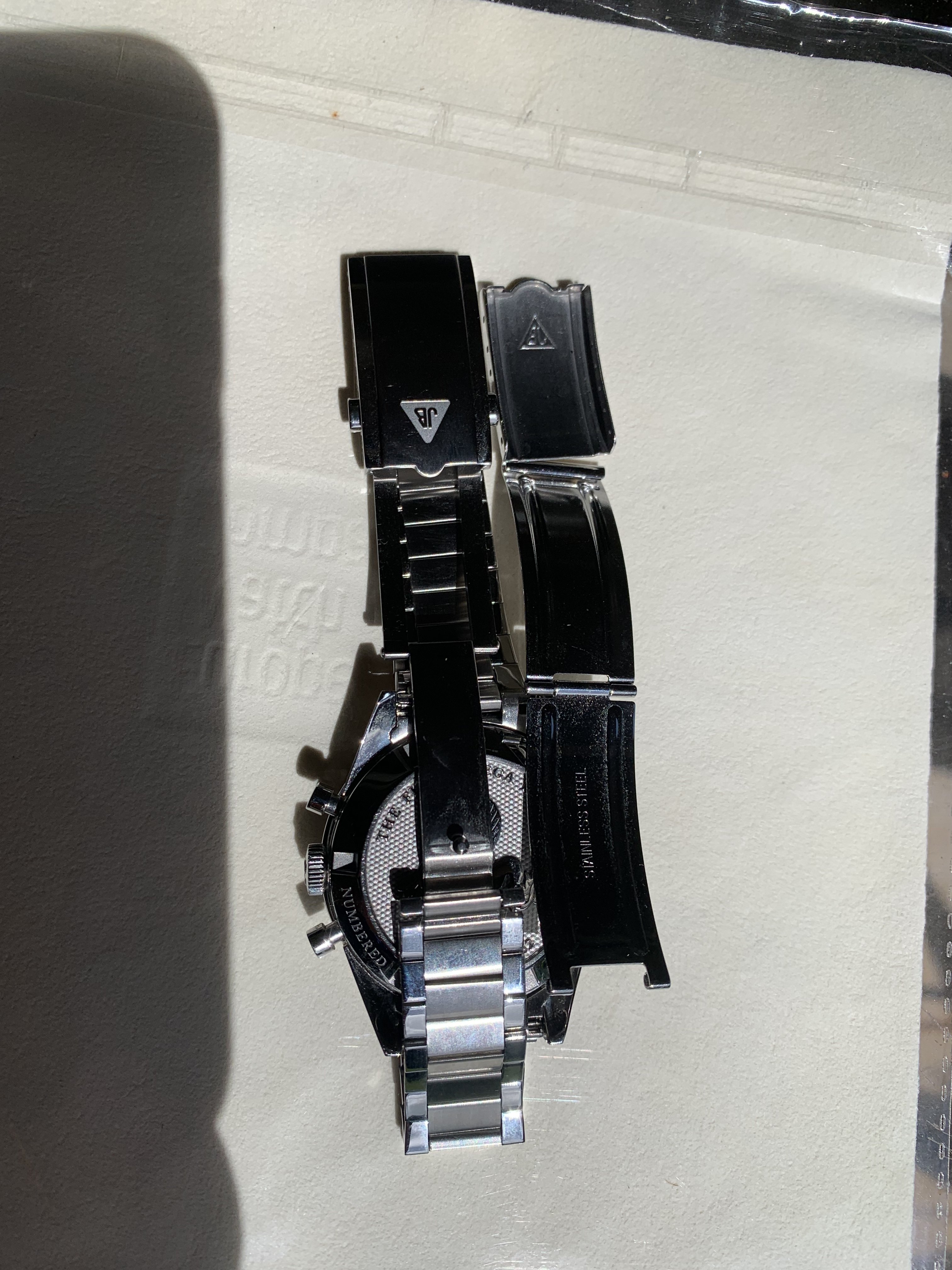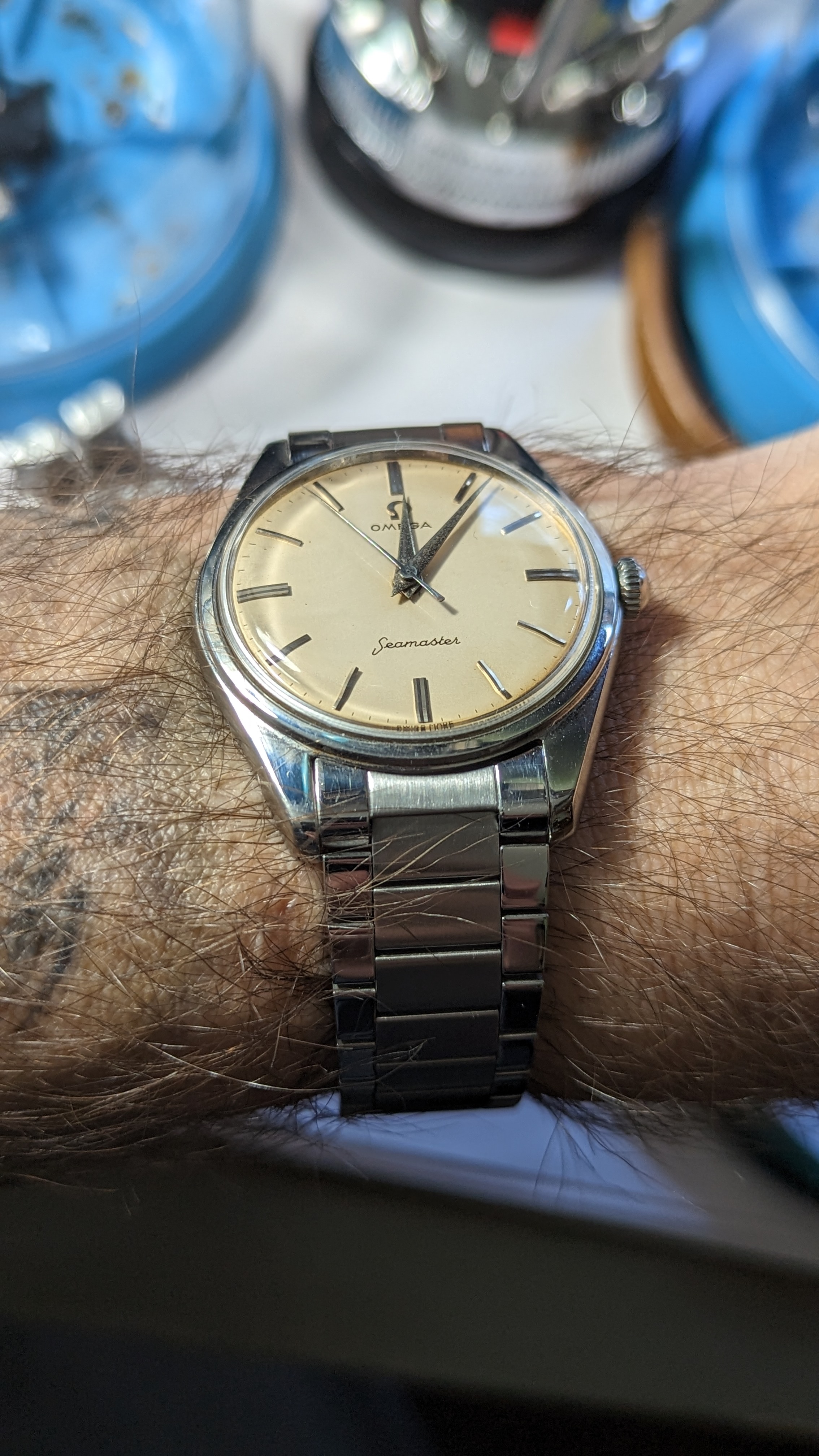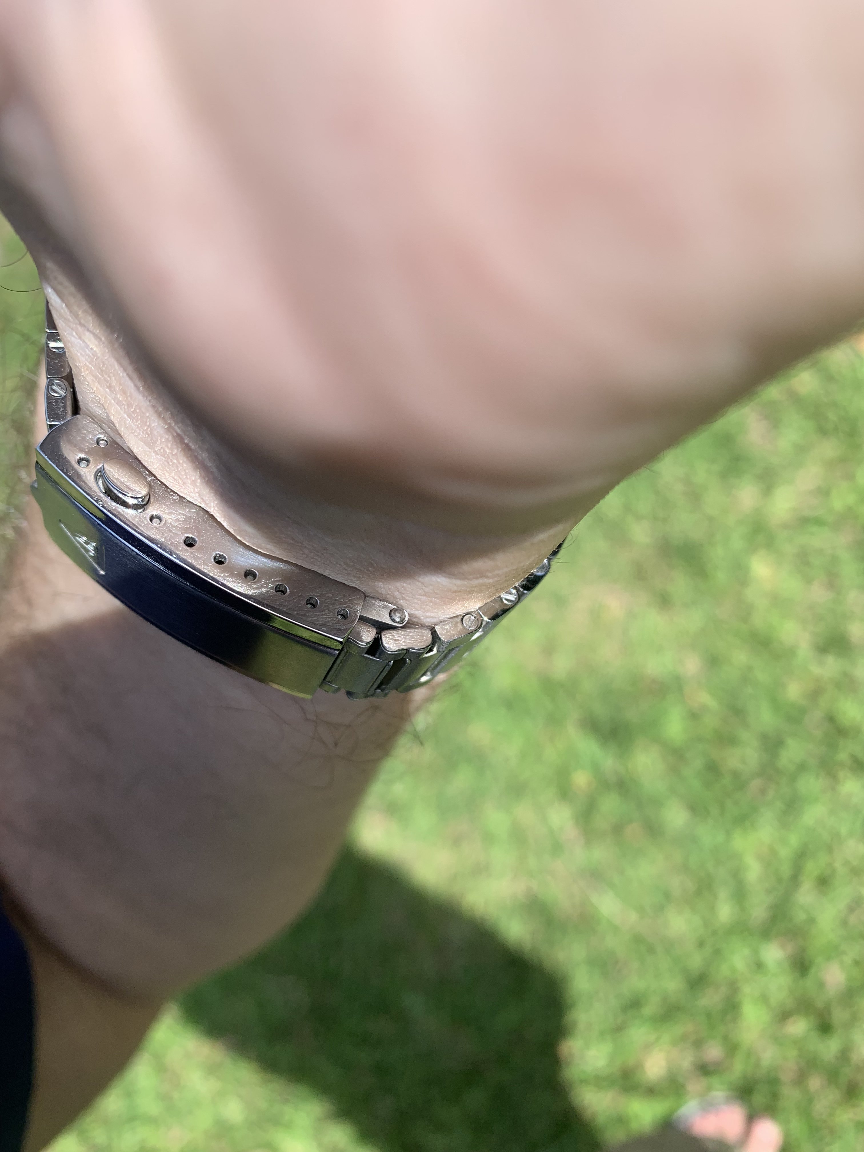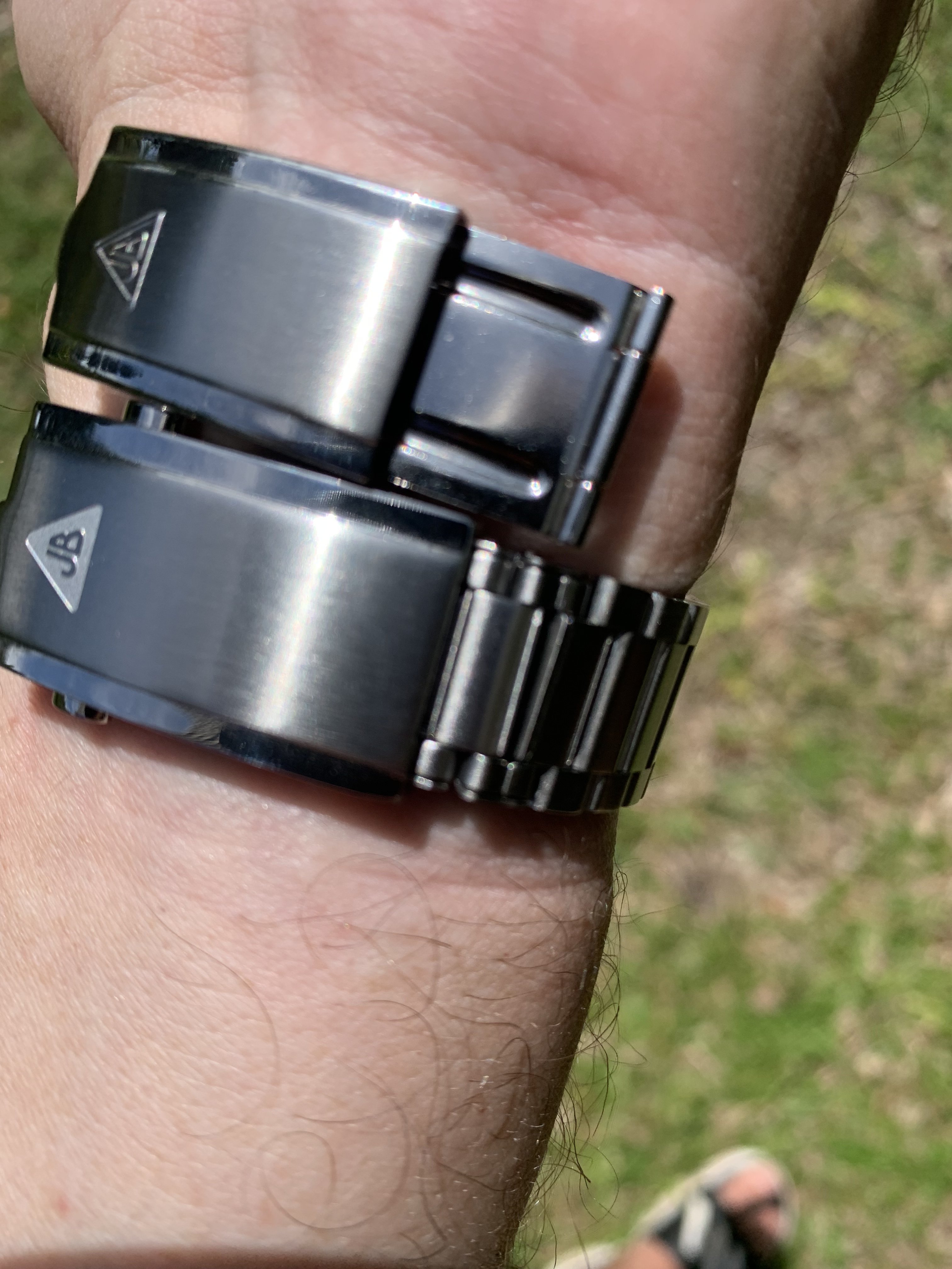 The bracelet I have on my FOIS is not old enough to have the push pins. I think Forstner stopped making those a while back. The $185 Forstner bracelet that comes with the milled clasp doesn’t have the stretch links found on the $150 bracelet I have on my FOIS. Both have solid end links. The 19 mm and 20 mm bracelets are the same bracelet (only the end links differ). The various end links and the milled clasp are sold separately (so you can up grade the clasp or put your existing bracelet on any Speedmaster.