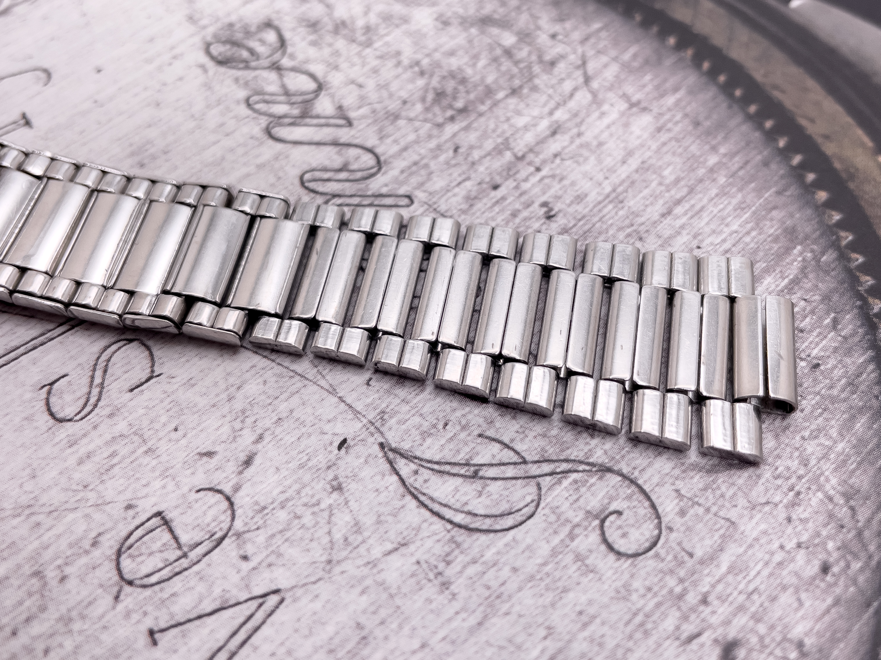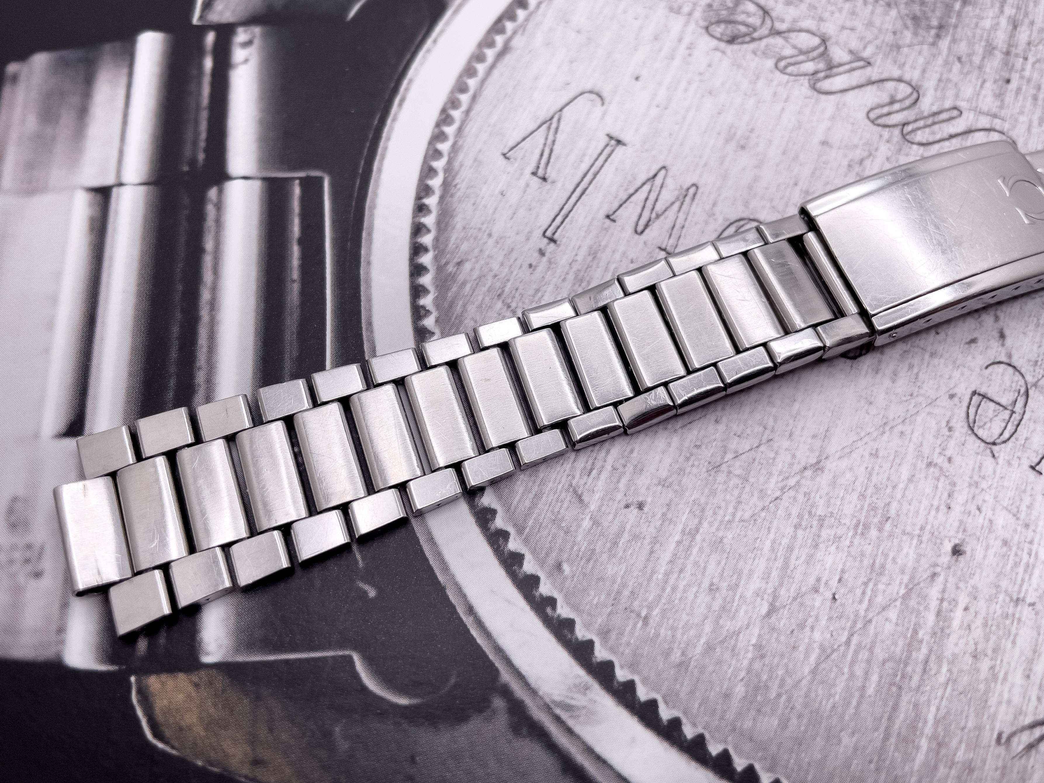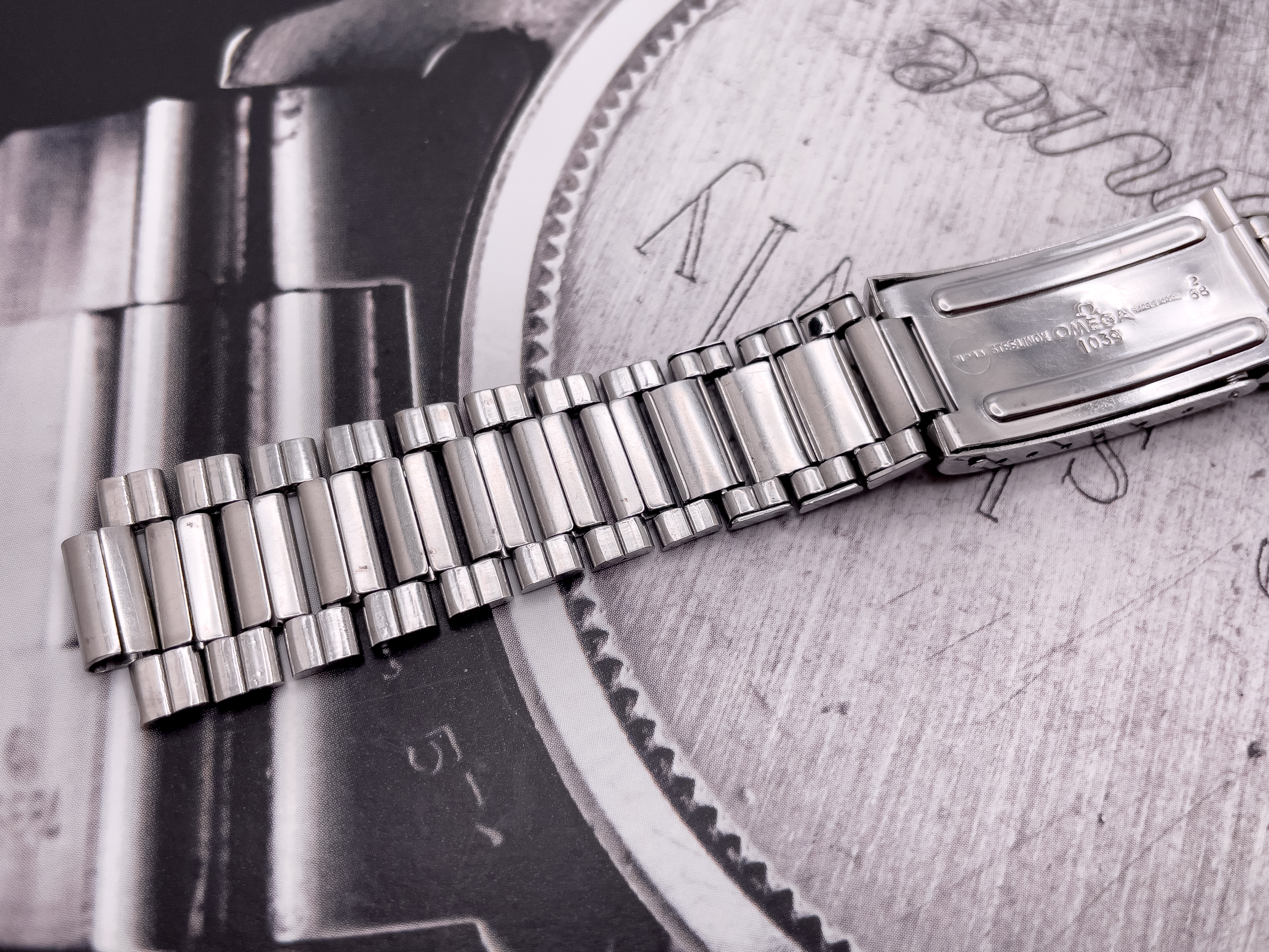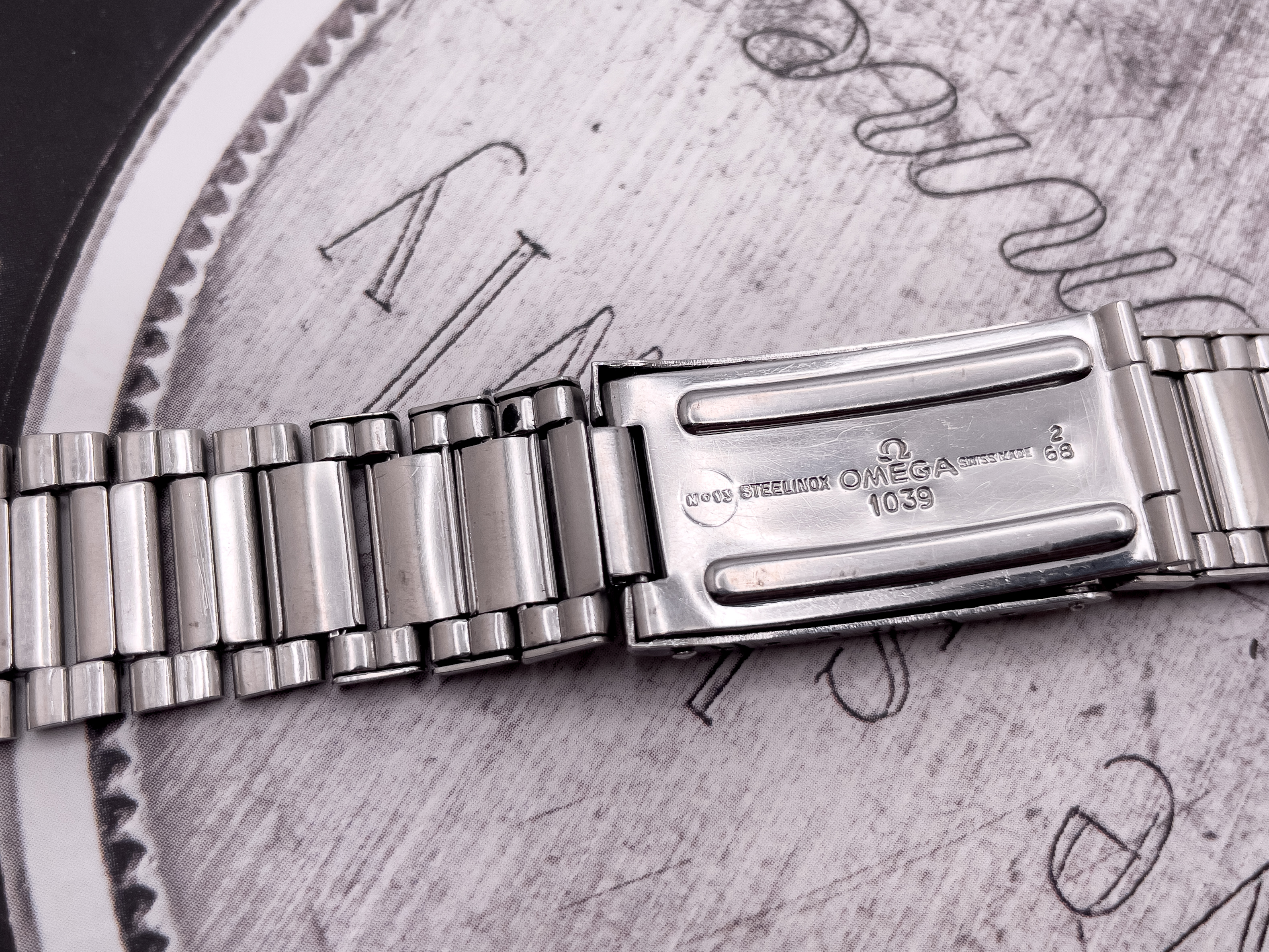 ·For sale I have a 1039 from the second quarter of 1968 with 25 total links. Both sides have 8 solid links. One side has 6 stretch links. The other side has 3 stretch links. Two of the stretch links have largely lost their tension, as you'll see in the images below. The remaining stretch links have largely retained their tension. The clasp securely snaps closed. The bracelet was worn and shows wear commensurate with its age, but that said, it is still in good condition. Would make for a great candidate to be restored. I do not have the original 516 end links as they were filed down to 18mm and I sold those separately. Please let me know if you require further images. I will be more than happy to provide those. (The black spot on the underside of the bracelet on a link closest to the clasp is just dirt. I have since cleaned it off).