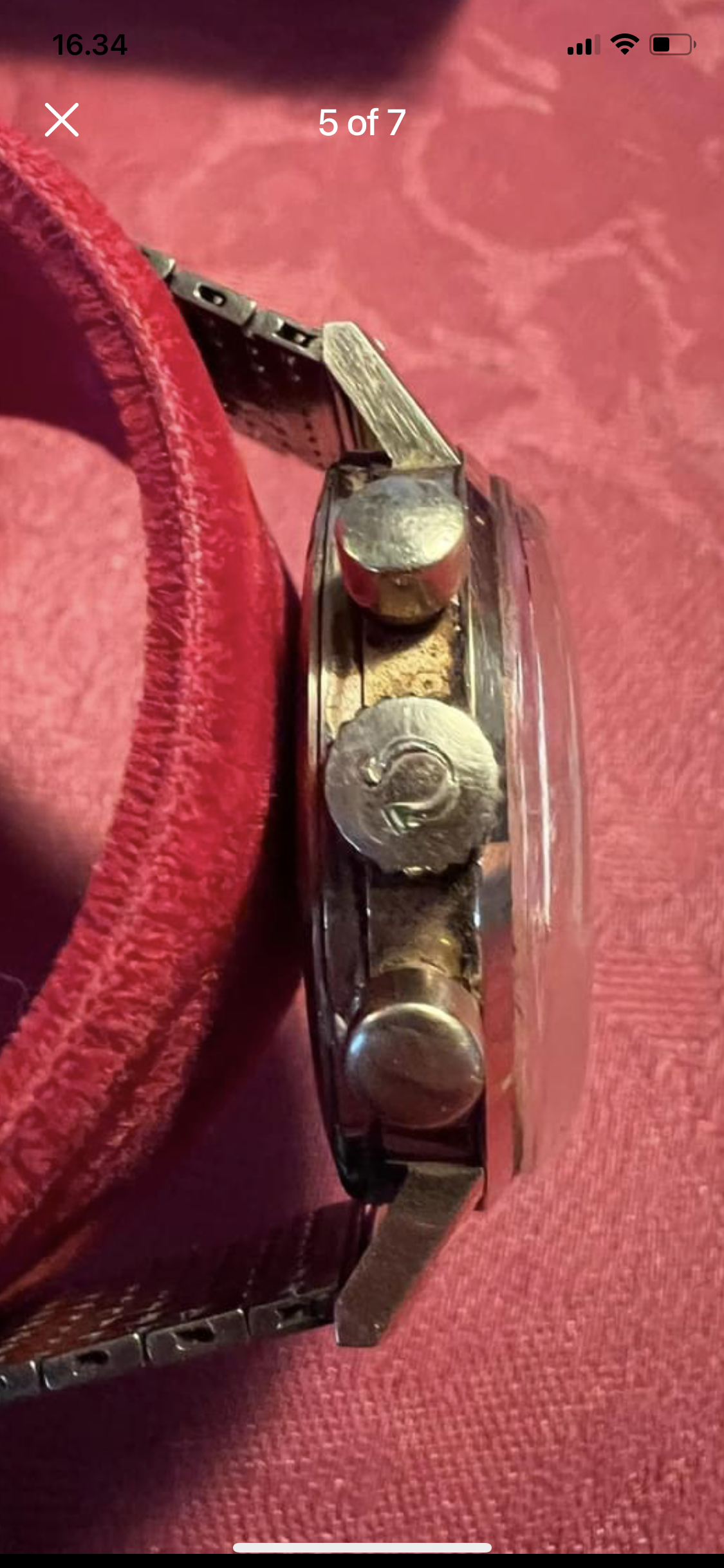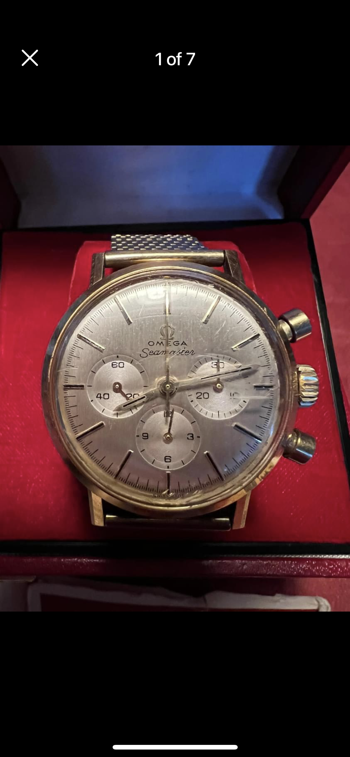 The dial is certainly refinished - notable tells are the wrong AML, incorrect serifs and thick print in Omega, the S in Seamaster, as well as rest of the print. Subdial numerals are also fat and not overlapping on the sloping recess. The vertical grain on dial is overdone and the spacing between the minute track and the case is too wide. Hands are also after market, thick and not elegant. Crown seems replacement and I'm inclined to think the caseback may be steel - which would imply not a solid 18K model, rather a GP/GF one. Tread carefully as this is a plentiful reference amongst the 321 non-Speedy chronos. Best if you inspect in person before parting with money.