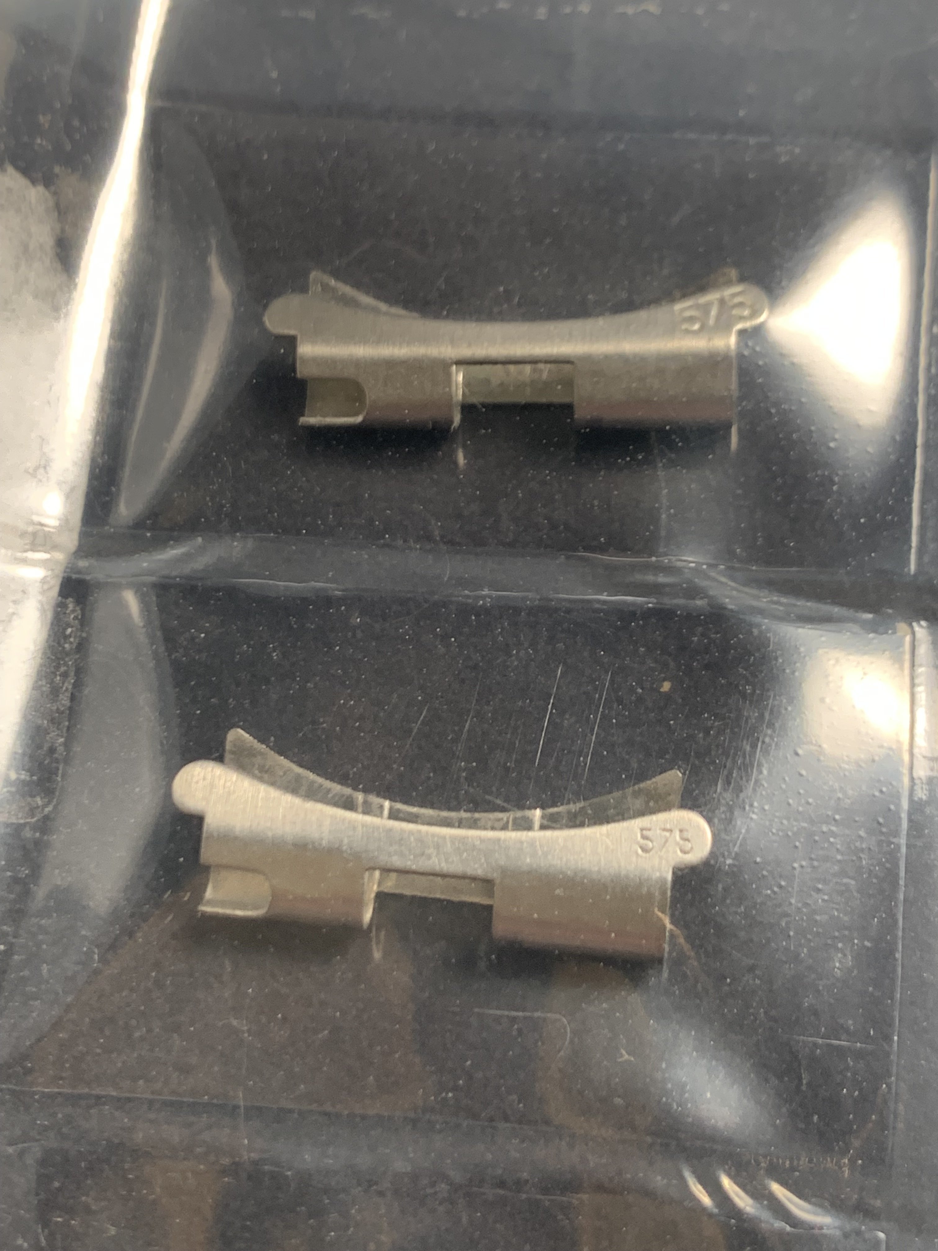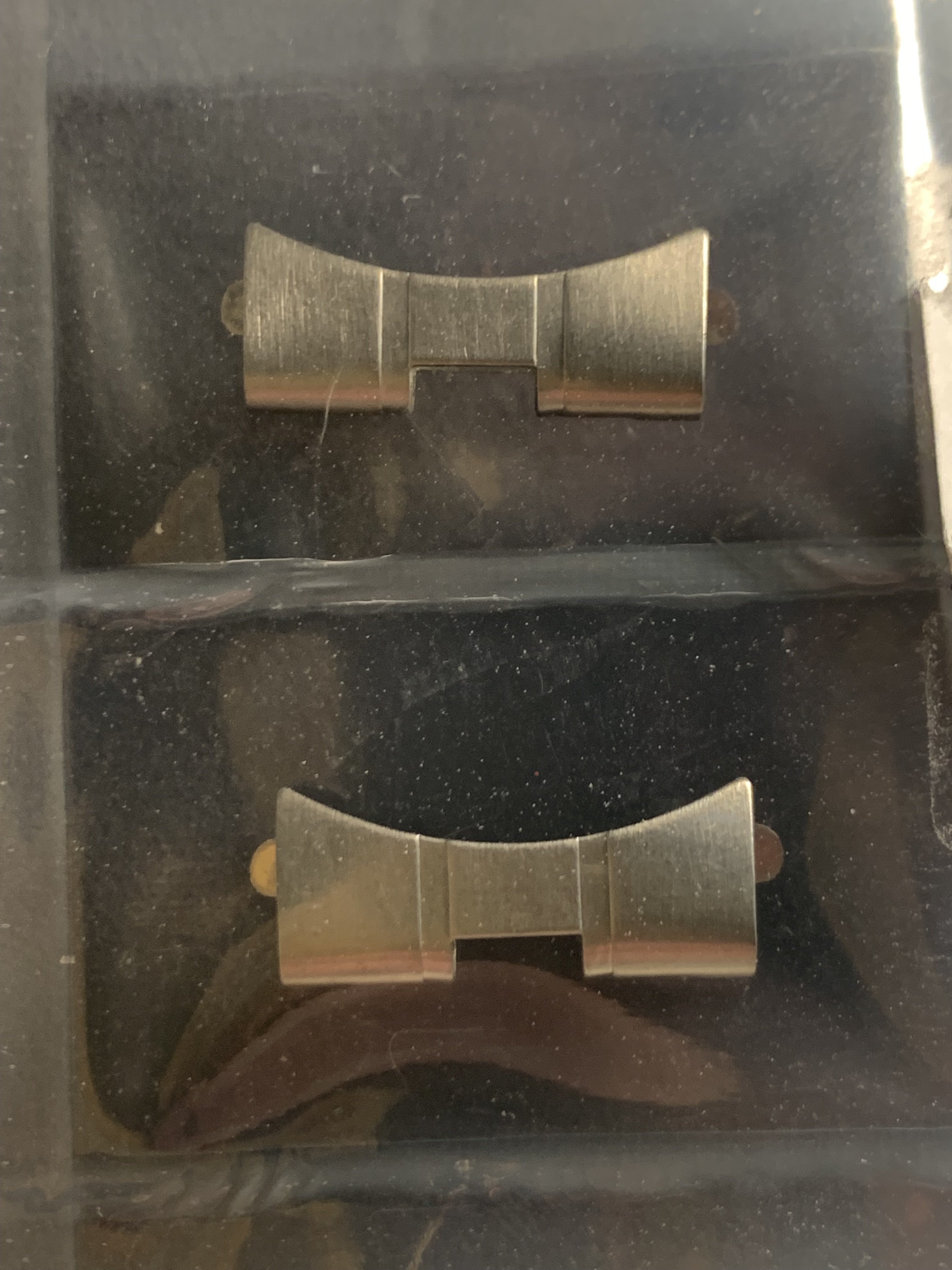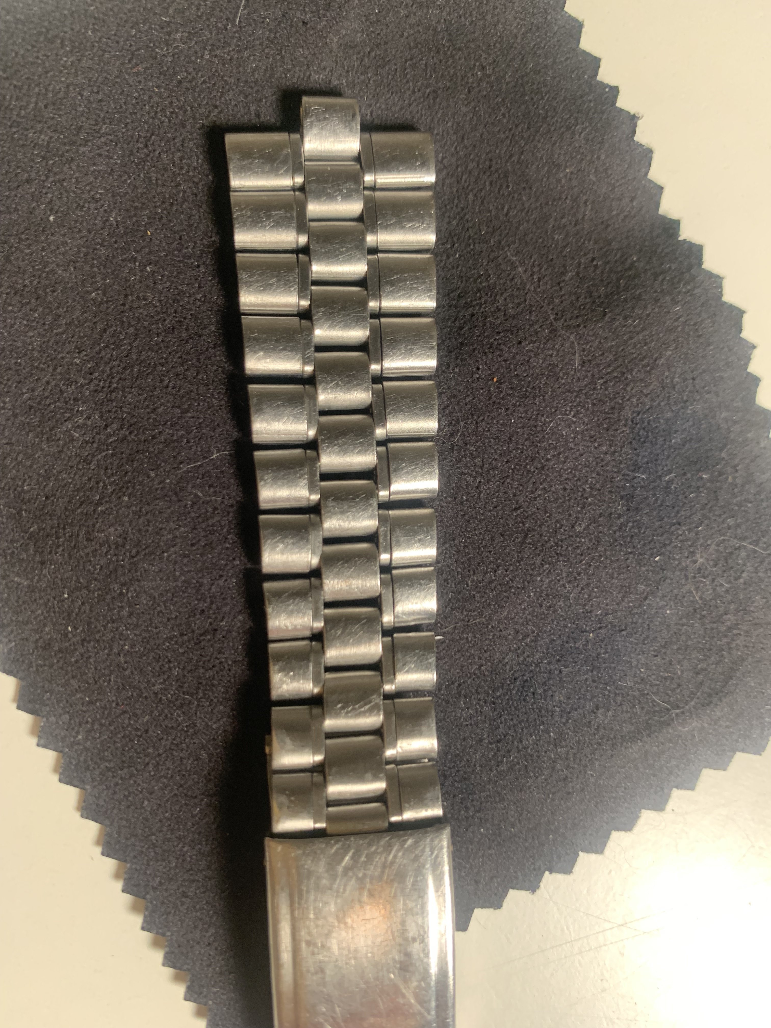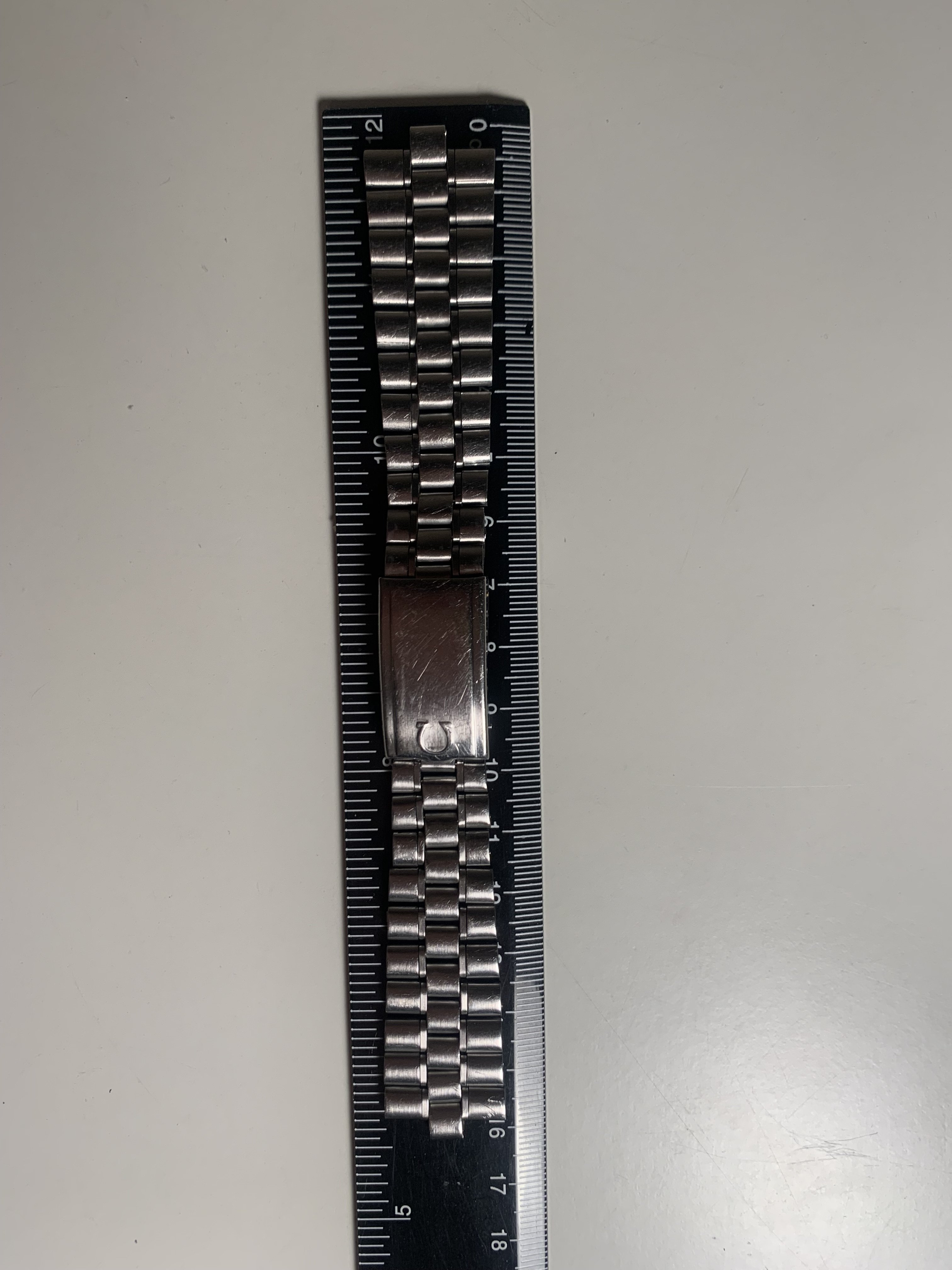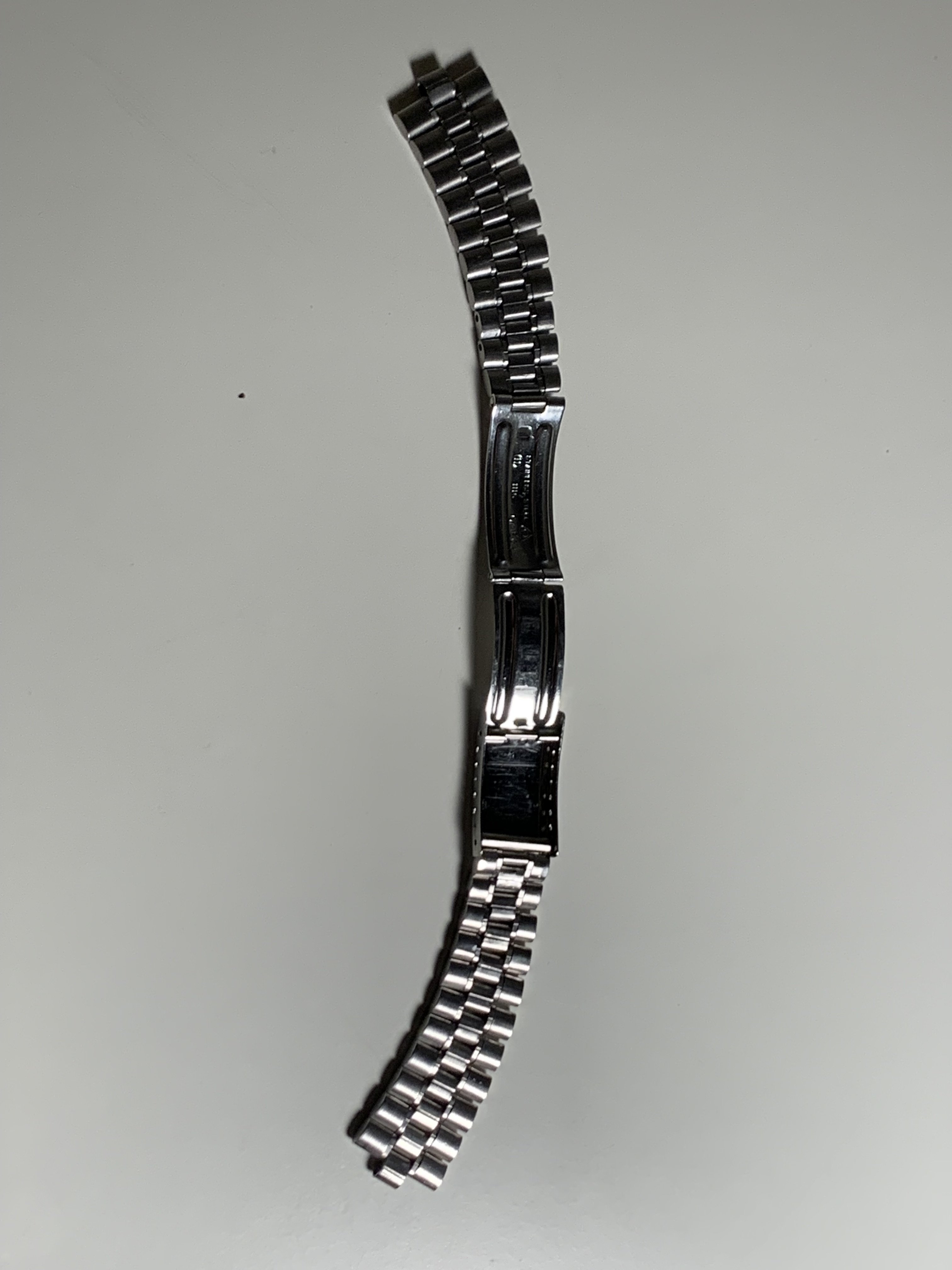 The bracelet was not polished by me but shows signs of prior polishing. It has little stretch for a 1116 and the clasp closes tight. The bracelet has 21 links and a length of app. 16,0 cm (6,3 inches)It has solid steel links, changeable links are screwed version and a fully brushed surface. Included is a pair of brand new and still sealed original 575 end links, so the bracelet is ready to be installed on your watch.