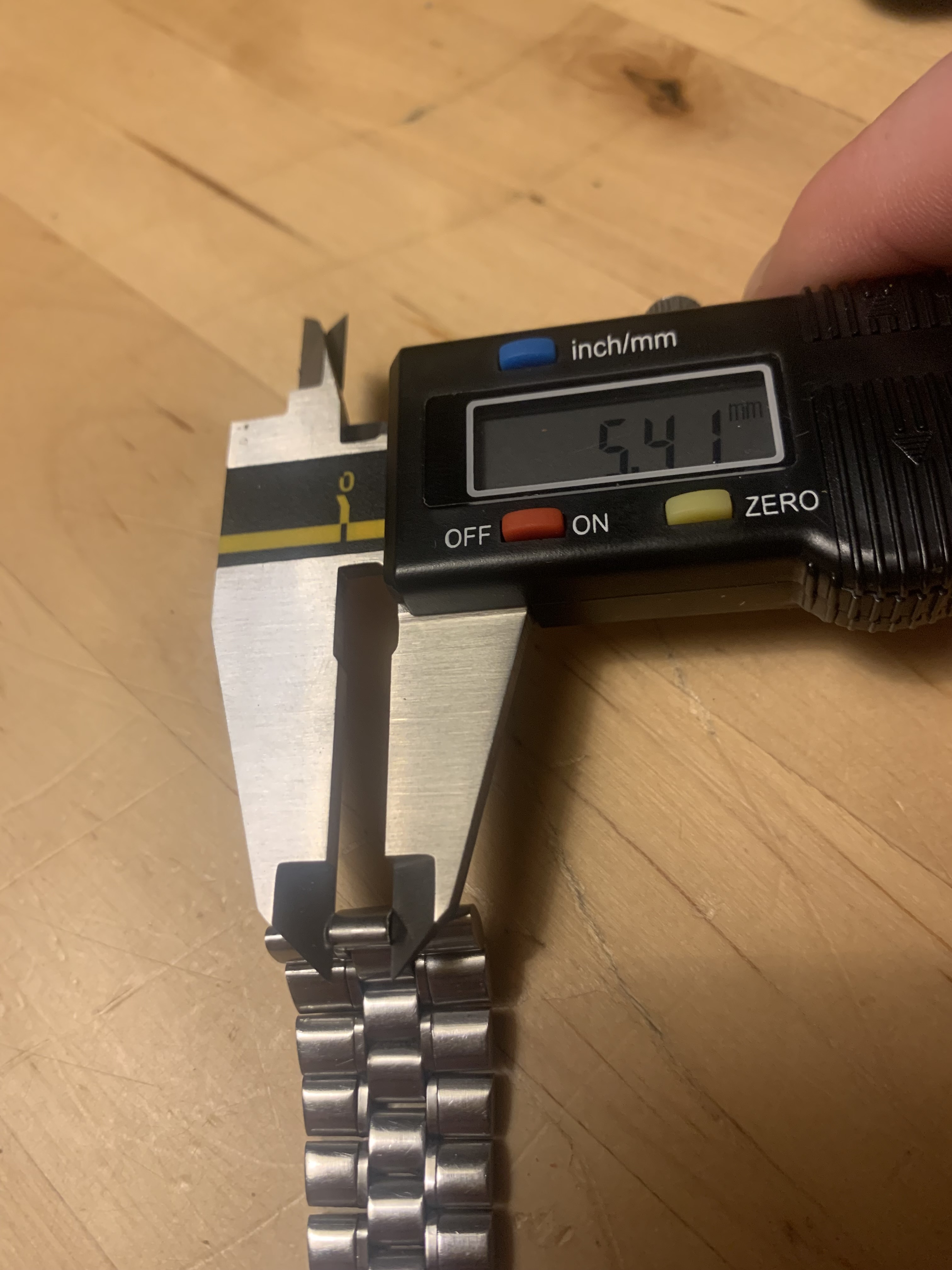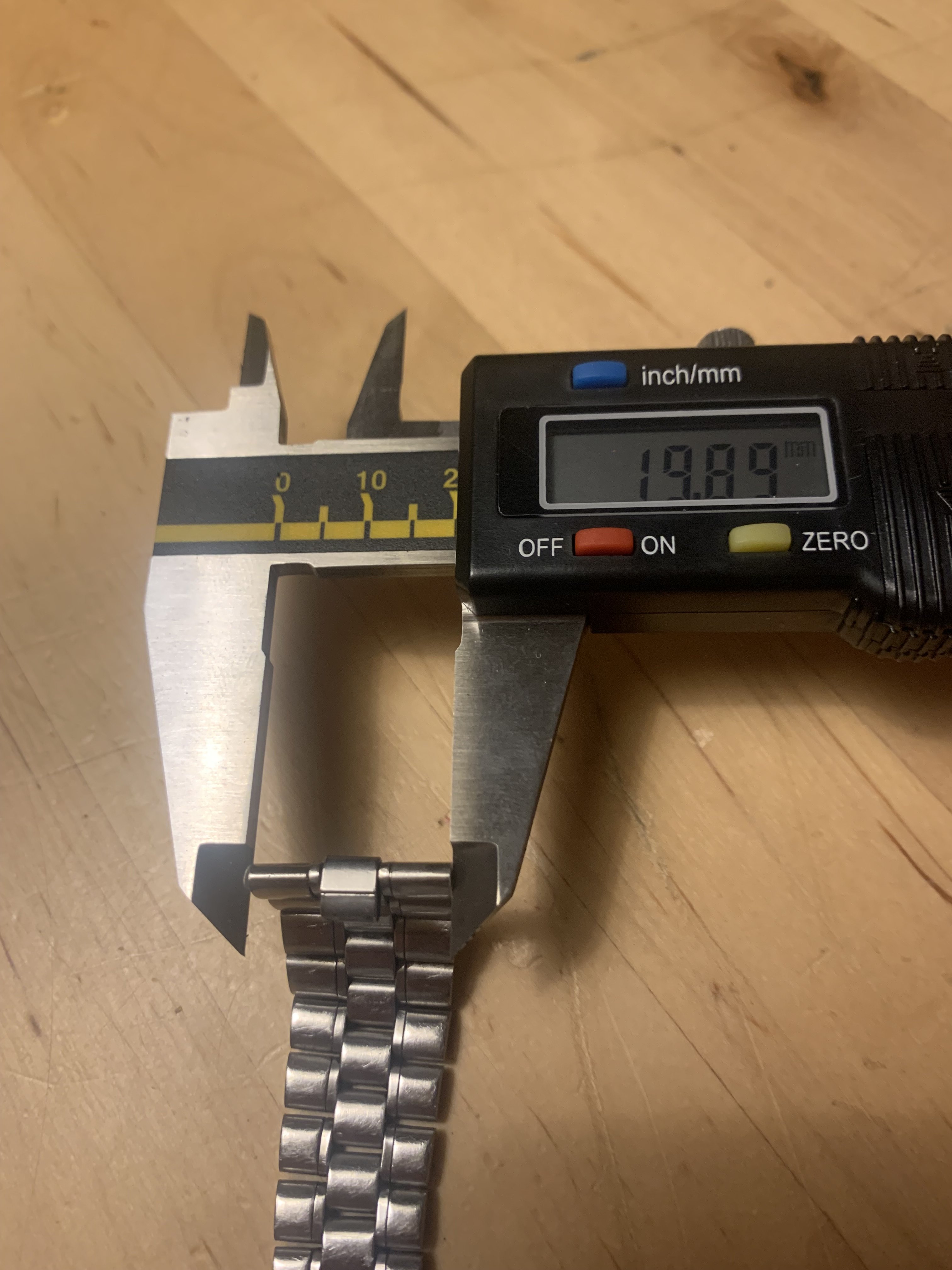 Last link has a width of app. 19,89 mm, the link that fits the end link is about 5,41 mm. For additional dimensions please ask and I will measure and provide more pics.