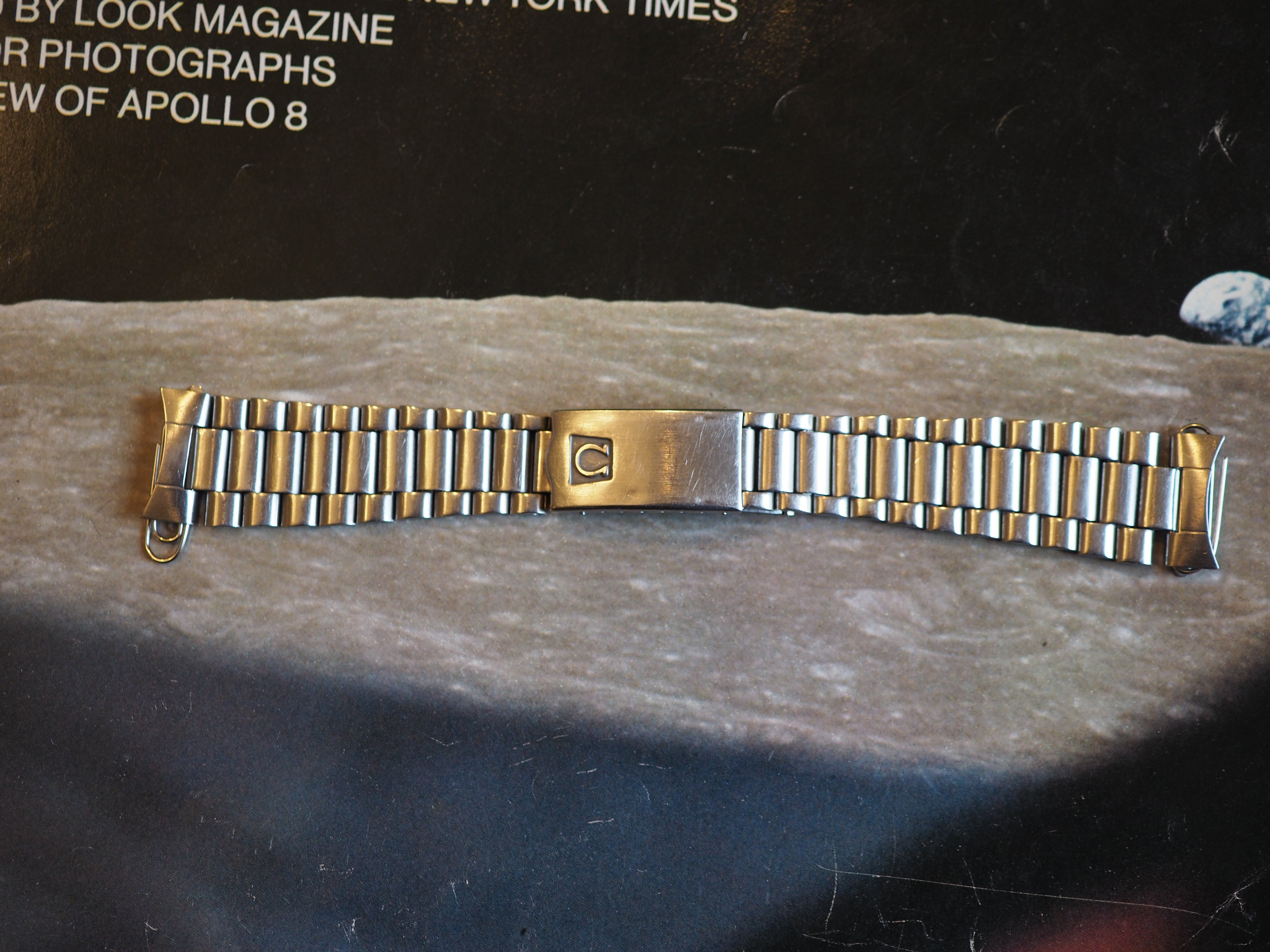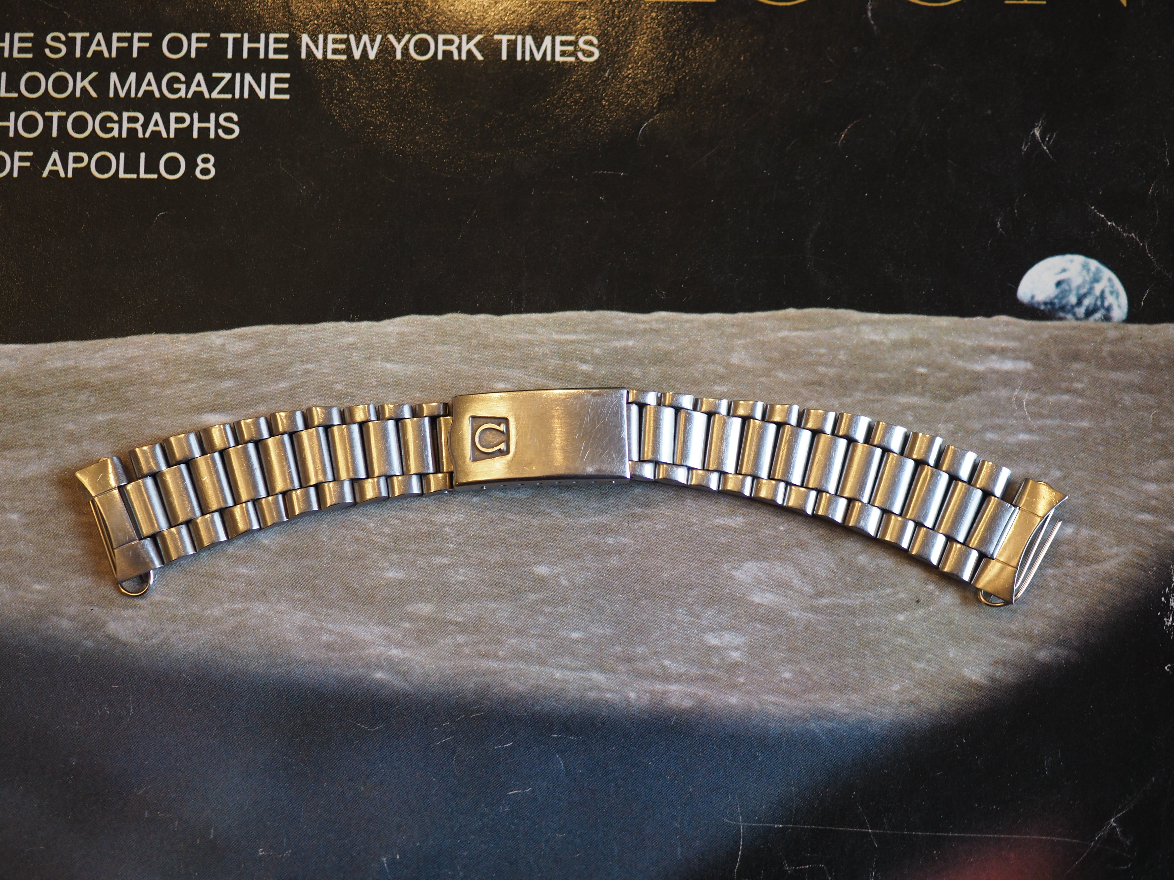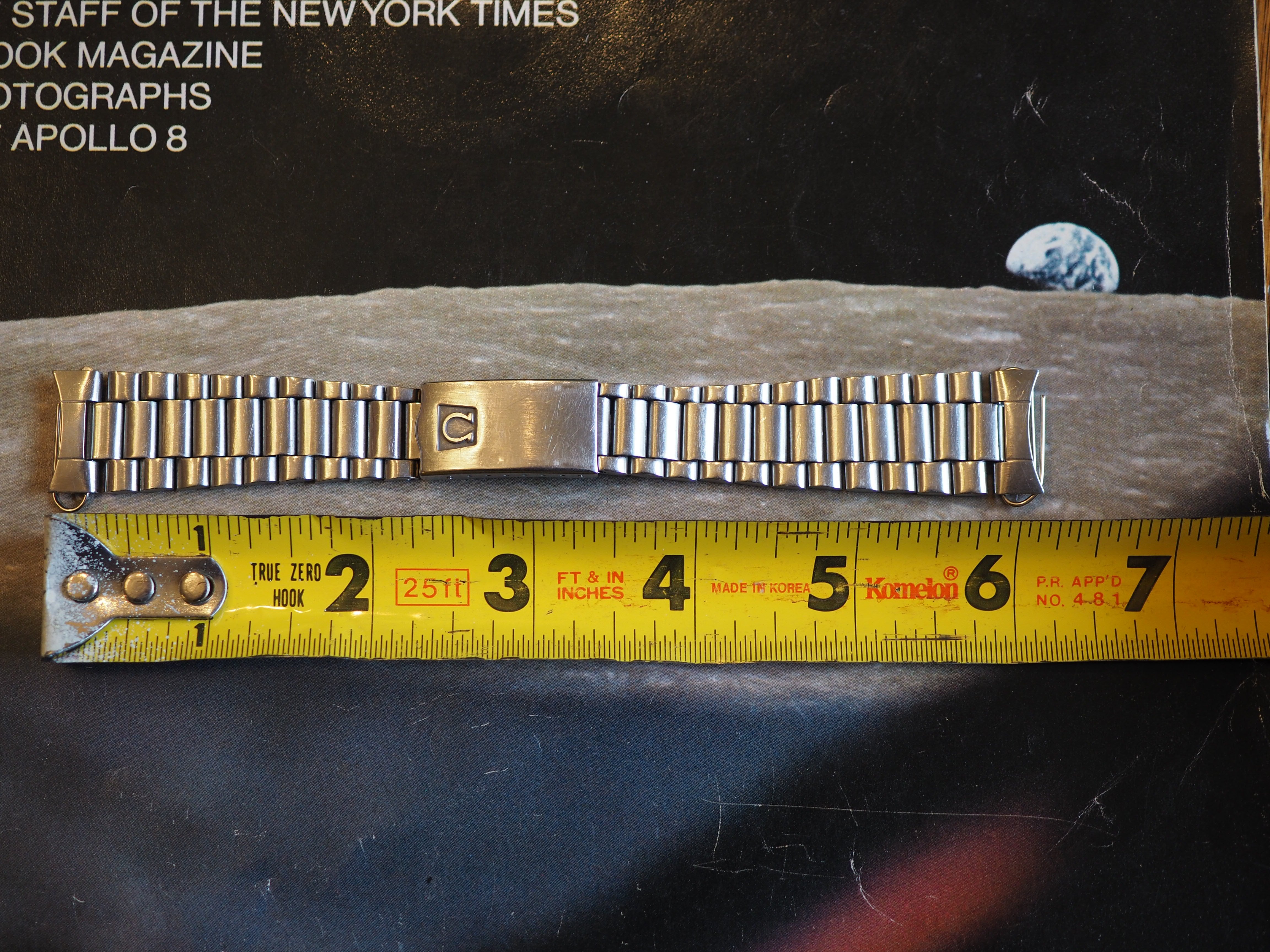·Omega 1171 bracelet with 633 from late 1970s with the trapezoid logo and screw links. Bracelet has the marks of use, but the clasp works well and it has little stretch. There is a ding on the clasp cover (see picture). It is conservatively 5.75" (14.5cm) long, and comes with 2 additional links. However the screws for the spare links will need to be replaced (the heads are trashed), but I believe they are still available from Omega.