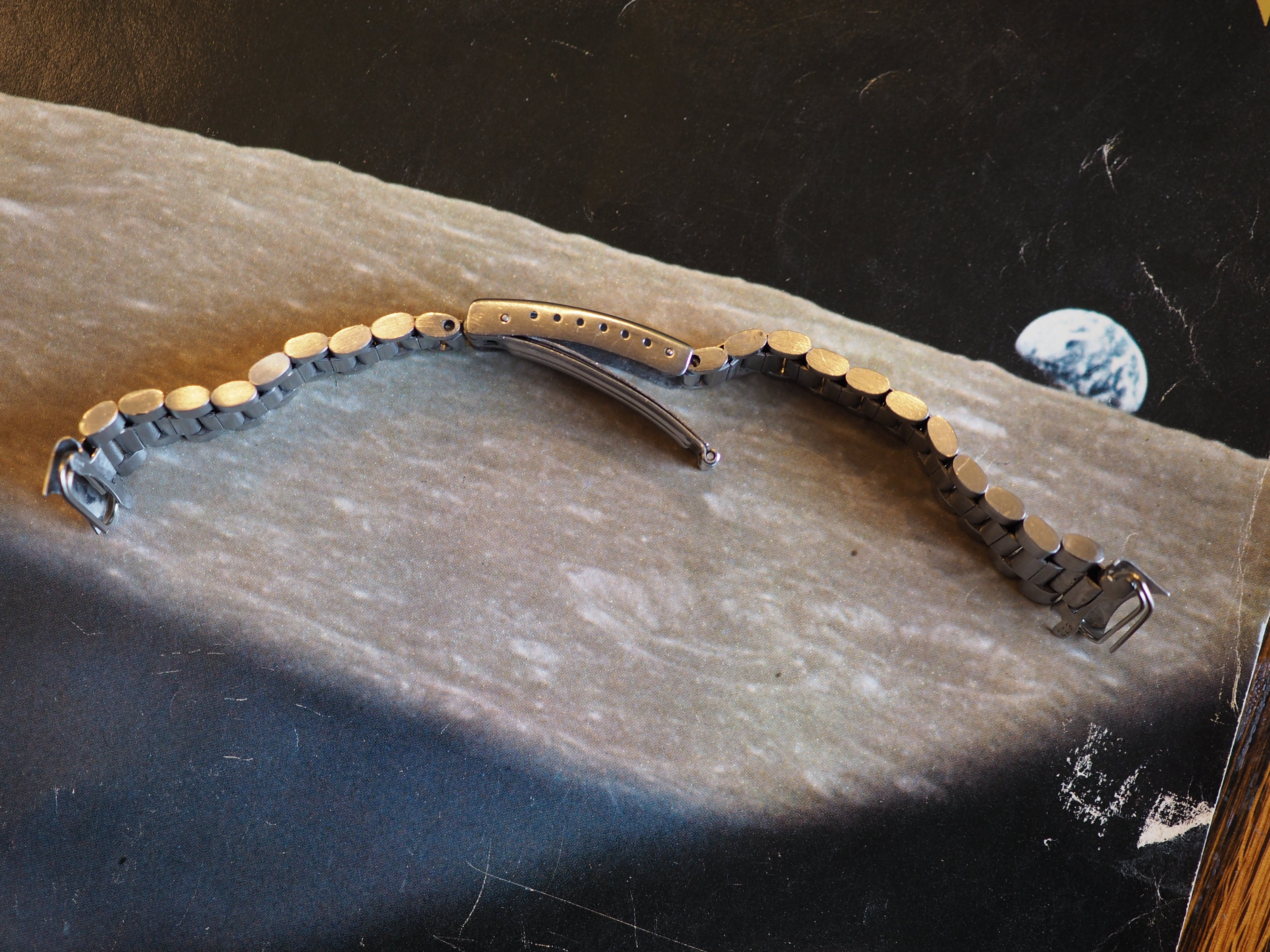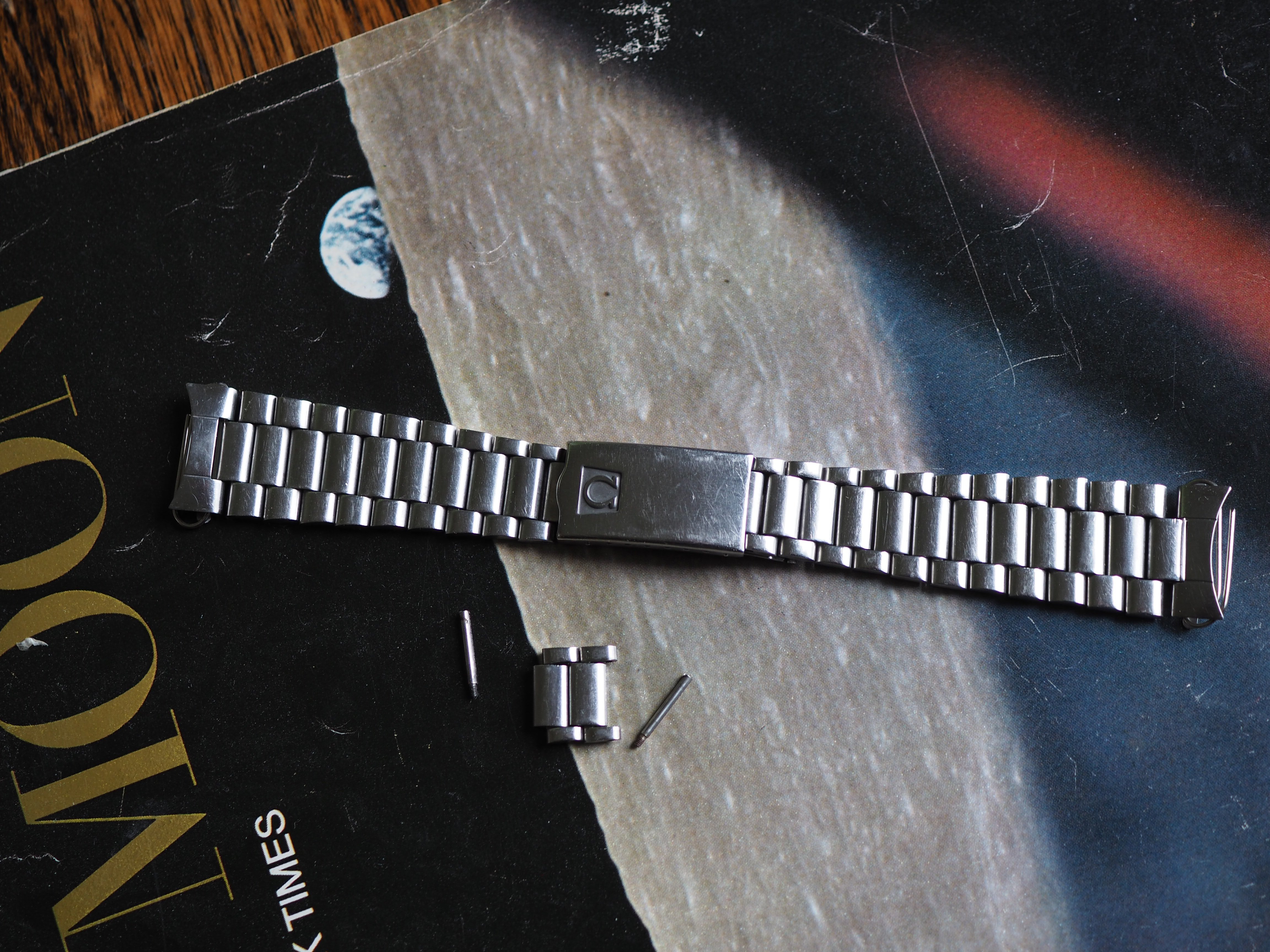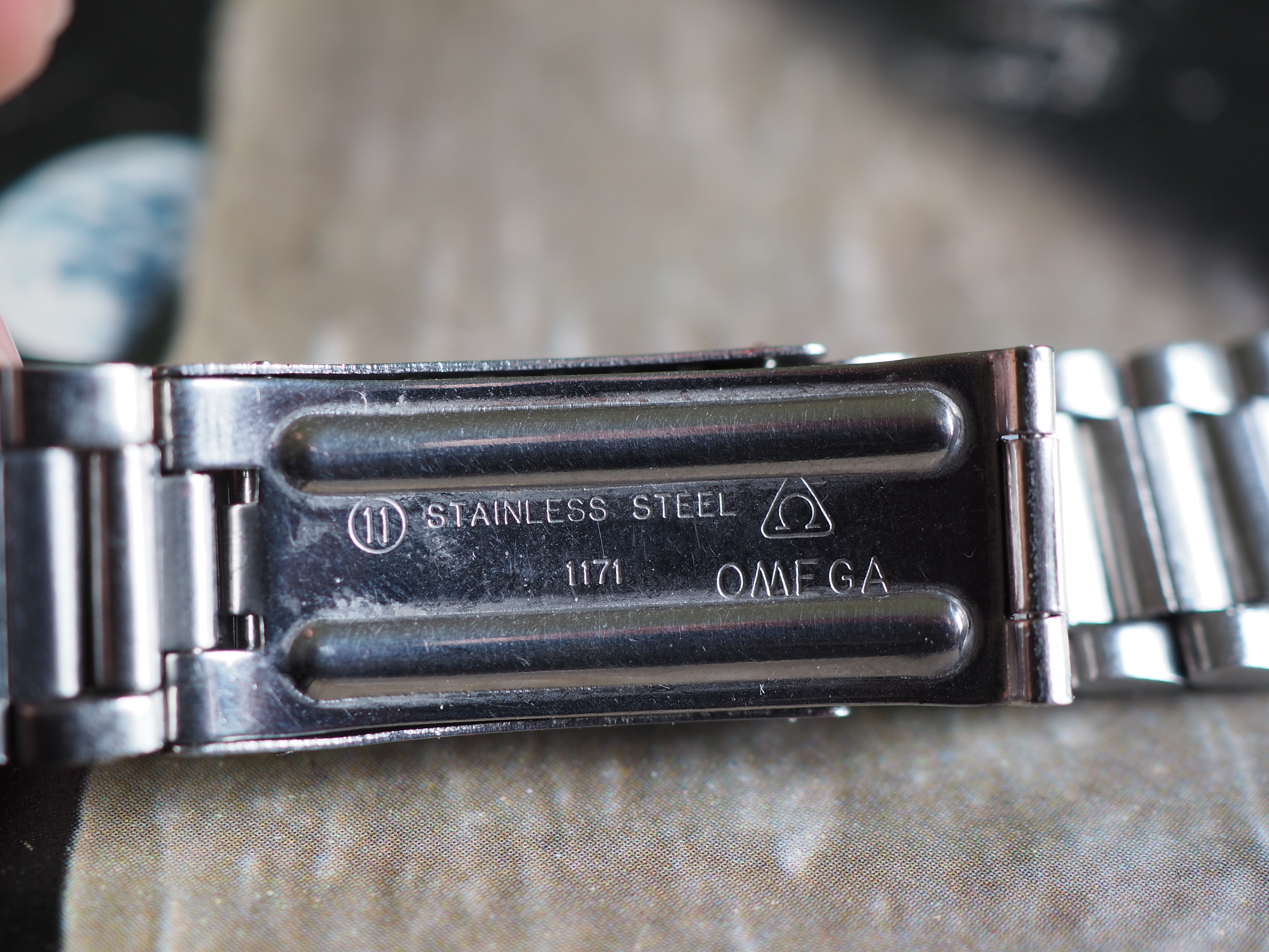 ·Omega 1171 bracelet with 633 from late 1970s with the trapezoid logo and screw links. Bracelet has the marks of use, but the clasp works well and it has little stretch. There is a ding on the clasp cover (see picture). It is conservatively 5.75" (14.5cm) long, and comes with 2 additional links. However the screws for the spare links will need to be replaced (the heads are trashed), but I believe they are still available from Omega.