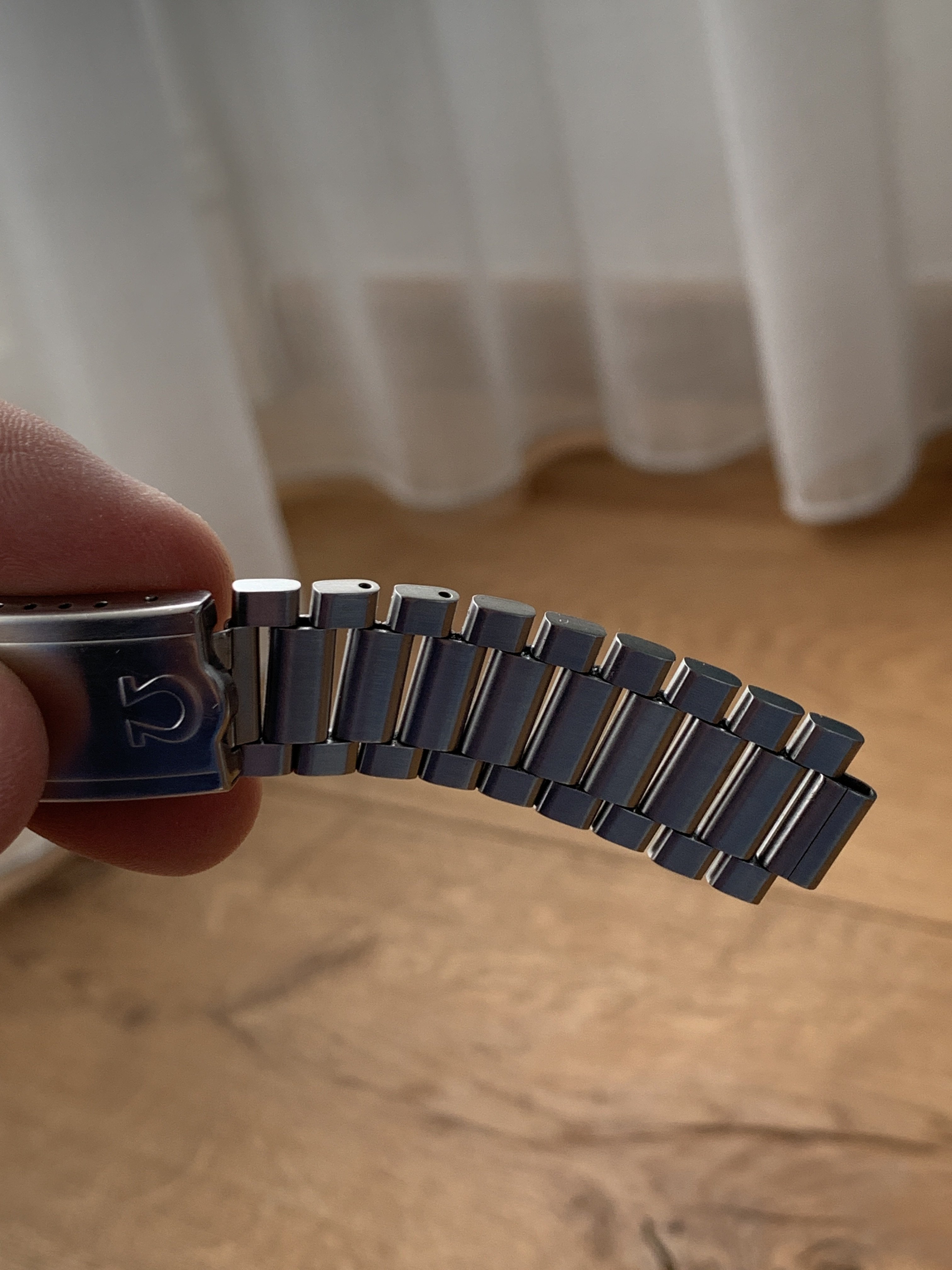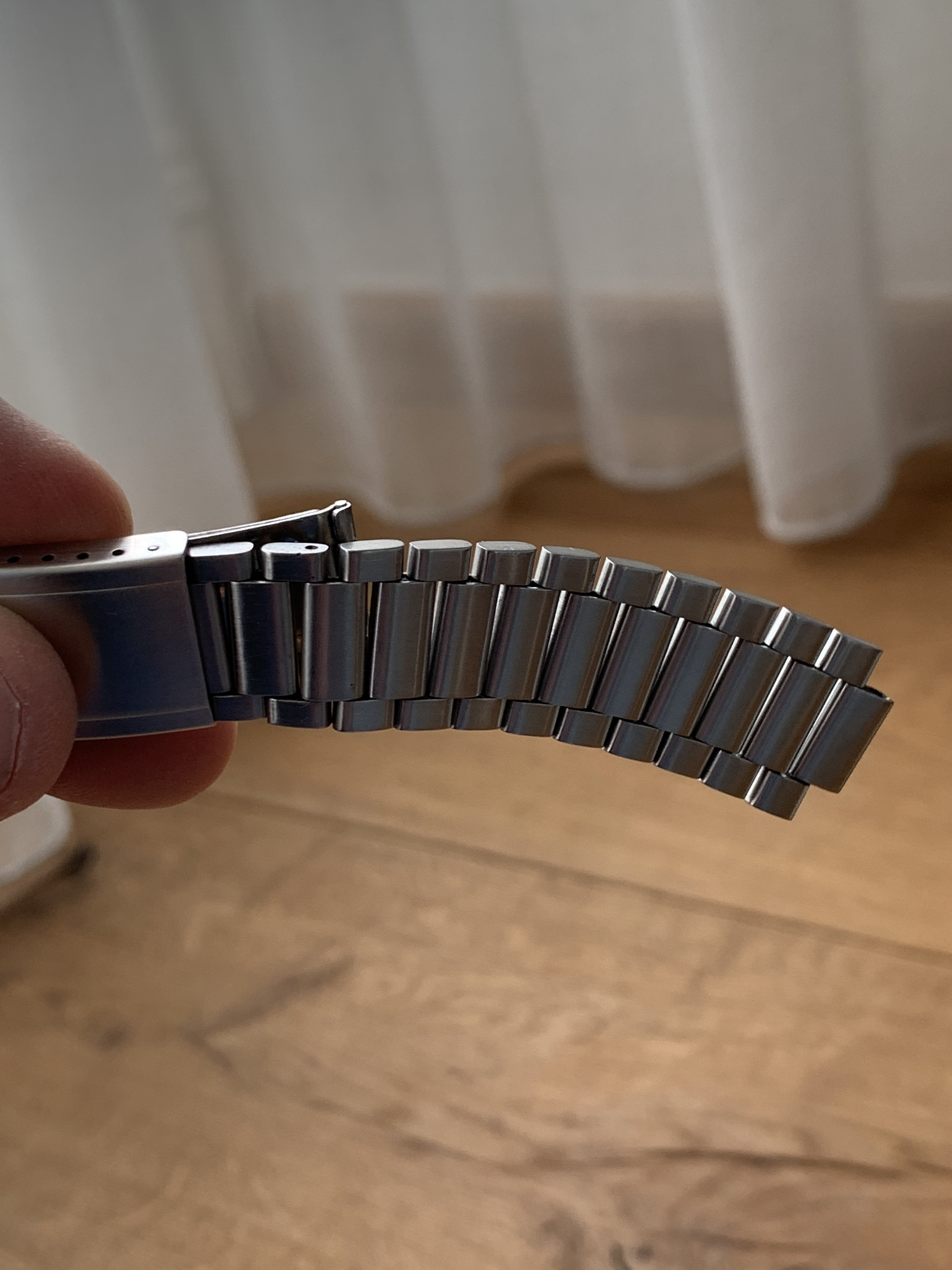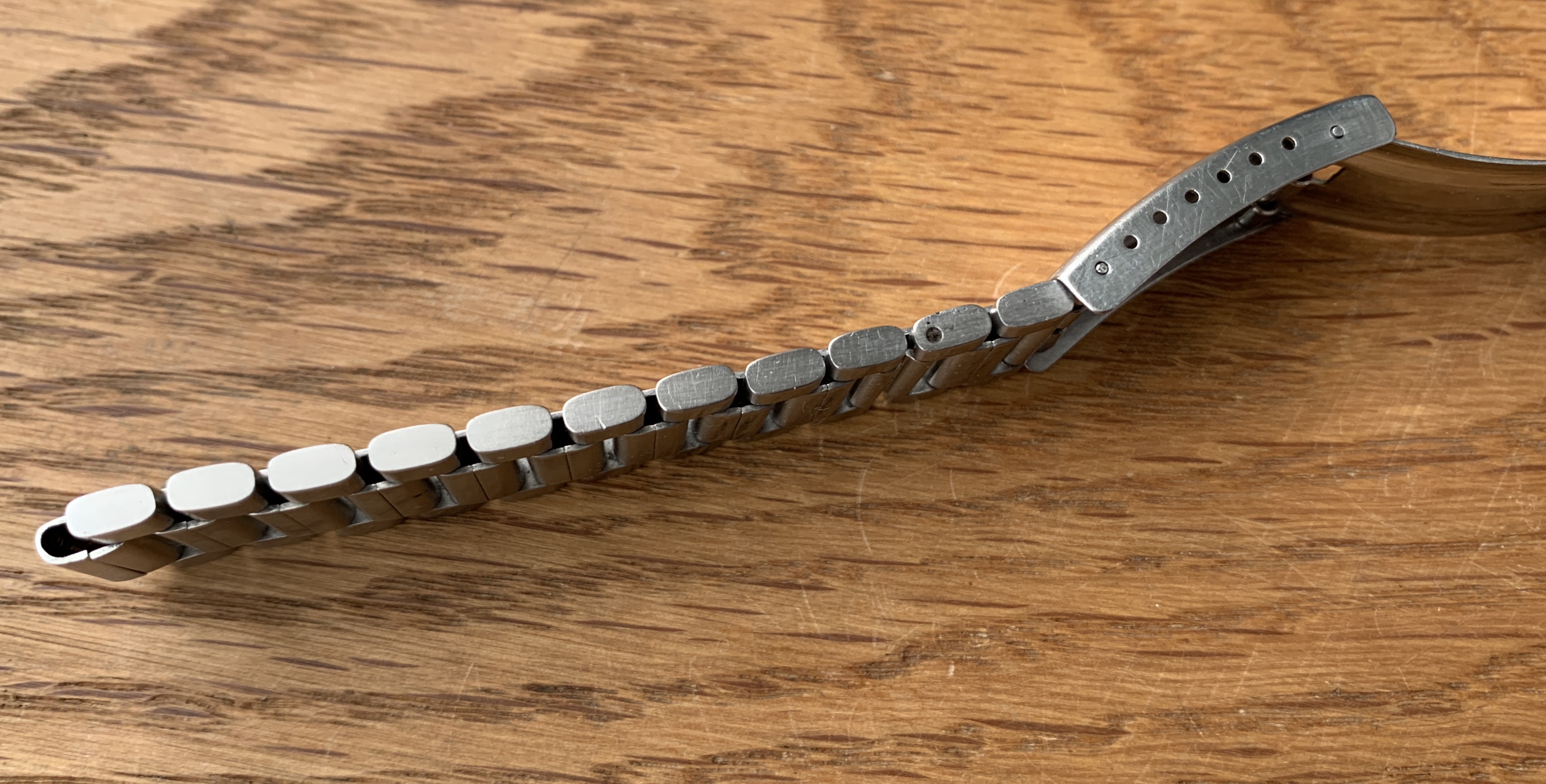 This bracelet has a fully brushed finish and tapers from 18.8 mm to 16.9 mm and has 20 links of which one is removable (fully original and the number of links and size matches the Moonwatch Only book reference page). The clasp has 7 microadjustment holes. The full bracelet length without endlinks is 16.0 cm and should fit wrist sizes of around 17 cm to 20 cm. This bracelet has normal stretch with no play between the links and the clasp closes perfectly with a great snap.