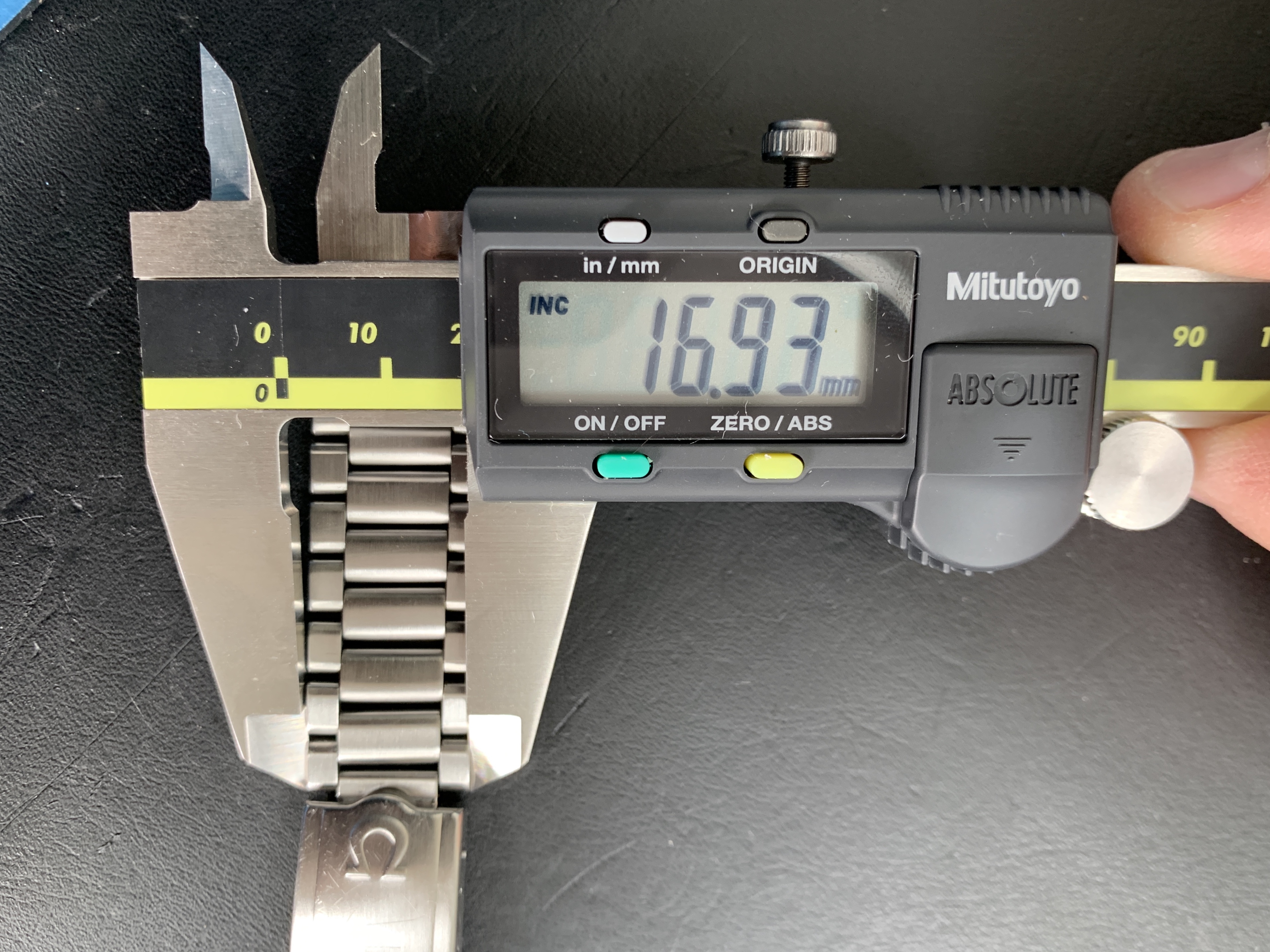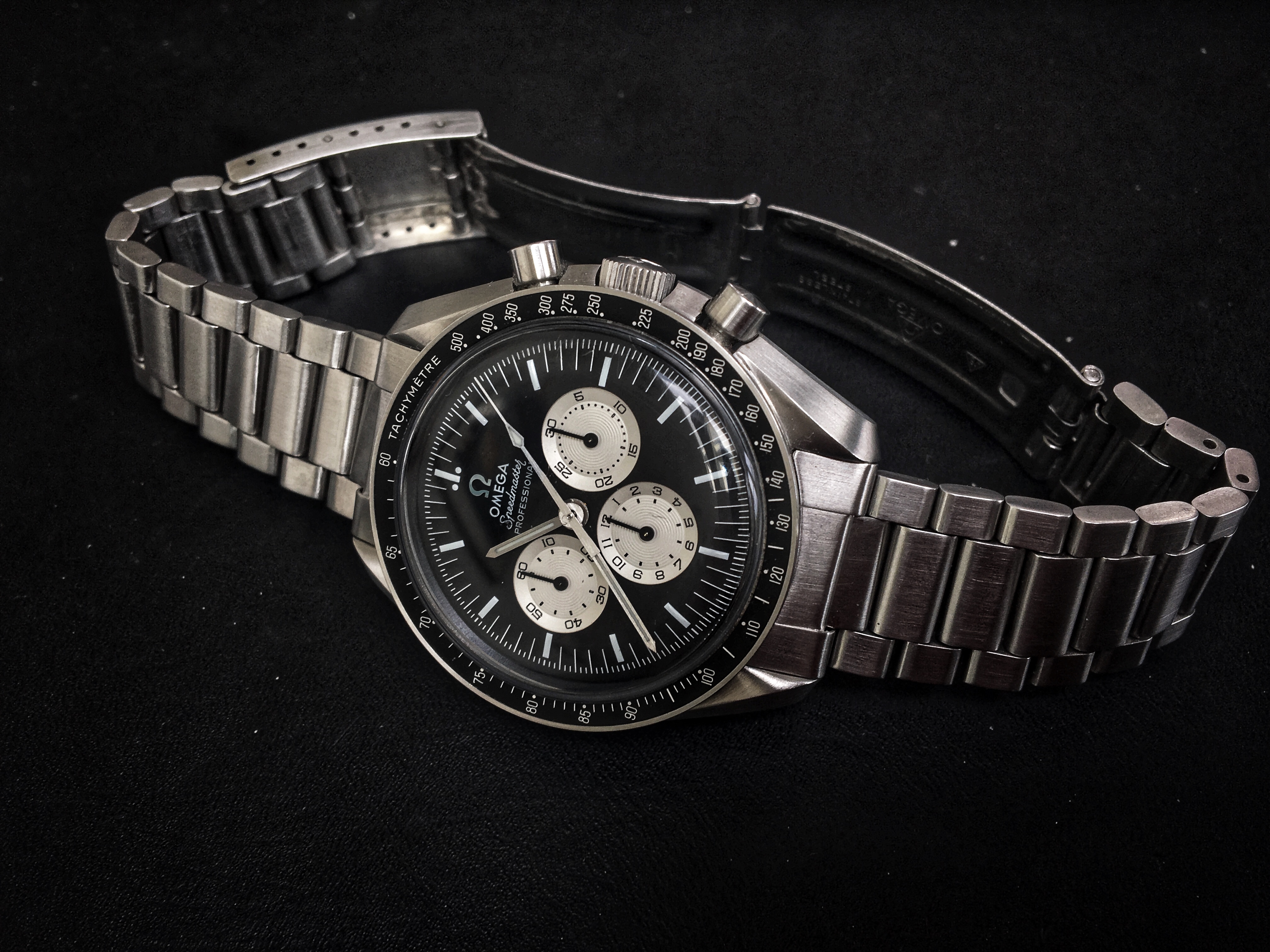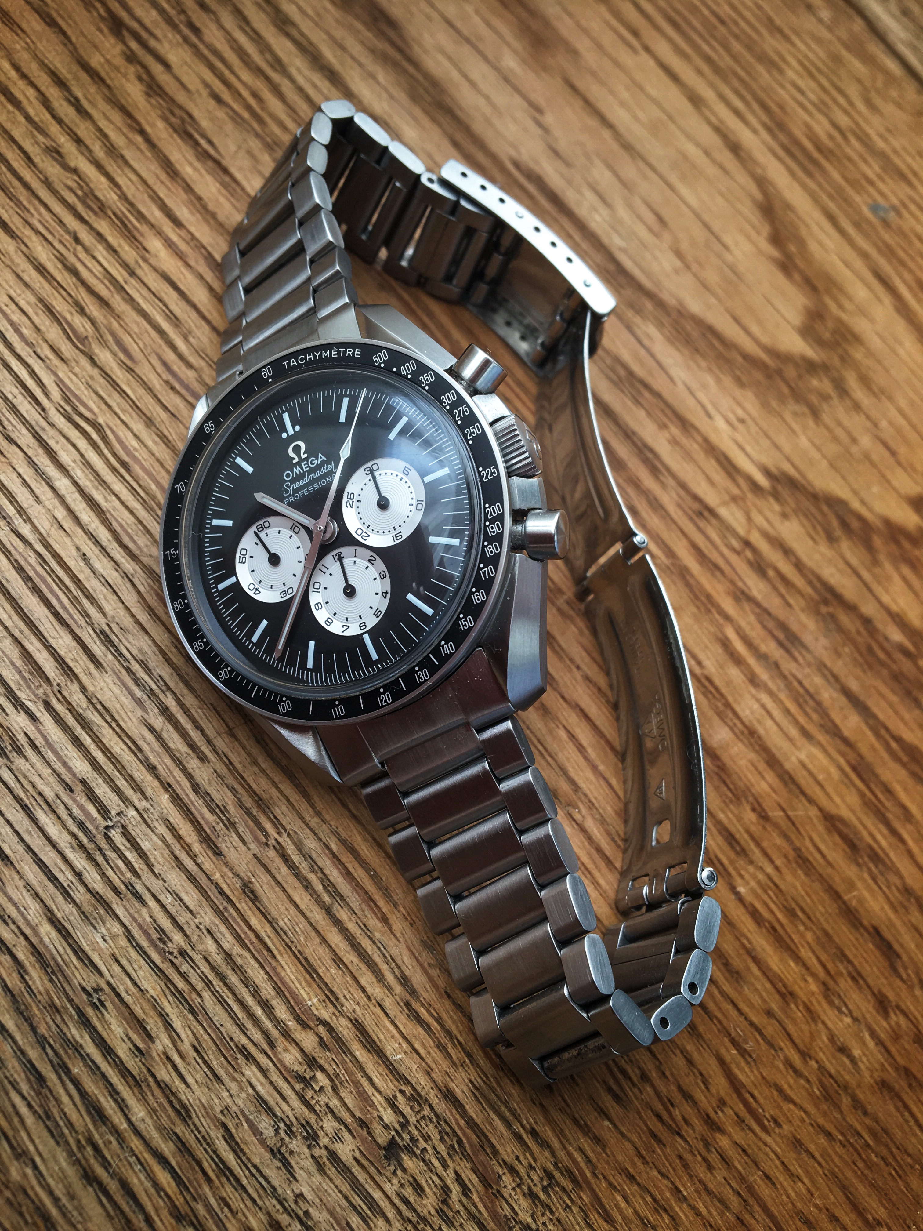 This bracelet has a fully brushed finish and tapers from 18.8 mm to 16.9 mm and has 20 links of which one is removable (fully original and the number of links and size matches the Moonwatch Only book reference page). The clasp has 7 microadjustment holes. The full bracelet length without endlinks is 16.0 cm and should fit wrist sizes of around 17 cm to 20 cm. This bracelet has normal stretch with no play between the links and the clasp closes perfectly with a great snap.