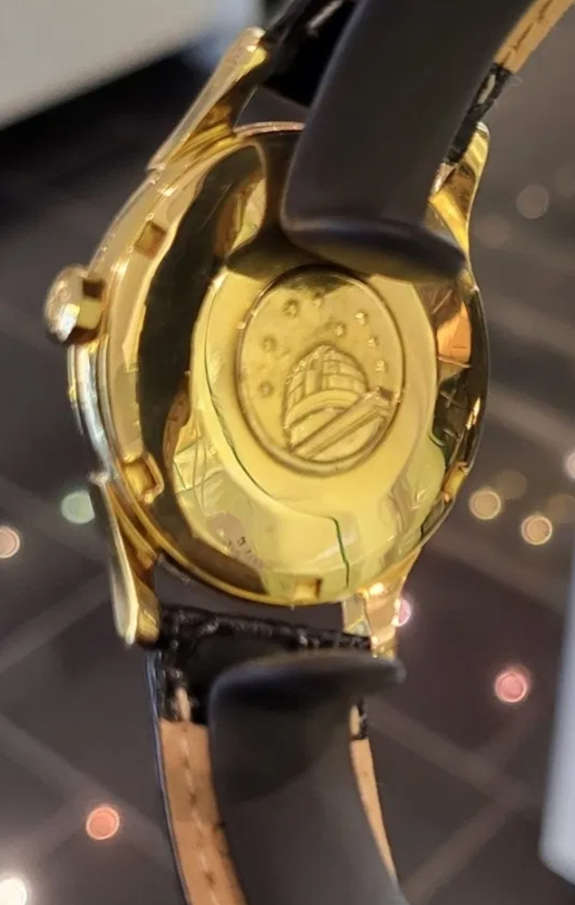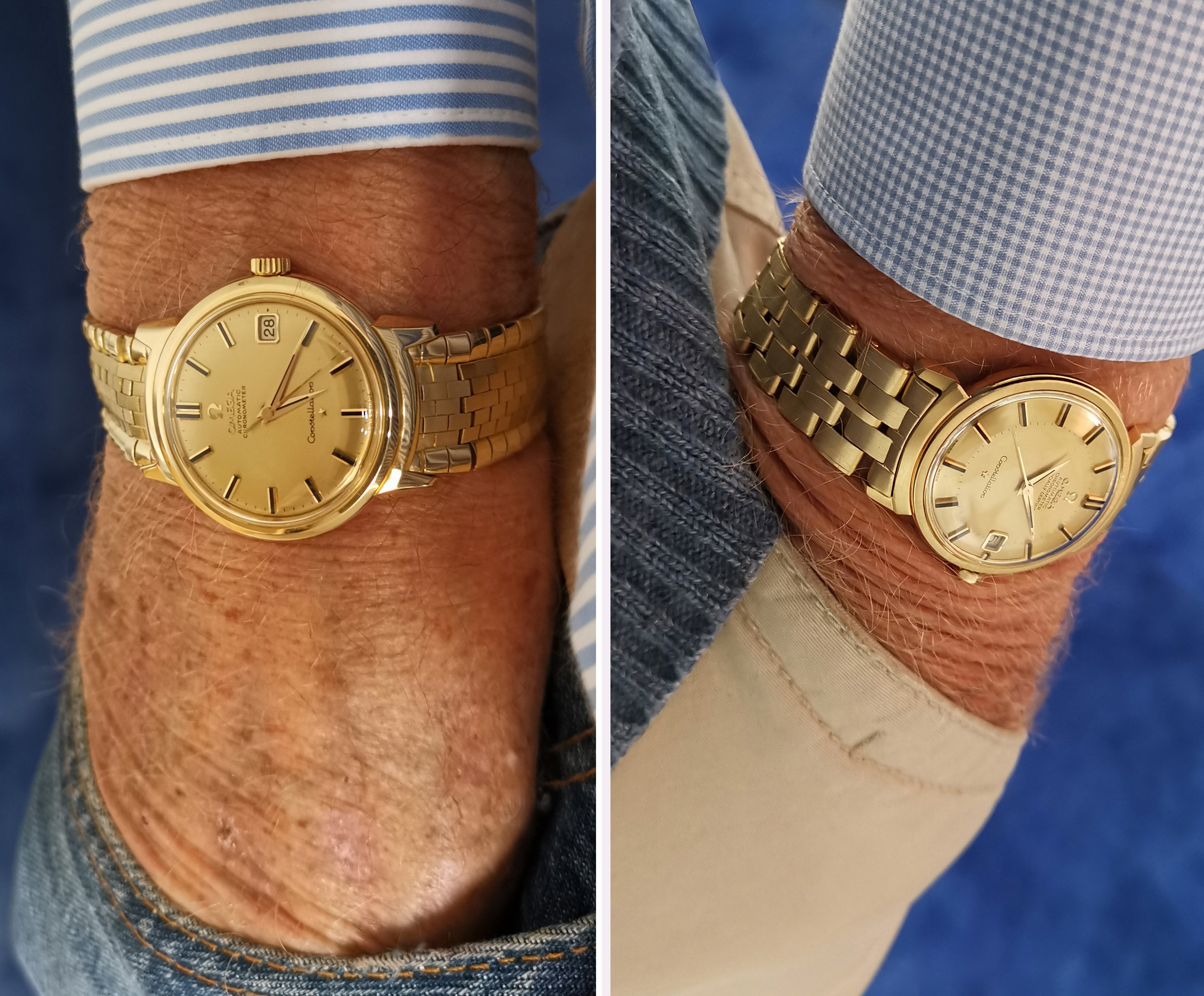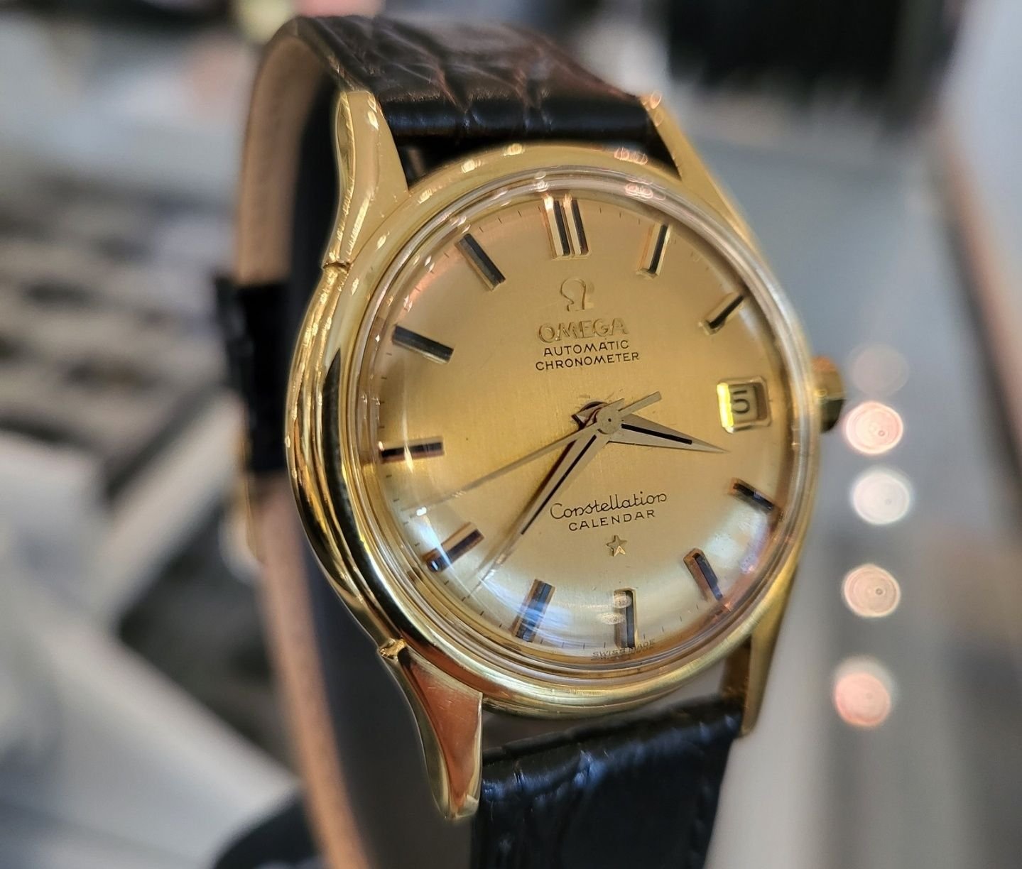 The watch is a 14394 dome dial deluxe Constellation with a solid gold dial and associated wide flat onyx inserts.