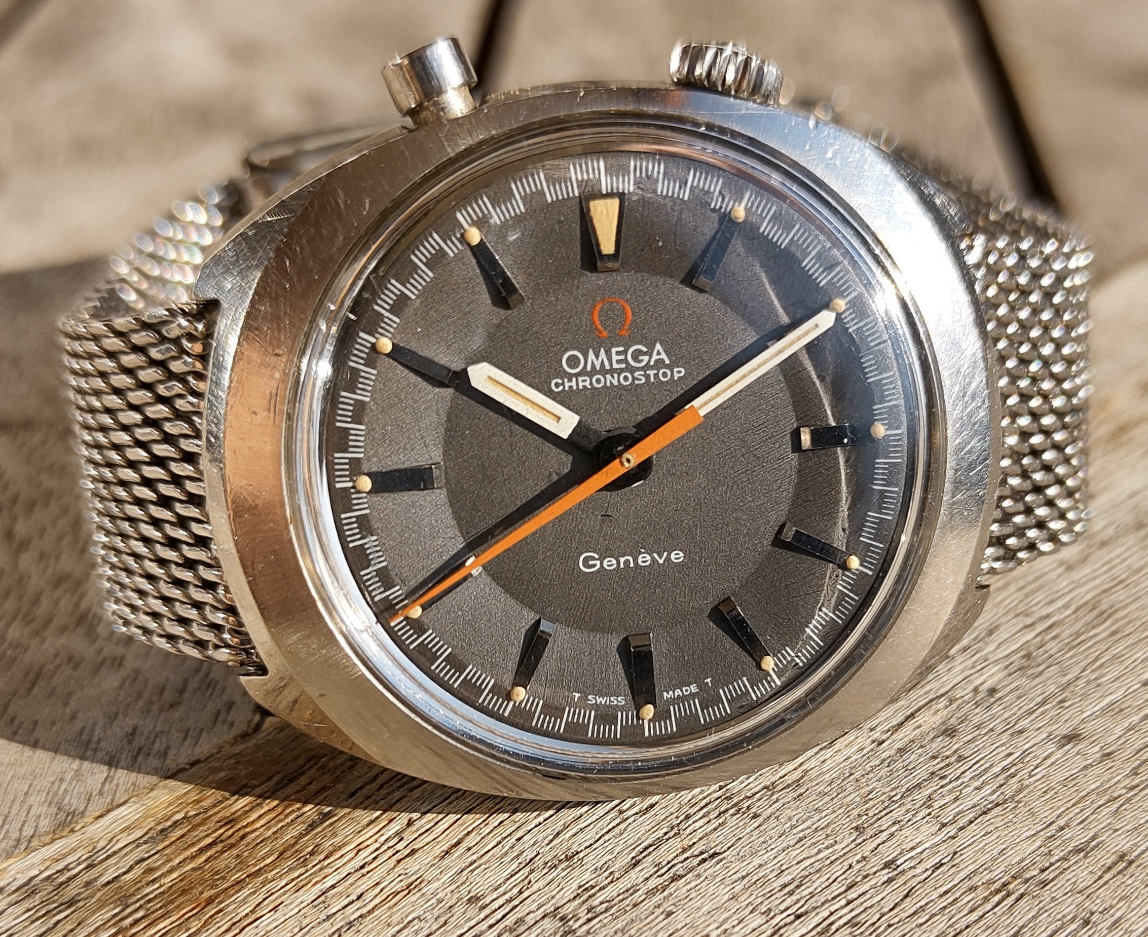For sale is my Chronostop Driver, on its Omega Milanese and funky clasp so you can have your blood group engraved on it if you crash in your Kadett, Escort, or Fulvia (read on...)