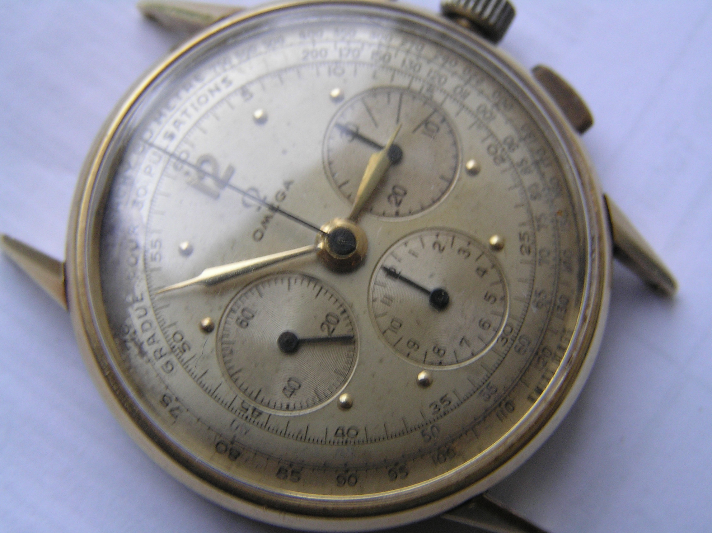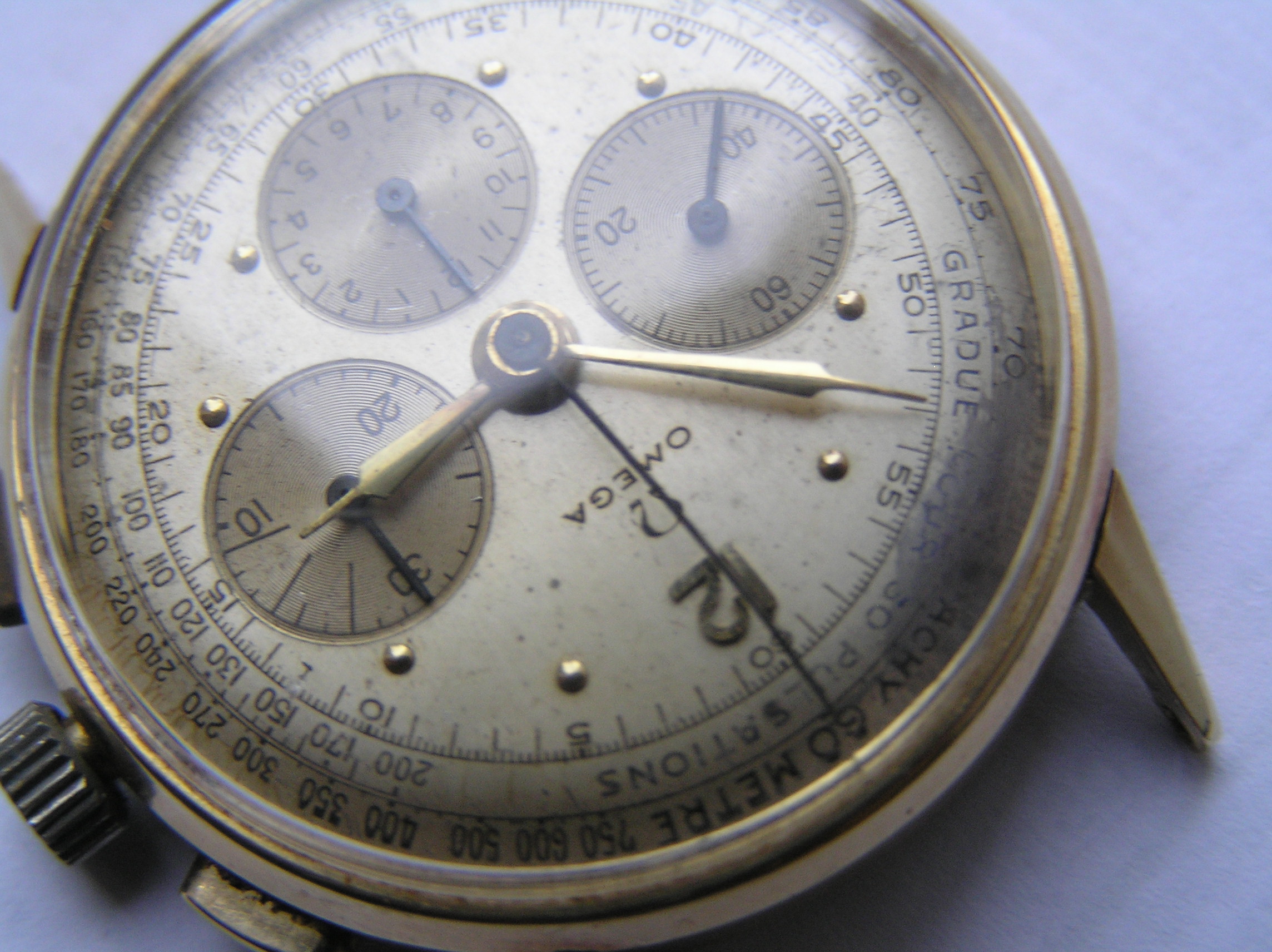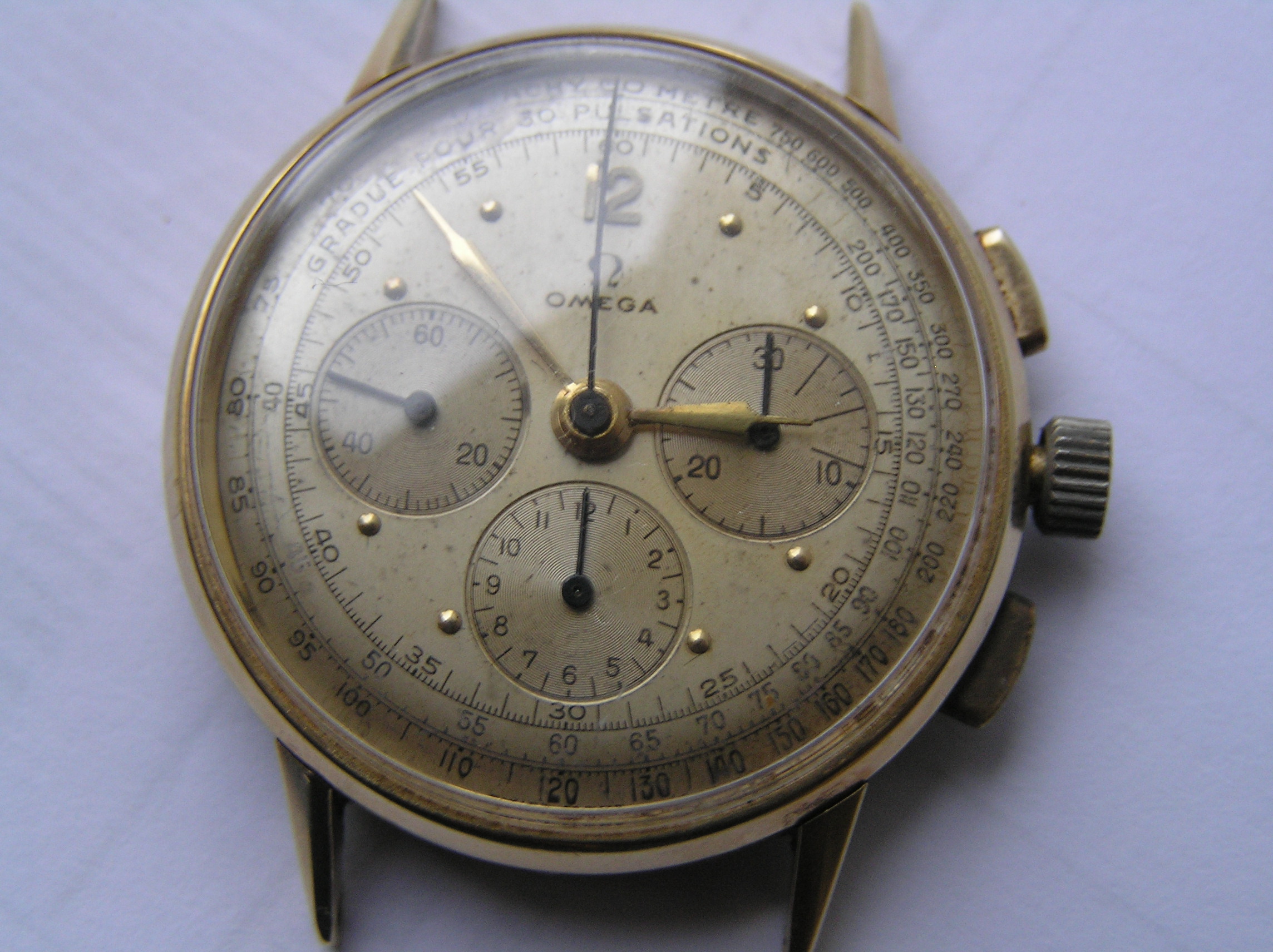 ·hello all. i recently obtain a 14k gold omega watch. cal 27 c12, case ref 10716765 , that shows wear. i was wondering if it is worth restoring. as you can see from the photos , its not perfect , the movement is running well,and keeping good time. but the chrono,s appear to be broken. plus there,s damage to the dial.. would this watch have been made for the french market. as it,s one that i have never seen before. please note that the photos are not sharp, due to the bad lighting as its raining and overcast... any info would help. . thanks again to all......